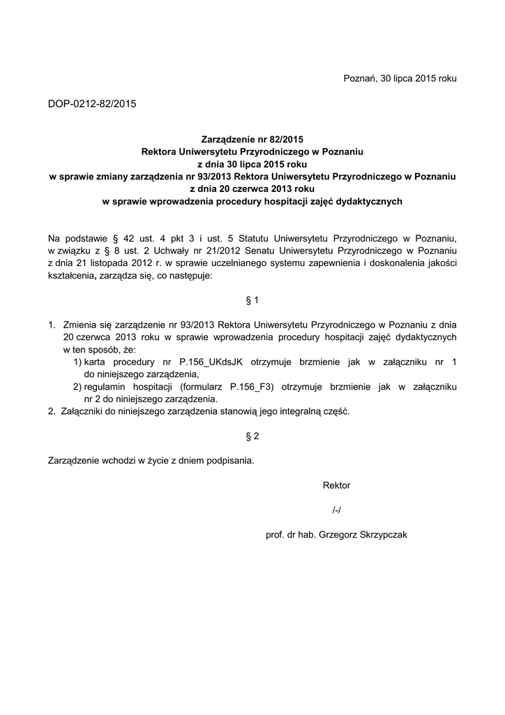 Zarządzenie Rektora nr 82_15 w sprawie zmiany zarządzenia nr