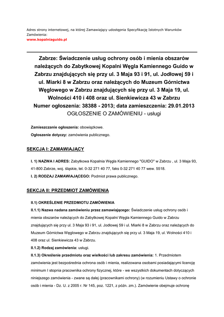Adres strony internetowej, na której Zamawiający udostępnia Specyfikację Istotnych Warunków Zamówienia: www.kopalniaguido.pl Zabrze: Świadczenie usług ochrony osób i mienia obszarów należących do Zabytkowej Kopalni Węgla Kamiennego Guido w Zabrzu znajdujących się przy ul. 3 Maja 93 i 91, ul. Jodłowej 59 i ul. Miarki 8 w Zabrzu oraz należących do Muzeum Górnictwa Węglowego w Zabrzu znajdujących się przy ul. 3 Maja 19, ul. Wolności 410 i 408 oraz ul. Sienkiewicza 43 w Zabrzu Numer ogłoszenia: 38388 - 2013; data zamieszczenia: 29.01.2013 OGŁOSZENIE O ZAMÓWIENIU - usługi Zamieszczanie ogłoszenia: obowiązkowe. Ogłoszenie dotyczy: zamówienia publicznego. SEKCJA I: ZAMAWIAJĄCY I. 1) NAZWA I ADRES: Zabytkowa Kopalnia Węgla Kamiennego "GUIDO" w Zabrzu , ul. 3 Maja 93, 41-800 Zabrze, woj. śląskie, tel. 0-32 271 40 77, faks 0-32 271 40 77 wew. 5518. I. 2) RODZAJ ZAMAWIAJĄCEGO: Podmiot prawa publicznego. SEKCJA II: PRZEDMIOT ZAMÓWIENIA II.1) OKREŚLENIE PRZEDMIOTU ZAMÓWIENIA II.1.1) Nazwa nadana zamówieniu przez zamawiającego: Świadczenie usług ochrony osób i mienia obszarów należących do Zabytkowej Kopalni Węgla Kamiennego Guido w Zabrzu znajdujących się przy ul. 3 Maja 93 i 91, ul. Jodłowej 59 i ul. Miarki 8 w Zabrzu oraz należących do Muzeum Górnictwa Węglowego w Zabrzu znajdujących się przy ul. 3 Maja 19, ul. Wolności 410 i 408 oraz ul. Sienkiewicza 43 w Zabrzu. II.1.2) Rodzaj zamówienia: usługi. II.1.3) Określenie przedmiotu oraz wielkości lub zakresu zamówienia: 1. Przedmiotem zamówienia jest bezpośrednia ochrona osób i mienia, realizowana osobami posiadającymi licencję minimum I stopnia pracownika ochrony fizycznej, które - we wszystkich dokumentach dotyczących niniejszego zamówienia - zwane są dalej (pracownikami ochrony) (w rozumieniu Ustawy o ochronie osób i mienia - Dz. U. z 2005 r. Nr 145, poz. 1221, z późn. zm.). Zamówienie obejmuje ochronę obszarów Zabytkowej Kopalni Węgla Kamiennego Guido w Zabrzu (Zadanie nr 1) oraz Muzeum Górnictwa Węglowego w Zabrzu (Zadanie nr 2) wraz ze znajdującymi się na nich obiektami i urządzeniami w okresie nie wcześniej niż 01.03.2013 r. do 31.05.2014 r., zgodnie z Ustawą o ochronie osób i mienia (Dz.U. z 2005 r. Nr 145, poz. 1221, z późn. zm.), SIWZ, umową i załącznikami. I.Ochrona fizyczna wraz z systemem telewizji przemysłowej (w wybranych obiektach) Zadanie nr 1 - ochrona obszarów Zabytkowej Kopalni Węgla Kamiennego Guido w Zabrzu A. Ochrona obszaru przy ul. 3 Maja 93 wykonywana poprzez: - bezpośrednią ochronę fizyczną - stałą, realizowaną całodobowo (posterunek stały z obchodem), we wszystkie dni tygodnia - w godzinach od 22.00 do 6.00 dwuosobową, pracownik wyposażony w ręczny miotacz gazu (dopuszcza się wyposażenie w miotacz nie wymagający pozwolenia na broń), kajdanki, pałkę wielofunkcyjną typu tonfa, radiotelefon typu nasobnego i latarkę; - zamontowanie na czas realizacji zamówienia, własnego systemu telewizji przemysłowej - wymagany obszar monitorowany wskazany w Załączniku nr 1 (mapa), utrzymanie tego systemu w sprawności oraz wykonywany przez pracownika ochrony obsadzającego posterunek stały dozór sygnałów z tego systemu i natychmiastowe reagowanie na uzyskiwane za jego pomocą informacje, - wykonywany przez pracownika stały dozór systemu przeciwpożarowego i natychmiastowe reagowanie na uzyskane za ich pomocą informacje, - bezpośrednia ochrona doraźna realizowana całodobowo, we wszystkie dni tygodnia, w formie 2 osobowej grupy interwencyjnej. Każdy pracownik ochrony, wchodzący w skład grupy interwencyjnej, wyposażony w uzbrojenie i środki przymusu bezpośredniego tj. broń (w rozumieniu art. 4 ust. 1 pkt. 1, 3, 4c ustawy o broni i amunicji (tekst jednolity Dz. U. z 24 maja 2012 roku, poz. 576), pałkę obronną wielofunkcyjną typu tonfa, kajdanki i latarkę. Grupa ma dysponować środkami łączności radiotelefonicznej i oznakowanym pojazdem. Obowiązki wynikające z ochrony imprez okolicznościowych i kulturalnych organizowanych na obszarze przy ul. 3 Maja 93: 1) Terminy imprez i ilość licencjonowanych pracowników niezbędnych do zabezpieczenia będą podawane z 5 dniowym wyprzedzeniem. 2) Pozostałe warunki w stosunku do pracowników ochrony jak w SIWZ. 3) w tym zakresie Zamawiający dopuszcza udział podwykonawców, pod warunkiem spełnienia wymagań w stosunku dla pracowników ochrony jak dla Wykonawcy m.in.: - zapewnienie ochrony fizycznej pełnionej nieprzerwanie, w czasie trwania imprezy kulturalnej itp. przez pracowników ochrony posiadających licencję pracownika ochrony co najmniej pierwszego stopnia, jednolite, estetyczne ubiory służbowe umożliwiające identyfikację pracownika ochrony oraz zatrudniającej go firmy; - identyfikatory imienne z aktualnymi zdjęciami oraz numerami aktualnej licencji; - niezależna łączność radiotelefoniczna, wyposażeni w przenośny sprzęt niezbędny do skutecznego wykonywania obowiązków, jeżeli przewidziane i dopuszczone prawem. B. Ochrona obszaru przy ul. Jodłowej 59 wykonywana poprzez: - bezpośrednią ochronę fizyczną - stałą, jednoosobową, realizowaną całodobowo (posterunek stały z obchodem obiektu wraz przyległym terenem), we wszystkie dni tygodnia; pracownik wyposażony w ręczny miotacz gazu (dopuszcza się wyposażenie w miotacz nie wymagający pozwolenia na broń), kajdanki, pałkę wielofunkcyjną typu tonfa i latarkę; - wykonywany przez pracownika stały dozór sygnałów z systemu telewizji przemysłowej, systemu alarmowego i systemu przeciwpożarowego i natychmiastowe reagowanie na uzyskane za ich pomocą informacje (systemy te są własnością Zamawiającego, który dokona szkolenia Wykonawcy w zakresie ich działania), - bezpośrednia ochrona doraźna realizowana całodobowo, we wszystkie dni tygodnia, w formie 2 osobowej grupy interwencyjnej. Każdy pracownik ochrony, wchodzący w skład grupy interwencyjnej, wyposażony w u