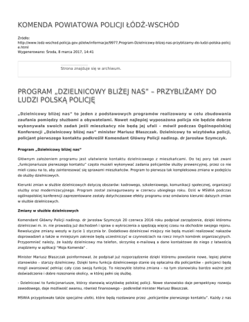 KOMENDA POWIATOWA POLICJI ŁÓDŹ-WSCHÓD Źródło: http://www.lodz-wschod.policja.gov.pl/elw/informacje/9977,Program-Dzielnicowy-blizej-nas-przyblizamy-do-ludzi-polska-policj e.html Wygenerowano: Środa, 8 marca 2017, 14:41 Strona znajduje się w archiwum. PROGRAM „DZIELNICOWY BLIŻEJ NAS” – PRZYBLIŻAMY DO LUDZI POLSKĄ POLICJĘ „Dzielnicowy bliżej nas” to jeden z podstawowych programów realizowany w celu zbudowania zaufania pomiędzy służbami a obywatelami. Nawet najlepiej wyposażona policja nie będzie dobrze wykonywała swoich zadań jeśli mieszkańcy nie będą jej ufali – mówił podczas Ogólnopolskiej Konferencji „Dzielnicowy bliżej nas” minister Mariusz Błaszczak. Dzielnicowy to wizytówka policji, policjant pierwszego kontaktu podkreślił Komendant Główny Policji nadinsp. dr Jarosław Szymczyk. Program „Dzielnicowy bliżej nas” Głównym założeniem programu jest ułatwienie kontaktu dzielnicowego z mieszkańcami. Do tej pory tak zwani „funkcjonariusze pierwszego kontaktu” często musieli wykonywać zadania policjantów służby prewencyjnej, przez co nie mieli czasu na to, aby zainteresować się sprawami mieszkańców. Program to pierwsza tak kompleksowa zmiana w podejściu do służby dzielnicowych. Kierunki zmian w służbie dzielnicowych dotyczą obszarów: kadrowego, szkoleniowego, komunikacji społecznej, organizacji służby oraz modernizacyjnego. Program został zainagurowany w czerwcu ubiegłego roku. Dziś w MSWiA podczas ogólnopolskiej konferencji zaprezentowane zostały dotychczasowe efekty programu oraz omówiono kierunki dalszych zmian w służbie dzielnicowych. Zmiany w służbie dzielnicowych Komendant Główny Policji nadinsp. dr Jarosław Szymczyk 20 czerwca 2016 roku podpisał zarządzenie, dzięki któremu dzielnicowi m. in. nie prowadzą już dochodzeń i spraw o wykroczenia a spędzają więcej czasu na obchodzie swojego rejonu. Rewolucyjne zmiany weszły w życie 1 stycznia br. Dodatkowo dzielnicowi miejscy nie będą musieli realizować nakazów doprowadzeń a także w mniejszym zakresie będą uczestniczyć w czynnościach na rzecz innych komórek organizacyjnych. Przypomnieć należy, że każdy dzielnicowy ma telefon, skrzynkę e-mailową a dane kontaktowe do niego z łatwością znajdziemy w aplikacji "Moja Komenda" . Minister Mariusz Błaszczak poinformował, że podpisał już rozporządzenie dzięki któremu powstanie nowe, lepiej płatne stanowisko – starszy dzielnicowy. Dzięki temu funkcja dzielnicowego stanie się opłacalna dla policjantów – policjanci będą mogli awansować pełniąc cały czas swoją funkcję. To niezwykle istotna zmiana – na tym stanowisku bardzo ważne jest doświadczenie i dobre rozeznanie okolicy, w której pełni się służbę. - Dzielnicowi to funkcjonariusze, którzy stanowią wizytówkę polskiej policji. Nowe stanowisko daje perspektywy rozwoju zawodowego, daje możliwość awansu, również finansowego – podkreślał minister Mariusz Błaszczak. MSWiA przygotowało także specjalne ulotki, które będą rozdawane przez „policjantów pierwszego kontaktu”. Każdy z nas znajdzie w nich dane kontaktowe swojego dzielnicowego oraz opis nowych aplikacji ułatwiających kontakt z policją m.in. „Mojej Komendy” czy „Krajowej Mapy Zagrożeń Bezpieczeństwa”. - Zależy nam, aby dotrzeć również do tych, którzy nie posługują się Internetem. Wszyscy, którzy chcą mieć kontakt z dzielnicowymi muszą mieć taką sposobność. Tutaj chodzi przecież o bezpieczeństwo – stwierdził szef MSWiA. Kolejną zmianą będzie opracowywany przez każdego dzielnicowego plan działania priorytetowego dla rejonu służbowego. Ten tworzony co pół roku harmonogram działań będzie konsultowany z mieszkańcami, dzięki czemu każdy z nas będzie miał wpływ na własne bezpieczeństwo. Więcej policjantów, mniej wakatów Wiceminister Jarosław Zieliński poinformował, że w budżecie na rok 2017 udało się zagwarantować środki na dodatkowych 1000 etatów w polskiej Policji. Przypomniał, że w 2016 roku sukcesywnie trwała redukcja wakatów w tej formacji. - W 2016 roku przyjęliśmy 178 nowych dzielnicowych. To znaczących wzrost, ale wciąż za mały. Policja powinna być blisko obywateli i dla obywateli, a spośród wszystkich policjantów to właśnie dzielnicowi powinni być najbliżej ludzi. Nowe stanowisko – starszy dzielnicowy będzie elementem stabilizującym w ich służbie – podkreślał wiceminister. Nadinsp. Jarosław Szymczyk, Komendant Główny Policji przypomniał, że program „Dzielnicowy bliżej nas” to jedno z działań – obok przywracania posterunków i Krajowej Mapy Zagrożeń Bezpieczeństwa - które mają sprawić, że polska policja będzie bliżej obywateli. Szef polskiej policji przedstawił dane, z których wynika, że liczba etatów wśród dzielnicowych od 2008 systematycznie zmniejszała się. - Dopiero rok 2016 odwraca tę tendencję i liczba dzielnicowych zaczyna się zwiększać, a liczba wakatów topnieje. To kierunek, w którym konsekwentnie będziemy szli w następnych latach – podkreślał nadinsp. Jarosław Szymczyk. Komendant Główny Policji poinformował także, że dzielnicowi biorą udział w specjalistycznych kursach w ramach programu „Dzielnicowy bliżej nas”. Każdy „funkcjonariusz pierwszego kontaktu” posiada już służbowy telefon komórkowy, dostęp do Internetu oraz indywidualną skrzynkę mailową. Nagrody dla dzielnicowych Konferencja była także okazją do nagrodzenia wyróżniających się „funkcjonariuszy pierwszego kontaktu”. Minister Mariusz Błaszczak przyznał nagrody finansowe mł. asp. Marcinowi Bajerowiczowi z Zabrza oraz mł. asp. Damianowi Krupie z Zielonej Góry. Marcin Bajerowicz regularnie odwiedzał mieszkającą samotnie 76-letnią kobietę sprawdzając czy nie potrzebuje pomocy. Podczas jednej z takich wizyt nikt nie otworzył mu drzwi do mieszkania. Dzielnicowy wezwał 