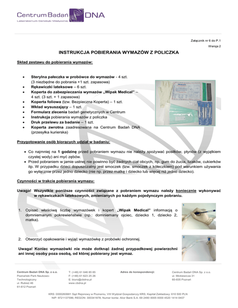 Załącznik nr 6 do P.1 Wersja 2 INSTRUKCJA POBIERANIA WYMAZÓW Z POLICZKA Skład zestawu do pobierania wymazów: Sterylna pałeczka w probówce do wymazów - 4 szt. (3 niezbędne do pobrania +1 szt. zapasowa) Rękawiczki lateksowe – 6 szt. Koperta do zabezpieczania wymazów „Wipak Medical” – 4 szt. (3 szt. + 1 zapasowa) Koperta foliowa (tzw. Bezpieczna Koperta) – 1 szt. Wkład wysuszający – 1 szt. Formularz zlecenia badań genetycznych w Centrum Instrukcja pobierania wymazów z policzka Druk przelewu za badanie – 1 szt. Koperta zwrotna zaadresowana na Centrum Badań DNA (przesyłka kurierska) Przygotowanie osób biorących udział w badaniu: Co najmniej na 1 godzinę przed pobraniem wymazu nie należy spożywać posiłków, płynów (z wyjątkiem czystej wody) ani myć zębów. Przed pobraniem w jamie ustnej nie powinno być żadnych ciał obcych, np. gum do żucia, lizaków, cukierków itp. W przypadku dzieci dopuszczalny jest smoczek (tzw. smoczek z kółeczkiem) pod warunkiem używania go wyłącznie przez jedno dziecko (nie np. przez matkę i dziecko lub więcej niż jedno dziecko). Czynności w trakcie pobierania wymazu: Uwaga! Wszystkie poniższe czynności związane z pobraniem wymazu należy koniecznie wykonywać w rękawiczkach lateksowych, zmienianych po każdym pojedynczym pobraniu. 1. Opisać właściwą liczbę wymazówek i kopert „Wipak Medical” informacją o domniemanym pokrewieństwie (np.: domniemany ojciec, dziecko 1, dziecko 2, matka). 2. Otworzyć opakowanie i wyjąć wymazówkę z probówki ochronnej. Uwaga! Koniec wymazówki nie może dotknąć żadnej przypadkowej powierzchni ani innej osoby poza osobą, od której pobierany jest wymaz. Centrum Badań DNA Sp. z o.o. Poznański Park NaukowoTechnologiczny ul. Rubież 46 61-612 Poznań T: (+48) 61 646 85 85 F: (+48) 61 623 25 26 E: [email protected] www.cbdna.pl Adres do korespondencji: Centrum Badań DNA Sp. z o.o. ul. Mickiewicza 31 60-835 Poznań KRS: 0000260681 Sąd Rejonowy w Poznaniu, VIII Wydział Gospodarczy KRS; Kapitał Zakładowy: 610 500 PLN NIP: 9721137596; REGON: 300341878; Numer konta: Alior Bank S.A. 69 2490 0005 0000 4520 1414 0407 3. Wymaz pobrać poprzez płynne pocieranie końcem wymazówki obu stron wewnętrznej części policzka. Dokonać pobrania wymazu kolejno od wszystkich osób uczestniczących w badaniu. Uwaga! Należy pamiętać, że u dzieci nabłonek jamy ustnej złuszcza się w dużo większym stopniu (dostosowanie siły i czasu pocierania). 4. Po pobraniu wymazu należy niezwłocznie umieścić wymazówkę w opisanej probówce ochronnej 5. Zabezpieczoną wymazówkę należy następnie umieścić w opisanej kopercie „Wipak Medical”. 6. Umieścić wszystkie kopertki „Wipac Medical” z pobranymi uprzednio wymazami w opisanej wcześniej zbiorczej Kopercie Bezpiecznej. 7. Umieścić w kopercie bezpiecznej wkład wysuszający 8. Opisać Kopertę Bezpieczną czytelnie wypełniając poszczególne pola (nadawca, odbiorca, data nadania i podpis nadawcy), a następnie oderwać jeden odcinek kontrolny koperty i zachować go. 9. Opisaną Kopertę Bezpieczną, zawierającą odpowiednio zabezpieczone i opisane wymazówki oraz wypełniony i podpisany przez zleceniodawcę „Formularz zlecenia badań genetycznych” (opatrzony podpisem osoby zlecającej badanie) należy umieścić w zaadresowanej zwrotnie kopercie zbiorczej. Dopuszcza się przechowywanie pobranego w ten sposób materiału w temperaturze pokojowej do 48 godzin przed wysłaniem. Centrum Badań DNA Sp. z o.o. Poznański Park NaukowoTechnologiczny ul. Rubież 46 61-612 Poznań T: (+48) 61 646 85 85 F: (+48) 61 623 25 26 E: [email protected] www.cbdna.pl Adres do korespondencji: Centrum Badań DNA Sp. z o.o. ul. Mickiewicza 31 60-835 Poznań KRS: 0000260681 Sąd Rejonowy w Poznaniu, VIII Wydział Gospodarczy KRS; Kapitał Zakładowy: 610 500 PLN NIP: 9721137596; REGON: 300341878; Numer konta: Alior Bank S.A. 69 2490 0005 0000 4520 1414 0407 Uwaga! Podpis osoby zlecającej (pacjenta) jest niezbędny do przyjęcia zlecenia na wykonanie badań. 10. Dokonać opłaty za zlecane badania zgodnie z cennikiem. Opłaty można dokonać w dowolnym Urzędzie Pocztowym lub oddziale banku na nr konta 69 2490 0005 0000 4520 1414 0407 Honorujemy również wydruki potwierdzenia przelewu wykonanego przez kanał internetowy przesłane pocztą, faksem lub pocztą elektroniczną. III. Wysyłka próbek do badania: Pobrany materiał należy wysłać pocztą kurierską DHL na koszt odbiorcy na adres: NZOZ Laboratorium Genetyki Medycznej Centrum Badań DNA, ul. Mickiewicza 31, 60-835 Poznań W tym celu należy telefonicznie zgłosić odbiór przesyłki kurierskiej bezpośrednio na infolinię pod numerem telefonu 42 6 345 345 oraz uzgodnić czas i miejsce odbioru przesyłki przez kuriera. Podczas zgłoszenia telefonicznego należy powołać się na numer klienta Centrum Badań DNA: 2361973, co jest warunkiem dostarczenia przesyłki na koszt odbiorcy. UWAGA! Prosimy o nadawanie przesyłek kurierskich wyłącznie w wersji DHL Przesyłki krajowe. Centrum nie pokrywa kosztów innych typów przesyłek (np. DHL Domestic 12:00 Express, DHL Domestic 9:00 Express), w takich przypadkach koszt ponosi NADAWCA. Przesyłki należy nadawać od poniedziałku do czwartku. Centrum Badań DNA Sp. z o.o. Poznański Park NaukowoTechnologiczny ul. Rubież 46 61-612 Poznań T: (+48) 61 646 85 85 F: (+48) 61 623 25 26 E: [email protected] www.cbdna.pl Adres do korespondencji: Centrum Badań DNA Sp. z o.o. ul. Mickiewicza 31 60-835 Poznań KRS: 0000260681 Sąd Rejonowy w Poznaniu, VIII Wydział Gospodarczy KRS; Kapitał Zakładowy: 610 500 PLN NIP: 9721137596; REGON: 300341878; Numer konta: Alior Bank S.A. 69 2490 0005 0000 4520 1414 0407