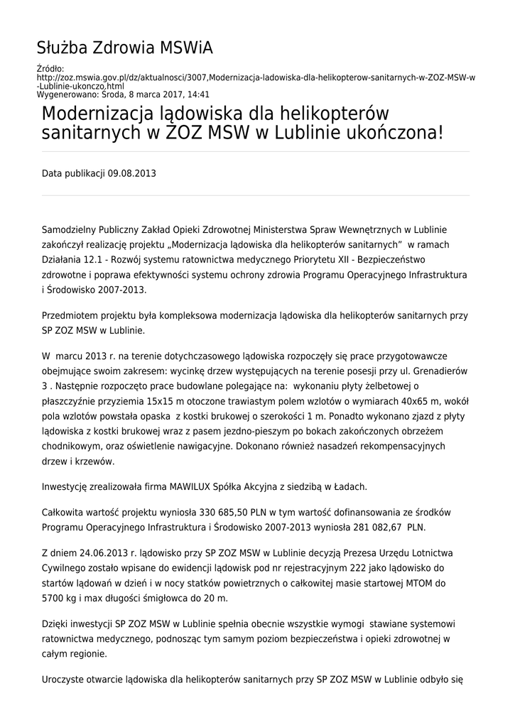 Służba Zdrowia MSWiA Źródło: http://zoz.mswia.gov.pl/dz/aktualnosci/3007,Modernizacja-ladowiska-dla-helikopterow-sanitarnych-w-ZOZ-MSW-w -Lublinie-ukonczo.html Wygenerowano: Środa, 8 marca 2017, 14:41 Modernizacja lądowiska dla helikopterów sanitarnych w ZOZ MSW w Lublinie ukończona! Data publikacji 09.08.2013 Samodzielny Publiczny Zakład Opieki Zdrowotnej Ministerstwa Spraw Wewnętrznych w Lublinie zakończył realizację projektu „Modernizacja lądowiska dla helikopterów sanitarnych” w ramach Działania 12.1 - Rozwój systemu ratownictwa medycznego Priorytetu XII - Bezpieczeństwo zdrowotne i poprawa efektywności systemu ochrony zdrowia Programu Operacyjnego Infrastruktura i Środowisko 2007-2013. Przedmiotem projektu była kompleksowa modernizacja lądowiska dla helikopterów sanitarnych przy SP ZOZ MSW w Lublinie. W marcu 2013 r. na terenie dotychczasowego lądowiska rozpoczęły się prace przygotowawcze obejmujące swoim zakresem: wycinkę drzew występujących na terenie posesji przy ul. Grenadierów 3 . Następnie rozpoczęto prace budowlane polegające na: wykonaniu płyty żelbetowej o płaszczyźnie przyziemia 15x15 m otoczone trawiastym polem wzlotów o wymiarach 40x65 m, wokół pola wzlotów powstała opaska z kostki brukowej o szerokości 1 m. Ponadto wykonano zjazd z płyty lądowiska z kostki brukowej wraz z pasem jezdno-pieszym po bokach zakończonych obrzeżem chodnikowym, oraz oświetlenie nawigacyjne. Dokonano również nasadzeń rekompensacyjnych drzew i krzewów. Inwestycję zrealizowała firma MAWILUX Spółka Akcyjna z siedzibą w Ładach. Całkowita wartość projektu wyniosła 330 685,50 PLN w tym wartość dofinansowania ze środków Programu Operacyjnego Infrastruktura i Środowisko 2007-2013 wyniosła 281 082,67 PLN. Z dniem 24.06.2013 r. lądowisko przy SP ZOZ MSW w Lublinie decyzją Prezesa Urzędu Lotnictwa Cywilnego zostało wpisane do ewidencji lądowisk pod nr rejestracyjnym 222 jako lądowisko do startów lądowań w dzień i w nocy statków powietrznych o całkowitej masie startowej MTOM do 5700 kg i max długości śmigłowca do 20 m. Dzięki inwestycji SP ZOZ MSW w Lublinie spełnia obecnie wszystkie wymogi stawiane systemowi ratownictwa medycznego, podnosząc tym samym poziom bezpieczeństwa i opieki zdrowotnej w całym regionie. Uroczyste otwarcie lądowiska dla helikopterów sanitarnych przy SP ZOZ MSW w Lublinie odbyło się dziś (09 sierpnia 2013 r.) o godz. 12.00.