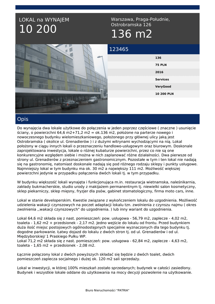 LOKAL na WYNAJEM 10 200 Warszawa, Praga-Południe, Ostrobramska 126 136 m2 123465 136 75 PLN 2016 Services VeryGood 10 200 PLN Opis Do wynajęcia dwa lokale użytkowe do połączenia w jeden poprzez częściowe ( znaczne ) usunięcie ściany, o powierzchni 64,6 m2+71,2 m2 = ok.136 m2, położone na parterze nowego i nowoczesnego budynku wielomieszkaniowego, położonego przy głównej ulicy jaką jest Ostrobramska ( okolice ul. Grenadierów ) i z dużymi witrynami wychodzącymi na nią. Lokal położony w ciągu innych lokali o przeznaczeniu handlowo-usługowym oraz biurowym. Doskonale zaprojektowana inwestycja, lokale o różnej kubaturze powierzchni, przez co nie są one konkurencyjne względem siebie i można w nich zaplanować różne działalności. Dwa pierwsze od strony ul. Grenadierów z przeznaczeniem gastronomicznym. Pozostałe w tym i ten lokal nie nadają się na gastronomię, natomiast doskonale nadają się pod różnego rodzaju sklepy i punkty usługowe. Najmniejszy lokal w tym budynku ma ok. 30 m2 a największy 111 m2. Możliwość większej powierzchni jedynie w przypadku połączenia dwóch lokali tj. w tym przypadku. W budynku większość lokali wynajęta i funkcjonująca m.in. restauracja wietnamska, naleśnikarnia, zakłady bukmacherskie, studio urody z makijażem permanentnym tj. niewielki salon kosmetyczny, sklep piekarniczy, sklep mięsny, fryzjer dla psów, gabinet stomatologiczny, firma moto cars, inne. Lokal w stanie developerskim. Kwestie związane z wykończeniem lokalu do uzgodnienia. Możliwość udzielenia wakacji czynszowych na poczet adaptacji lokalu tzn. zwolnienia z czynszu najmu ( okres zwolnienia ,,wakacji czynszowych" do uzgodnienia. ) lub inny wariant do uzgodnienia. Lokal 64,6 m2 składa się z nast. pomieszczeń: pow. usługowa - 56,79 m2, zaplecze - 4,02 m2, toaleta - 1,62 m2 + przedsionek - 2,17 m2. Jedno wejście do lokalu od frontu. Przed budynkiem duża ilość miejsc postojowych ogólnodostępnych specjalnie wyznaczonych dla tego budynku tj. dogodne parkowanie. Łatwy dojazd do lokalu z dwóch stron tj. od ul. Grenadierów i od ul. Międzyborskiej/ 1 Praskiego Pułku WP. Lokal 71,2 m2 składa się z nast. pomieszczeń: pow. usługowa - 62,84 m2, zaplecze - 4,63 m2, toaleta - 1,65 m2 + przedsionek - 2,08 m2. Łącznie połączony lokal z dwóch powyższych składać się będzie z dwóch toalet, dwóch pomieszczeń zaplecza socjalnego i dużej ok. 120 m2 sali sprzedaży. Lokal w inwestycji, w której 100% mieszkań zostało sprzedanych; budynek w całości zasiedlony. Budynek i wszystkie lokale oddane do użytkowania na mocy decyzji pozwolenie na użytkowanie. Biuro Nieruchomości "PATRIA" Okolica gęsto zaludniona budownictwem mieszkaniowym. Po drugiej stronie ul. Ostrobramskiej oprócz osiedli mieszkaniowych zakłady ,,Rawar". Ruchliwa ulica, blisko przystanki komunikacji miejskiej. Lokal wysoki, w garażu podziemnym specjalnie wyznaczone miejsce pod umieszczenie klimatyzatora. Budynek o bardzo ładnej, reprezentatywnej elewacji. Wejścia do lokali od strony ul.Ostrobramskiej. Do ceny najmu należy doliczyć opłaty specyfikowane przez Administratora, które będą ujęte w jednej fakturze zbiorczej np. zaliczki na ciepłą wodę i zimną, c.o., wywóz nieczystości itp. + prąd ( najemca zawiera bezpośrednio umowę z wybranym przez Siebie operatorem/dostawcą energii elektrycznej ) oraz podatek vat w wysokości 23%. Rzuty lokali i dokumentacja techniczna dostępna u Pośrednika Wyłącznego. Biuro Nieruchomości "PATRIA" tel. 91 4886426, 91 4886427, 507 124 122 email: [email protected] Biuro Nieruchomości "PATRIA" Powered by TCPDF (www.tcpdf.org)