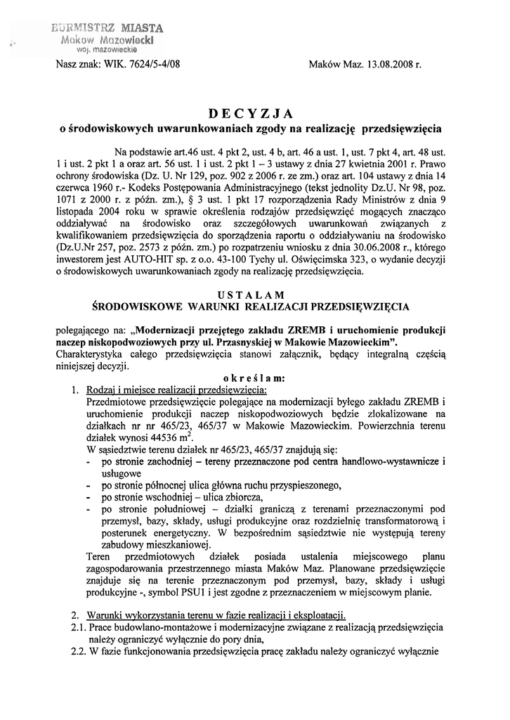 Nasz znak: WIK. 762415-4108 Makow Maz. 13.08.2008 r. DECYZJA o Brodowiskowych uwarunkowaniach zgody na realizacje przedsiewziecia Na podstawie art.46 ust. 4 pkt 2, ust. 4 b, art. 46 a ust. 1, ust. 7 pkt 4, art. 48 ust. 1 i ust. 2 pkt 1 a oraz art. 56 ust. 1 i ust. 2 pkt 1 - 3 ustawy z dnia 27 kwietnia 2001 r. Prawo ochrony Srodowiska (Dz. U. Nr 129, poz. 902 z 2006 r. ze zm.) oraz art. 104 ustawy z dnia 14 czenvca 1960 r.- Kodeks Postqpowania Administracyjnego (tekst jednolity Dz.U. Nr 98, poz. 1071 z 2000 r. z p6in. zm.), 8 3 ust. 1 pkt 17 rozporzqdzenia Rady Ministrow z dnia 9 listopada 2004 roku w sprawie okreSlenia rodzaj6w przedsiqwziqi: mogqcych znaczqco oddzialywai: na Srodowisko oraz szczeg6lowych uwarunkowah zwicpxtnych z kwalifikowaniem przedsiqwziqcia do sporzqdzenia raportu o oddzialywaniu na Srodowisko (Dz.U.Nr 257, poz. 2573 z p6in. zm.) po rozpatrzeniu wniosku z dnia 30.06.2008 r., ktorego inwestorem jest AUTO-HIT sp. z 0.0. 43-100 Tychy ul. OSwiqcimska 323, o wydanie decyzji o Srodowiskowych uwarunkowaniach zgody na realizacjq przedsiqwziqcia. USTALAM SRODOWISKOWE WARUNKI REALIZACJI P R Z E D S I ~ W Z I ~ C I A polegajqcego na: ,,Modernizacji pnejetego zakladu ZREMB i uruchomienie produkcji naczep niskopodwoziowych przy ul. Pnasnyskiej w Makowie Mazowieckim". Charakterystyka calego przedsiqwziqcia stanowi zalqcznik, bqdqcy integralnq czqSciq niniejszej decyzji. okrehlam: 1. Rodzai i mieisce realizacii przedsiewziecia: Przedmiotowe przedsiqwziqcie polegajqce na modernizacji bylego zakladu ZREMB i uruchomienie produkcji naczep niskopodwoziowych bqdzie zlokalizowane na dzialkach nr nr 465123, 465137 w Makowie Mazowieckim. Powierzchnia terenu dzialek wynosi 44536 m2. W spiedztwie terenu dzialek nr 465123,465137 znajdujq sic: - po stronie zachodniej - tereny przeznaczone pod centra handlowo-wystawnicze i uslugowe - po stronie p6lnocnej ulica gl6wna ruchu przyspieszonego, - po stronie wschodniej - ulica zbiorcza, - po stronie poludniowej - dzialki graniczq z terenami przeznaczonymi pod przemysl, bazy, sklady, ushgi produkcyjne oraz rozdzielniq transformatorowq i posterunek energetyczny. W bezpoirednim sqsiedztwie nie wystqpujq tereny zabudowy mieszkaniowej . Teren przedmiotowych dzialek posiada ustalenia miejscowego planu zagospodarowania przestrzennego miasta Mak6w Maz. Planowane przedsiqwziqcie znajduje siq na terenie przeznaczonym pod przemysl, bazy, sklady i uslugi produkcyjne -,symbol PSUl i jest zgodne z przeznaczeniem w miejscowym planie. 2. Warunki wvkorzvstania terenu w fazie realizacii i eksploatacii. z realizacjq przedsiqwziqcia 2.1. Prace budowlano-montaiowe i modernizacyjne zwi-ne naleiy ograniczyi: wylqcznie do pory dnia, 2.2. W fazie funkcjonowania przedsiqwziqcia pracq zakladu naleiy ograniczyk wylqcznie do pory dnia, 2.3. ProwadziC prace w sposbb, kt6ry nie spowoduje zanieczyszczenia gruntu i w6d gruntowych, 2.4. Woda do cel6w sanitarnych, bytowych oraz technologicznych bqdzie pobierana z sieci miejskiej . 2.5. Odpady powstajqce w trakcie tnvania robot, stanowiqce przede wszystkim elementy uiywanych materialbw, po stwierdzeniu ich nieprzydatnodci do dalszego wykorzystania powinny by6 gromadzone selektywnie i wywoione na skladowisko odpad6w. Odpady komunalne powstajqce w trakcie tnvania budowy i prac adaptacyjnych naleiy gromadzid w pojemnikach na odpady komunalne i zapewnid ich wyw6z przez uprawnionq firrnq specjalistycznq. Odpady niebezpieczne: resztki farby na stanowisku malowania naczep w iloSci ok. 50 kglrok, maty filtracyjne ok. 20 kglrok, szlarn z separatpora ropopochodnych ok. 250 kglrok bqdq segregowane i odbierane przez uprawnione firmy na podstawie zawartych um6w. 2.6. Scieki socjalno-bytowe w iloSci max 5,O m3/dobq bqdqodprowadzane do kanalizacji miejskiej. 2.7. ~ c i e ktechnologiczne i w iloSci 0,5 m3/dobq ze stanowiska mycia pojazd6w powinny by6 wstqpnie podczyszczane w osadniku Mota i separatorze ropopochodnych przed wpuszczeniem do kanalizacji miejskiej. Stanowisko ma by6 wyposaione w instalacjq do recyrkulacji wody. 2.8. Wody opadowe z plac6w i miejsc postojowych powinny by6 wstqpnie podczyszczane w osadniku blota i separatorze ropopochodnych przed wpuszczeniem do kanalizacji miejskiej . 2.9. Ziemia powstajqca z wykonywanych wykop6w bqdzie gromadzona na terenie dzialki i po zakonczonych robotach wykorzystana do wypelnienia nier6wnoSci terenu oraz pod utworzenie trawnik6w i zieledcbw na terenie wlasnoSci inwestora. 3. Wmanania dotyczace ochronv Srodowiska do uwzglednienia w proiekcie budowlany: 3.1. Dla potrzeb pracownik6w zakladu naleiy zapewnik niezbqdne pomieszczenia socjalnosanitarne. 3.2. W pomieszczeniach produkcyjnych naleiy zapewniC odpowiedni system wentylacji oraz urzqdzenia gwarantujqce pracq w warunkach nie zagrajajqcych zdrowiu czlowieka. 3.3. Naleiy zastosowaC urzqdzenia o najniiszych mocach akustycznych w celu ograniczenia uci@liwoSci w zakresie haiasu. 3.4. Stosowane do budowy materiaty muszq posiadad wyrnagane przepisami Swiadectwa dopuszczenia do stosowania w budownictwie. w zakresie przeciwdzialania skutkom awarii przemyslowych, w odniesieniu do 4. Wvmogi przedsiewzied zaliczanvch do zaklad6w stwarzaiacvch zagroienie wystapienia powajnych awarii Zaklad powinien by6 wyposajony w zestaw Srodk6w sorpcyjnych do neutralizacji rozlew6w olejowych i farb, niezbqdny sprzqt gainiczy i ratunkowy. 5. Wymogi w zakresie ograniczenia transgranicznego oddziabwania na Srodowisko w odniesieniu do przedsiewzieC, dla kt6rych przeprowadzono postepowanie dotycace transgranicznego oddziahwania na Srodowisko: Ze wzglqdu na lokalizacjq przedmiotowej inwestycji oraz jej oddzialywanie nie wystqpi problem transgranicznego oddzialywania na Srodowisko. 6. W przypadku, o kt6ry-n mowa w art. 135 ust. 1 ustawy z dnia 27 kwietnia 2001 r. Po5 stwierdzenie koniecznoSci utworzenia obszaru oganiczoneno umkowania. Z przedlozonej dokumentacji nie wynika potrzeba utworzenia obszaru ograniczonego uzytkowania. Uzasadnienie W dniu 30.06.2008 r. AUTO-HIT sp. z 0.0.,43-1