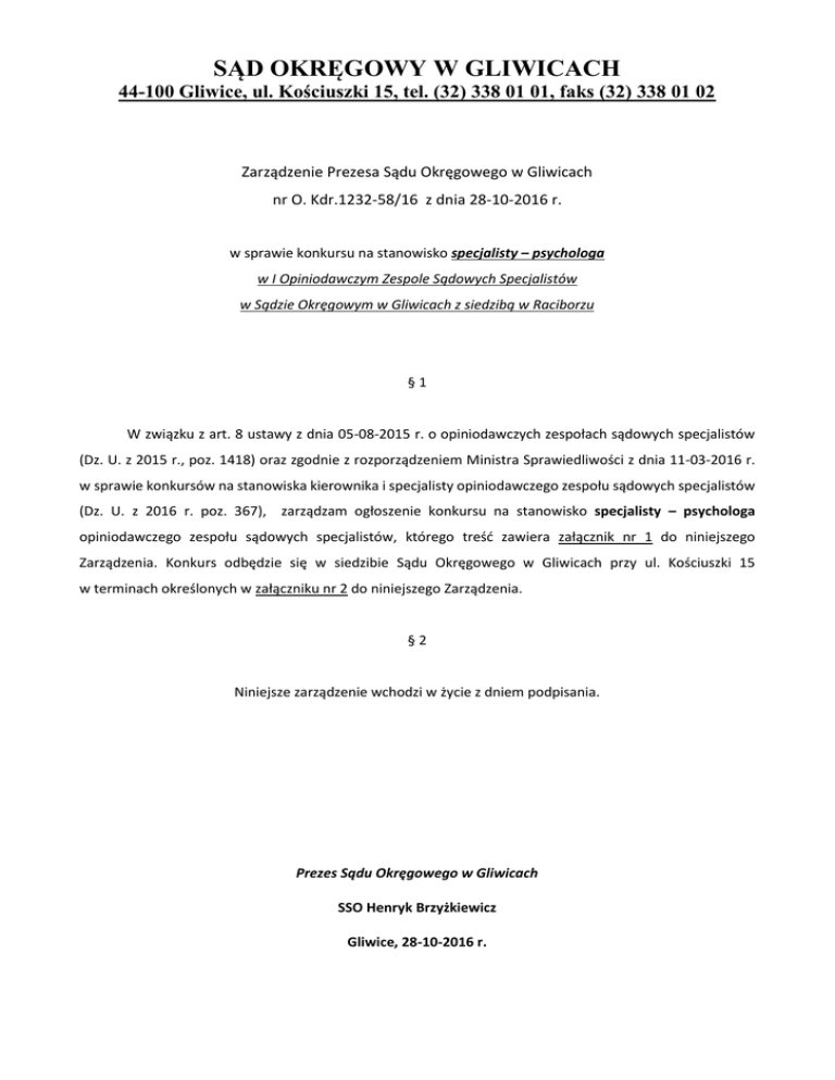 SĄD OKRĘGOWY W GLIWICACH 44-100 Gliwice, ul. Kościuszki 15, tel. (32) 338 01 01, faks (32) 338 01 02 Zarządzenie Prezesa Sądu Okręgowego w Gliwicach nr O. Kdr.1232-58/16 z dnia 28-10-2016 r. w sprawie konkursu na stanowisko specjalisty – psychologa w I Opiniodawczym Zespole Sądowych Specjalistów w Sądzie Okręgowym w Gliwicach z siedzibą w Raciborzu §1 W związku z art. 8 ustawy z dnia 05-08-2015 r. o opiniodawczych zespołach sądowych specjalistów (Dz. U. z 2015 r., poz. 1418) oraz zgodnie z rozporządzeniem Ministra Sprawiedliwości z dnia 11-03-2016 r. w sprawie konkursów na stanowiska kierownika i specjalisty opiniodawczego zespołu sądowych specjalistów (Dz. U. z 2016 r. poz. 367), zarządzam ogłoszenie konkursu na stanowisko specjalisty – psychologa opiniodawczego zespołu sądowych specjalistów, którego treść zawiera załącznik nr 1 do niniejszego Zarządzenia. Konkurs odbędzie się w siedzibie Sądu Okręgowego w Gliwicach przy ul. Kościuszki 15 w terminach określonych w załączniku nr 2 do niniejszego Zarządzenia. §2 Niniejsze zarządzenie wchodzi w życie z dniem podpisania. Prezes Sądu Okręgowego w Gliwicach SSO Henryk Brzyżkiewicz Gliwice, 28-10-2016 r. Załącznik nr 1 do Zarządzenia Prezesa Sądu Okręgowego w Gliwicach nr 1232-58/16 z dnia 28-10-2016 r. Prezes Sądu Okręgowego w Gliwicach ogłasza konkurs nr 1232-58/16 na 1 stanowisko specjalisty – psychologa w I Opiniodawczym Zespole Sądowych Specjalistów w niepełnym wymiarze czasu pracy – maksymalnie 0,5 etatu. Wymagania konieczne: 1) pełna zdolność do czynności prawnych; 2) obywatelstwo polskie, obywatelstwo innego państwa członkowskiego UE, państwa członkowskiego Europejskiego Porozumienia o Wolnym Handlu (EFTA) – stron umowy o Europejskim Obszarze Gospodarczym lub Konfederacji Szwajcarskiej albo obywatelem innego państwa, jeżeli na podstawie przepisów prawa Unii Europejskiej przysługuje prawo podjęcia zatrudnienia lub samozatrudnienia na terytorium Rzeczypospolitej Polskiej na zasadach określonych w tych przepisach; 3) nieposzlakowana opinia; 4) specjalistą zespołu może zostać osoba, która nie została skazana prawomocnym wyrokiem za przestępstwo ścigane z oskarżenia publicznego lub przestępstwo skarbowe; 5) specjalistą zespołu może zostać osoba, przeciwko której nie jest prowadzone postepowanie o przestępstwo ścigane z oskarżenia publicznego lub przestępstwo skarbowe; 6) stan zdrowia pozwalający na zatrudnienie na stanowisku specjalisty; 7) ukończenie studiów wyższych z zakresu psychologii w Rzeczypospolitej Polskiej i uzyskanie tytułu zawodowego magistra lub ukończenie zagranicznych studiów z zakresu psychologii uznanych w Rzeczypospolitej Polskiej. Pisemne oferty powinny zawierać: 1) wniosek o zatrudnienie na stanowisko, na które przeprowadzany jest konkurs; 2) życiorys i informację o przebiegu kariery zawodowej; 3) oryginały lub urzędowo poświadczone odpisy dokumentów potwierdzających ukończenie studiów wyższych z zakresu psychologii i co najmniej 3 letniego stażu pracy w poradnictwie rodzinnym lub z młodzieżą społecznie niedostosowaną albo 3 letnią praktykę kliniczną ; 4) oświadczenie kandydata, że jest obywatelem RP, obywatelem innego państwa członkowskiego UE, państwa członkowskiego Europejskiego Porozumienia o Wolnym Handlu (EFTA) – stron umowy o Europejskim Obszarze Gospodarczym lub Konfederacji Szwajcarskiej albo obywatelem innego państwa, jeżeli na podstawie przepisów prawa Unii Europejskiej przysługuje prawo podjęcia zatrudnienia lub samozatrudnienia na terytorium Rzeczypospolitej Polskiej na zasadach określonych w tych przepisach; 5) oświadczenie kandydata, że ma pełną zdolność do czynności prawnych; 6) oświadczenie kandydata, że nie został skazany prawomocnym wyrokiem za przestępstwo ścigane z oskarżenia publicznego lub przestępstwo skarbowe oraz że nie jest przeciwko niemu prowadzone postępowanie o przestępstwo ścigane z oskarżenia publicznego lub przestępstwo skarbowe; 7) zaświadczenie o stanie zdrowia pozwalającym na zatrudnienie na stanowisku, na które jest przeprowadzany konkurs, wydane przez lekarza uprawnionego do przeprowadzenia wstępnych, okresowych i kontrolnych badań lekarskich pracowników na podstawie wyników badania lekarskiego przeprowadzonego przy uwzględnieniu tego, że na stanowisku specjalisty występują zagrożenia wynikające z pracy na stanowiskach decyzyjnych i związanych z odpowiedzialnością, oraz obejmującego, jeśli lekarz przeprowadzający badanie uzna to za niezbędne do prawidłowej oceny stanu zdrowia, skorzystanie z konsultacji psychologicznej; 8) kwestionariusz osobowy dla osoby ubiegającej się o zatrudnienie. Do zgłoszenia kandydat może dołączyć dokumenty potwierdzające dodatkowe kwalifikacje i osiągnięcia. Oświadczenia winny być podpisane własnoręcznie przez kandydata. Wzory oświadczeń i kwestionariusza dostępne są w Oddziale Kadr oraz na stronie www.gliwice.so.gov.pl. Kompletne oferty z podaniem oznaczenia konkursu należy składać w nieprzekraczalnym terminie do 24-11-2016 r. w Oddziale Kadr Sądu Okręgowego w Gliwicach w pok. 227 lub przesłać za pośrednictwem operatora pocztowego (decyduje data stempla pocztowego) na adres: Sąd Okręgowy w Gliwicach Oddział Kadr ul. Kościuszki 15, 44-100 Gliwice. Dodatkowe informacje dotyczące ogłoszonego konkursu na stanowisko specjalisty opiniodawczego zespołu sądowych specjalistów w tut. Sądzie można uzyskać telefonicznie – (32) 338 00 60 i (32) 338 00 62. Prezes Sądu Okręgowego w Gliwicach SSO Henryk Brzyżkiewicz Gliwice, 28-10-2016 r. Załącznik nr 2 do Zarządzenia Prezesa Sądu Okręgowego w Gliwicach nr 1232-58/16 z dnia 28-10-2016 r. Konkurs składa się z trzech etapów: - I etap konkursu - weryfikacja zgłoszeń kandydatów pod kątem spełnienia wymogów formalnych przystąpienia do konkursu. Komisja Konkursowa ustala listę kandydat