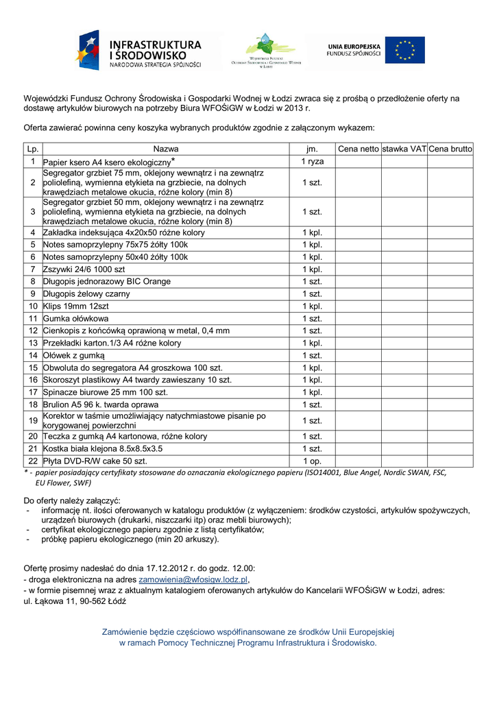 Wojewódzki Fundusz Ochrony Środowiska i Gospodarki Wodnej w Łodzi zwraca się z prośbą o przedłożenie oferty na dostawę artykułów biurowych na potrzeby Biura WFOŚiGW w Łodzi w 2013 r. Oferta zawierać powinna ceny koszyka wybranych produktów zgodnie z załączonym wykazem: Lp. Nazwa jm. Cena netto stawka VAT Cena brutto 1 Papier ksero A4 ksero ekologiczny* 1 ryza Segregator grzbiet 75 mm, oklejony wewnątrz i na zewnątrz 2 poliolefiną, wymienna etykieta na grzbiecie, na dolnych 1 szt. krawędziach metalowe okucia, różne kolory (min 8) Segregator grzbiet 50 mm, oklejony wewnątrz i na zewnątrz 3 poliolefiną, wymienna etykieta na grzbiecie, na dolnych 1 szt. krawędziach metalowe okucia, różne kolory (min 8) 4 Zakładka indeksująca 4x20x50 różne kolory 1 kpl. 5 Notes samoprzylepny 75x75 żółty 100k 1 kpl. 6 Notes samoprzylepny 50x40 żółty 100k 1 kpl. 7 Zszywki 24/6 1000 szt 1 kpl. 8 Długopis jednorazowy BIC Orange 1 szt. 9 Długopis żelowy czarny 1 szt. 10 Klips 19mm 12szt 1 kpl. 11 Gumka ołówkowa 1 szt. 12 Cienkopis z końcówką oprawioną w metal, 0,4 mm 1 szt. 13 Przekładki karton.1/3 A4 różne kolory 1 kpl. 14 Ołówek z gumką 1 szt. 15 Obwoluta do segregatora A4 groszkowa 100 szt. 1 kpl. 16 Skoroszyt plastikowy A4 twardy zawieszany 10 szt. 1 kpl. 17 Spinacze biurowe 25 mm 100 szt. 1 kpl. 18 Brulion A5 96 k. twarda oprawa 1 szt. Korektor w taśmie umożliwiający natychmiastowe pisanie po 19 1 szt. korygowanej powierzchni 20 Teczka z gumką A4 kartonowa, różne kolory 1 szt. 21 Kostka biała klejona 8.5x8.5x3.5 1 szt. 22 Płyta DVD-R/W cake 50 szt. 1 op. * - papier posiadający certyfikaty stosowane do oznaczania ekologicznego papieru (ISO14001, Blue Angel, Nordic SWAN, FSC, EU Flower, SWF) Do oferty należy załączyć: - informację nt. ilości oferowanych w katalogu produktów (z wyłączeniem: środków czystości, artykułów spożywczych, urządzeń biurowych (drukarki, niszczarki itp) oraz mebli biurowych); - certyfikat ekologicznego papieru zgodnie z listą certyfikatów; - próbkę papieru ekologicznego (min 20 arkuszy). Ofertę prosimy nadesłać do dnia 17.12.2012 r. do godz. 12.00: - droga elektroniczna na adres [email protected], - w formie pisemnej wraz z aktualnym katalogiem oferowanych artykułów do Kancelarii WFOŚiGW w Łodzi, adres: ul. Łąkowa 11, 90-562 Łódź Zamówienie będzie częściowo współfinansowane ze środków Unii Europejskiej w ramach Pomocy Technicznej Programu Infrastruktura i Środowisko.