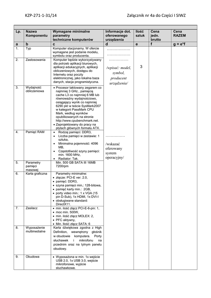 KZP-271-1-31/14 Załącznik nr 4a do Części I SIWZ Lp. Nazwa Komponentu Wymagane minimalne parametry techniczne komputerów Informacje dot. oferowanego urządzenia Ilość sztuk Cena jedn. brutto Cena RAZEM a b c f g = e*f Typ 2. Zastosowania Komputer stacjonarny. W ofercie wymagane jest podanie modelu, symbolu oraz producenta. Komputer będzie wykorzystywany dla potrzeb aplikacji biurowych, aplikacji edukacyjnych, aplikacji obliczeniowych, dostępu do Internetu oraz poczty elektronicznej, jako lokalna baza danych, stacja programistyczna. d ……………… ……………… …………… e 1. 3. Wydajność obliczeniowa 4. Pamięć RAM 5. 6. Parametry pamięci masowej Karta graficzna Procesor taktowany zegarem co najmniej 3 GHz., pamięcią cache L3 co najmniej 6 MB lub równoważny wydajnościowo, osiągający wynik co najmniej 6290 pkt w teście SysMark2007 w kategorii PassMark CPU Mark, według wyników opublikowanych na stronie http://www.cpubenchmark.net. Zaprojektowany do pracy na płytach głównych formatu ATX. Rodzaj pamięci: DDR3, Liczba pamięci w zestawie: 1 sztuka, Minimalna pojemność: 4096 MB, Częstotliwość szyny pamięci: min. 1600 MHz, Radiator: Tak. Min. 500 GB SATA III 16MB 7200rpm Parametry minimalne: złącze: PCI-E ver. 2.0, pamięć: DDR3, szyna pamięci min,: 128-bitowa, pamięć karty min.: 2GB, porty video min.: 1 x VGA (15 pin D-Sub), 1x HDMI, 1x DVI-I obsługiwane standard: DirectX11. min. ilość złącz PCI-E-6-pin: 1, moc min. 500W, min. ilość złącz MOLEX: 2, PFC aktywny, Min. Ilość złącz SATA: 6 Karta dźwiękowa zgodna z High Definition, wewnętrzny głośnik w obudowie komputera. Porty słuchawek i mikrofonu na przednim oraz na tylnym panelu obudowy. 7. Zasilacz 8. Wyposażenie multimedialne 9. Obudowa Wyposażona w min. 1x wejście USB 2.0, 1x USB 3.0, wejście mikrofonowe, wyjście słuchawkowe. /wpisać: model, symbol, producent urządzenia/ …………… /wskazać oferowany system operacyjny/ 3 KZP-271-1-31/14 10. Zgodność z systemami operacyjnymi i standardami 11. BIOS W celu szybkiej weryfikacji usterki w obudowę komputera musi być wbudowany wizualny lub dźwiękowy system diagnostyczny, służący do sygnalizowania i diagnozowania problemów z komputerem i jego komponentami; a w szczególności musi sygnalizować: - awarię BIOS-u, - awarię procesora, - uszkodzenie lub brak pamięci RAM, - uszkodzenie złączy PCI i PCIe, - uszkodzenie kontrolera Video, - uszkodzenie płyty głównej, - uszkodzenie kontrolera USB (Zamawiający dopuszcza zaoferowanie oprogramowania zarządzająco – diagnostycznego dostarczonego przez producenta komputera spełniającego pozostałe wymagania Zamawiającego) Obudowa musi umożliwiać zastosowanie dowolnego zabezpieczenia fizycznego. Oferowane modele komputerów muszą poprawnie współpracować z systemem operacyjnym Windows Pro 7 oraz Windows 8 Pro. BIOS zgodny ze specyfikacją UEFI, Możliwość, bez uruchamiania systemu operacyjnego z dysku twardego komputera lub innych podłączonych do niego urządzeń zewnętrznych odczytania z BIOS informacji o: a/ wersji BIOS, b/ nr seryjnym komputera wraz z datą jego wyprodukowania, c/ ilości i sposobu obłożenia slotów pamięciami RAM, d/ typie procesora wraz z informacją o ilości rdzeni, wielkości pamięci cache L2 i L3, pojemności zainstalowanego dysku twardego e/ rodzajach napędów optycznych, f/ MAC adresie zintegrowanej karty sieciowej, g/ kontrolerze audio. Funkcja blokowania wejścia do BIOS oraz blokowania startu systemu operacyjnego, (gwarantujący utrzymanie zapisanego hasła nawet w przypadku odłączenia wszystkich źródeł zasilania Załącznik nr 4a do Części I SIWZ KZP-271-1-31/14 i podtrzymania BIOS), Funkcja blokowania / odblokowania BOOT-owania stacji roboczej z zewnętrznych urządzeń. Możliwość polegająca na kontrolowaniu urządzeń wykorzystujących magistralę komunikacyjną PCI, bez uruchamiania systemu operacyjnego z dysku twardego komputera lub innych podłączonych do niego urządzeń zewnętrznych. Pod pojęciem kontroli Zamawiający rozumie funkcjonalność polegającą na blokowaniu / odblokowaniu slotów PCI. Możliwość, bez uruchamiania systemu operacyjnego z dysku twardego komputera lub innych, podłączonych do niego urządzeń zewnętrznych, ustawienia hasła na poziomie systemu, administratora oraz dysku twardego oraz możliwość ustawienia następujących zależności pomiędzy nimi: brak możliwości zmiany hasła pozwalającego na uruchomienie systemu bez podania hasła administratora. Musi posiadać możliwość ustawienia zależności pomiędzy hasłem administratora a hasłem systemowy tak, aby nie było możliwe wprowadzenie zmian w BIOS wyłącznie po podaniu hasła systemowego. Funkcja ta ma wymuszać podanie hasła administratora przy próbie zmiany ustawień BIOS w sytuacji, gdy zostało podane hasło systemowe. Możliwość włączenia / wyłączenia zintegrowanej karty dźwiękowej, karty sieciowej, portu równoległego, portu szeregowego z poziomu BIOS, bez uruchamiania systemu operacyjnego z dysku twardego komputera lub innych, podłączonych do niego, urządzeń zewnętrznych. Możliwość ustawienia portów USB w trybie „no BOOT”, czyli podczas startu komputer nie wykrywa urządzeń bootujących typu USB, natomiast po uruchomieniu systemu operacyjnego porty USB są aktywne. Możliwość wyłączania portów USB w tym: wszystkich portów, tylko portów znajdujących się na przodzie obudowy, tylko tylnich portów. Załącznik nr 4a do Części I SIWZ KZP-271-1-31/14 12. Głośność jednostki Obsługa BIOS przy wykorzystaniu klawiatury i mysz Głośność jednostki centralnej mierzona zgodnie z normą ISO 7779 oraz wykazana zgodnie z normą ISO 9296 w pozycji operatora w trybie pracy dysku twardego (WORK) wynosząca maksymalnie 28 dB Określono we wzorze umowy 13. Warunki gwarancji 14. Wsparcie techniczne producenta 15. Wymagania dodatkowe W przypadku awarii dysków twar