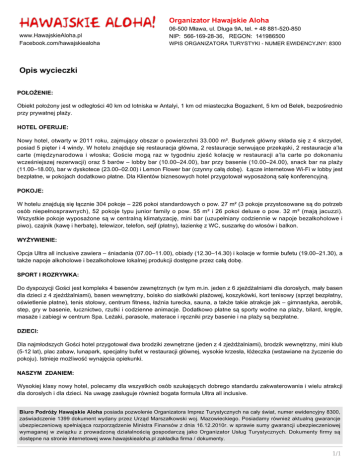 Organizator Hawajskie Aloha www.HawajskieAloha.pl Facebook.com/hawajskiealoha 06-500 Mława, ul. Długa 9A, tel. + 48 881-520-850 NIP: 566-169-28-36, REGON: 141986500 WPIS ORGANIZATORA TURYSTYKI - NUMER EWIDENCYJNY: 8300 Opis wycieczki POŁOŻENIE: Obiekt położony jest w odległości 40 km od lotniska w Antalyi, 1 km od miasteczka Bogazkent, 5 km od Belek, bezpośrednio przy prywatnej plaży. HOTEL OFERUJE: Nowy hotel, otwarty w 2011 roku, zajmujący obszar o powierzchni 33.000 m². Budynek główny składa się z 4 skrzydeł, posiad 5 pięter i 4 windy. W hotelu znajduje się restauracja główna, 2 restauracje serwujące przekąski, 2 restauracje a’la carte (międzynarodowa i włoska; Goście mogą raz w tygodniu zjeść kolację w restauracji a’la carte po dokonaniu wcześniejszej rezerwacji) oraz 5 barów – lobby bar (10.00–24.00), bar przy basenie (10.00–24.00), snack bar na plaży (11.00–18.00), bar w dyskotece (23.00–02.00) i Lemon Flower bar (czynny całą dobę). Łącze internetowe Wi-Fi w lobby jest bezpłatne, w pokojach dodatkowo płatne. Dla Klientów biznesowych hotel przygotował wyposażoną salę konferencyjną. POKOJE: W hotelu znajdują się łącznie 304 pokoje – 226 pokoi standardowych o pow. 27 m² (3 pokoje przystosowane są do potrzeb osób niepełnosprawnych), 52 pokoje typu junior family o pow. 55 m² i 26 pokoi deluxe o pow. 32 m² (mają jacuzzi). Wszystkie pokoje wyposażone są w centralną klimatyzację, mini bar (uzupełniany codziennie w napoje bezalkoholowe i piwo), czajnik (kawę i herbatę), telewizor, telefon, sejf (płatny), łazienkę z WC, suszarkę do włosów i balkon. WYŻYWIENIE: Opcja Ultra all inclusive zawiera – śniadania (07.00–11.00), obiady (12.30–14.30) i kolacje w formie bufetu (19.00–21.30), a także napoje alkoholowe i bezalkoholowe lokalnej produkcji dostępne przez całą dobę. SPORT I ROZRYWKA: Do dyspozycji Gości jest kompleks 4 basenów zewnętrznych (w tym m.in. jeden z 6 zjeżdżalniami dla dorosłych, mały basen dla dzieci z 4 zjeżdżalniami), basen wewnętrzny, boisko do siatkówki plażowej, koszykówki, kort tenisowy (sprzęt bezpłatny, oświetlenie płatne), tenis stołowy, centrum fitness, łaźnia turecka, sauna, a także takie atrakcje jak – gimnastyka, aerobik, step, gry w basenie, łucznictwo, rzutki i codzienne animacje. Dodatkowo płatne są sporty wodne na plaży, bilard, kręgle, masaże i zabiegi w centrum Spa. Leżaki, parasole, materace i ręczniki przy basenie i na plaży są bezpłatne. DZIECI: Dla najmłodszych Gości hotel przygotował dwa brodziki zewnętrzne (jeden z 4 zjeżdżalniami), brodzik wewnętrzny, mini klub (5-12 lat), plac zabaw, lunapark, specjalny bufet w restauracji głównej, wysokie krzesła, łóżeczka (wstawiane na życzenie do pokoju). Istnieje możliwość wynajęcia opiekunki. NASZYM ZDANIEM: Wysokiej klasy nowy hotel, polecamy dla wszystkich osób szukających dobrego standardu zakwaterowania i wielu atrakcji dla dorosłych i dla dzieci. Na uwagę zasługuje również bogata formuła Ultra all inclusive. Biuro Podróży Hawajskie Aloha posiada pozwolenie Organizatora Imprez Turystycznych na cały świat, numer ewidencyjny 8300, zaświadczenie 1399 dokument wydany przez Urząd Marszałkowski woj. Mazowieckiego. Posiadamy również aktualną gwarancje ubezpieczeniową spełniająca rozporządzenie Ministra Finansów z dnia 16.12.2010r. w sprawie sumy gwarancji ubezpieczeniowej wymaganej w związku z prowadzoną działalnością gospodarczą jako Organizator Usług Turystycznych. Dokumenty firmy są dostępne na stronie internetowej www.hawajskiealoha.pl zakładka firma / dokumenty. 1/1