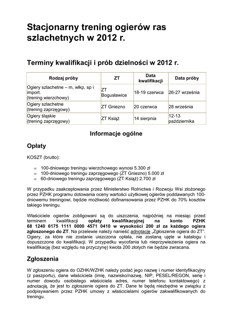 Stacjonarny trening ogierów ras szlachetnych w 2012 r. Terminy kwalifikacji i prób dzielności w 2012 r. Rodzaj próby Data kwalifikacji Data próby ZT Bogusławice 18-19 czerwca 26-27 września ZT Gniezno 20 czerwca 28 września ZT KsiąŜ 14 sierpnia 12-13 października ZT Ogiery szlachetne – m, wlkp, sp i import. (trening wierzchowy) Ogiery szlachetne (trening zaprzęgowy) Ogiery śląskie (trening zaprzęgowy) Informacje ogólne Opłaty KOSZT (brutto): • • • 100-dniowego treningu wierzchowego wynosi 5.300 zł 100-dniowego treningu zaprzęgowego (ZT Gniezno) 5.000 zł 60-dniowego treningu zaprzęgowego (ZT KsiąŜ) 2.700 zł W przypadku zaakceptowania przez Ministerstwo Rolnictwa i Rozwoju Wsi złoŜonego przez PZHK programu dotowania oceny wartości uŜytkowej ogierów poddawanych 100dniowemu treningowi, będzie moŜliwość dofinansowania przez PZHK do 70% kosztów takiego treningu. Właściciele ogierów zobligowani są do uiszczenia, najpóźniej na miesiąc przed terminem kwalifikacji opłaty kwalifikacyjnej na konto PZHK 68 1240 6175 1111 0000 4571 0410 w wysokości 200 zł za kaŜdego ogiera zgłoszonego do ZT. Na przelewie naleŜy nanieść adnotację „Zgłoszenie ogiera do ZT”. Ogiery, za które nie zostanie uiszczona opłata, nie zostaną ujęte w katalogu i dopuszczone do kwalifikacji. W przypadku wycofania lub nieprzywiezienia ogiera na kwalifikację (bez względu na przyczynę) kwota 200 złotych nie będzie zwracana. Zgłoszenia W zgłoszeniu ogiera do OZHK/WZHK naleŜy podać jego nazwę i numer identyfikacyjny (z paszportu), dane właściciela (imię, nazwisko/nazwę, NIP, PESEL/REGON, serię i numer dowodu osobistego właściciela adres, numer telefonu kontaktowego) z adnotacją, Ŝe jest to zgłoszenie ogiera do ZT. Dane te będą niezbędne w związku z podpisywaniem przez PZHK umowy z właścicielami ogierów zakwalifikowanych do treningu. Badania markerów genetycznych Zgłoszone do OZHK/WZHK ogiery MUSZĄ mieć potwierdzone pochodzenie po obojgu rodzicach. Pochodzenie potwierdza się na podstawie badań markerów genetycznych ogiera i jego rodziców. PZHK upowaŜnił do wykonywania badań dwa laboratoria: w Poznaniu i Chorzelowie. Brak badań lub niezgodność pary rodzicielskiej spowoduje, Ŝe ogier nie zostanie ujęty w katalogu PZHK i nie ma prawa przystąpić do kwalifikacji. UWAGA: Laboratorium od momentu uzyskania materiału genetycznego (próbek krwi) potrzebuje 30 dni na wykonanie badania. Ogiery hodowli zagranicznej Ogiery zagraniczne (z właściwych ksiąg stadnych – patrz strona pzhk.pl) muszą zostać zgłoszone do właściwego OZHK/WZHK oraz wpisane do bazy PZHK. NaleŜy pamiętać, iŜ w paszporcie zagranicznym ogiera winien być wpisany polski właściciel, a dokonać tego winien związek rodzimy (czyli zagraniczny), który wydał paszport. W celu zarejestrowania ogiera hodowli zagranicznej w polskiej bazie pracownik odpowiedniego OZHK/WZHK musi zidentyfikować konia, m. in. poprzez porównanie z opisem graficznym w jego paszporcie. Pracownik OZHK/WZHK wykonuje kserokopię stron z paszportu: z datą urodzenia i nazwą, z rodowodem i opisem oraz ze stroną z wpisanym polskim właścicielem i nazwą pod jaką został zarejestrowany koń. JeŜeli dokumenty konia nie zostały wystawione w języku angielskim, francuskim lub niemieckim, właściciel jest zobowiązany przetłumaczyć je u tłumacza przysięgłego i tłumaczenie to wraz z oryginalnym dokumentem hodowlanym dostarczyć do OZHK/WZHK. Zdrowie Ogiery muszą posiadać świadectwo zdrowia wystawione przez lekarza weterynarii oraz paszport konia z wpisanymi szczepieniami przeciwko grypie. Brak szczepień bądź jakiekolwiek nieprawidłowości w schemacie szczepień spowodują niedopuszczenie ogiera do kwalifikacji. Obowiązuje następujący schemat szczepień: 1. szczepienia bazowe: o pierwsze szczepienie – w dniu rozpoczęcia szczepień o drugie szczepienie – nie wcześniej niŜ 21. dnia i nie później niŜ 92. dnia od pierwszego szczepienia 2. szczepienie przypominające: o co 6 miesięcy od ostatniego szczepienia (dopuszczalny jest 21-dniowy okres przekroczenia terminu); o Ŝadne szczepienie przypominające nie moŜe się odbyć później niŜ 7 dni przed przybyciem na kwalifikację. W przypadku wszelkiego rodzaju zmian skórnych, właściciel zobligowany jest przedstawić wynik badania laboratoryjnego z okresu nie wcześniej niŜ dwu tygodni przed kwalifikacją. Brak wyników badań skutkować będzie nie przyjęciem ogiera do ZT. Ogier bez oporów musi podawać wszystkie nogi. W czasie kwalifikacji ogier nie moŜe być pod wpływem środków pobudzających ani uspokajających (doping). Kierownik Zakładu ma prawo do 14 dnia po kwalifikacji wycofać ogiera z treningu, gdy jego zachowanie odbiega od normy. O tym fakcie musi być powiadomiony właściciel (pisemnie) oraz PZHK (pisemnie). Przybywające do ZT ogiery, mimo braku widocznych zmian skórnych, mogą być nosicielami np. grzybicy i pomimo przestrzegania zasad higieny przez organizatora treningu osobniki mniej odporne mogą się nabawić tej choroby i zostać czasowo wycofane z pracy, co odbije się na wyniku próby dzielności. Dlatego zalecamy, aby przybywające na kwalifikacje ogiery zostały uodpornione na tę chorobę za pomocą szczepienia przeciw grzybicy (podobna zasada obowiązuje np. w Niemczech). Uwaga: na kaŜdym etapie kwalifikacji i treningu wykluczone zostaną ogiery, u których stwierdzi się występowanie wad zwrotnych (łykawość, dychawica świszcząca, wartogłowienie, ślepota miesięczna) oraz wad uniemoŜliwiających wpis do księgi (obustronna ślepota, nieprawidłowa budowa szczęki – zgryz karpiowaty lub zgryz szczupaczy, jedno- lub obustronne wnętrostwo, szpat kostny, zajęczak oraz poraŜenie krtani). Powtórny trening: Ogier, który: • • • • zostanie wycofany z ZT z powodu kontuzji, zostanie wycofany przez właściciela przed końcem treningu, nie zda próby dzielności (ocena