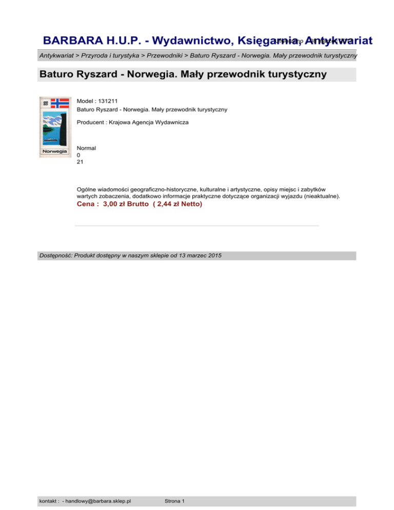 Utworzono Antykwariat : 08 marzec 2017 BARBARA H.U.P. - Wydawnictwo, Księgarnia, Antykwariat > Przyroda i turystyka > Przewodniki > Baturo Ryszard - Norwegia. Mały przewodnik turystyczny Baturo Ryszard - Norwegia. Mały przewodnik turystyczny Model : 131211 Baturo Ryszard - Norwegia. Mały przewodnik turystyczny Producent : Krajowa Agencja Wydawnicza Normal 0 21 Ogólne wiadomości geograficzno-historyczne, kulturalne i artystyczne, opisy miejsc i zabytków wartych zobaczenia, dodatkowo informacje praktyczne dotyczące organizacji wyjazdu (nieaktualne). Cena : 3,00 zł Brutto ( 2,44 zł Netto) Dostępność: Produkt dostępny w naszym sklepie od 13 marzec 2015 kontakt : - [email protected] Strona 1