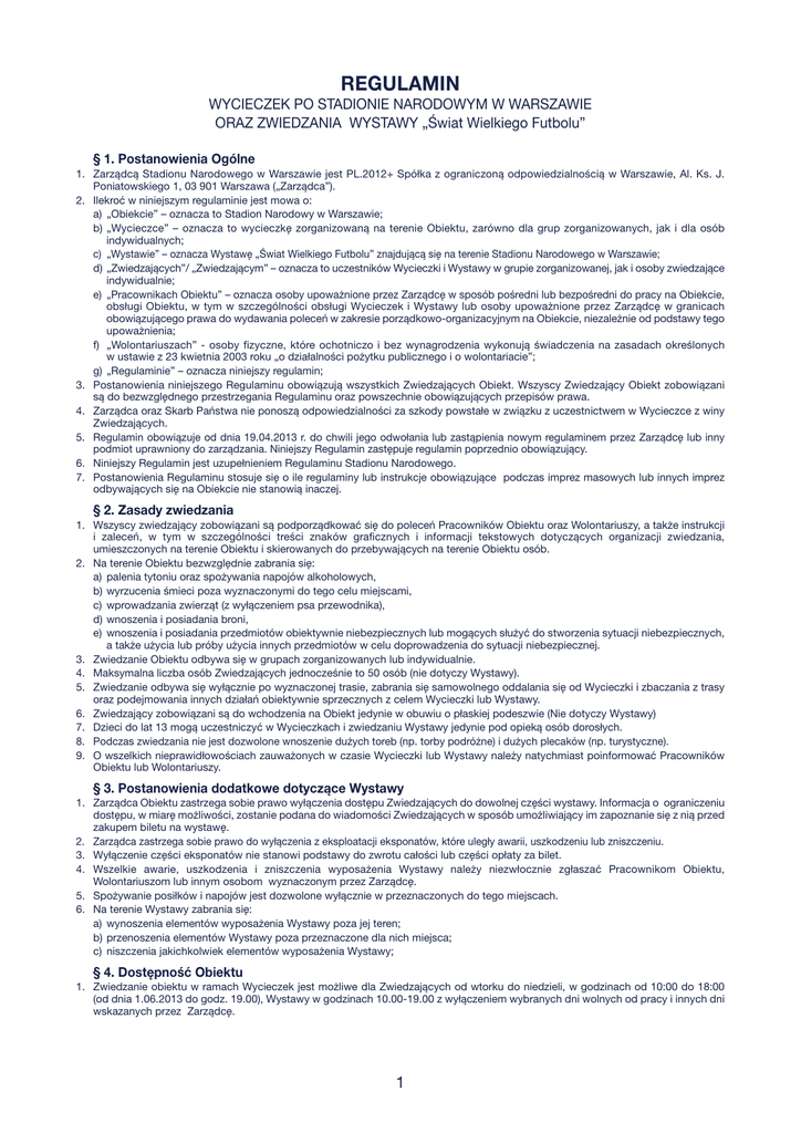 REGULAMIN WYCIECZEK PO STADIONIE NARODOWYM W WARSZAWIE ORAZ ZWIEDZANIA WYSTAWY „Świat Wielkiego Futbolu” § 1. Postanowienia Ogólne 1. Zarządcą Stadionu Narodowego w Warszawie jest PL.2012+ Spółka z ograniczoną odpowiedzialnością w Warszawie, Al. Ks. J. Poniatowskiego 1, 03 901 Warszawa („Zarządca”). 2. Ilekroć w niniejszym regulaminie jest mowa o: a) „Obiekcie” – oznacza to Stadion Narodowy w Warszawie; b) „Wycieczce” – oznacza to wycieczkę zorganizowaną na terenie Obiektu, zarówno dla grup zorganizowanych, jak i dla osób indywidualnych; c) „Wystawie” – oznacza Wystawę „Świat Wielkiego Futbolu” znajdującą się na terenie Stadionu Narodowego w Warszawie; d) „Zwiedzających”/ „Zwiedzającym” – oznacza to uczestników Wycieczki i Wystawy w grupie zorganizowanej, jak i osoby zwiedzające indywidualnie; e) „Pracownikach Obiektu” – oznacza osoby upoważnione przez Zarządcę w sposób pośredni lub bezpośredni do pracy na Obiekcie, obsługi Obiektu, w tym w szczególności obsługi Wycieczek i Wystawy lub osoby upoważnione przez Zarządcę w granicach obowiązującego prawa do wydawania poleceń w zakresie porządkowo-organizacyjnym na Obiekcie, niezależnie od podstawy tego upoważnienia; f) „Wolontariuszach” - osoby fizyczne, które ochotniczo i bez wynagrodzenia wykonują świadczenia na zasadach określonych w ustawie z 23 kwietnia 2003 roku „o działalności pożytku publicznego i o wolontariacie”; g) „Regulaminie” – oznacza niniejszy regulamin; 3. Postanowienia niniejszego Regulaminu obowiązują wszystkich Zwiedzających Obiekt. Wszyscy Zwiedzający Obiekt zobowiązani są do bezwzględnego przestrzegania Regulaminu oraz powszechnie obowiązujących przepisów prawa. 4. Zarządca oraz Skarb Państwa nie ponoszą odpowiedzialności za szkody powstałe w związku z uczestnictwem w Wycieczce z winy Zwiedzających. 5. Regulamin obowiązuje od dnia 19.04.2013 r. do chwili jego odwołania lub zastąpienia nowym regulaminem przez Zarządcę lub inny podmiot uprawniony do zarządzania. Niniejszy Regulamin zastępuje regulamin poprzednio obowiązujący. 6. Niniejszy Regulamin jest uzupełnieniem Regulaminu Stadionu Narodowego. 7. Postanowienia Regulaminu stosuje się o ile regulaminy lub instrukcje obowiązujące podczas imprez masowych lub innych imprez odbywających się na Obiekcie nie stanowią inaczej. § 2. Zasady zwiedzania 1. Wszyscy zwiedzający zobowiązani są podporządkować się do poleceń Pracowników Obiektu oraz Wolontariuszy, a także instrukcji i zaleceń, w tym w szczególności treści znaków graficznych i informacji tekstowych dotyczących organizacji zwiedzania, umieszczonych na terenie Obiektu i skierowanych do przebywających na terenie Obiektu osób. 2. Na terenie Obiektu bezwzględnie zabrania się: a) palenia tytoniu oraz spożywania napojów alkoholowych, b) wyrzucenia śmieci poza wyznaczonymi do tego celu miejscami, c) wprowadzania zwierząt (z wyłączeniem psa przewodnika), d) wnoszenia i posiadania broni, e) wnoszenia i posiadania przedmiotów obiektywnie niebezpiecznych lub mogących służyć do stworzenia sytuacji niebezpiecznych, a także użycia lub próby użycia innych przedmiotów w celu doprowadzenia do sytuacji niebezpiecznej. 3. Zwiedzanie Obiektu odbywa się w grupach zorganizowanych lub indywidualnie. 4. Maksymalna liczba osób Zwiedzających jednocześnie to 50 osób (nie dotyczy Wystawy). 5. Zwiedzanie odbywa się wyłącznie po wyznaczonej trasie, zabrania się samowolnego oddalania się od Wycieczki i zbaczania z trasy oraz podejmowania innych działań obiektywnie sprzecznych z celem Wycieczki lub Wystawy. 6. Zwiedzający zobowiązani są do wchodzenia na Obiekt jedynie w obuwiu o płaskiej podeszwie (Nie dotyczy Wystawy) 7. Dzieci do lat 13 mogą uczestniczyć w Wycieczkach i zwiedzaniu Wystawy jedynie pod opieką osób dorosłych. 8. Podczas zwiedzania nie jest dozwolone wnoszenie dużych toreb (np. torby podróżne) i dużych plecaków (np. turystyczne). 9. O wszelkich nieprawidłowościach zauważonych w czasie Wycieczki lub Wystawy należy natychmiast poinformować Pracowników Obiektu lub Wolontariuszy. § 3. Postanowienia dodatkowe dotyczące Wystawy 1. Zarządca Obiektu zastrzega sobie prawo wyłączenia dostępu Zwiedzających do dowolnej części wystawy. Informacja o ograniczeniu dostępu, w miarę możliwości, zostanie podana do wiadomości Zwiedzających w sposób umożliwiający im zapoznanie się z nią przed zakupem biletu na wystawę. 2. Zarządca zastrzega sobie prawo do wyłączenia z eksploatacji eksponatów, które uległy awarii, uszkodzeniu lub zniszczeniu. 3. Wyłączenie części eksponatów nie stanowi podstawy do zwrotu całości lub części opłaty za bilet. 4. Wszelkie awarie, uszkodzenia i zniszczenia wyposażenia Wystawy należy niezwłocznie zgłaszać Pracownikom Obiektu, Wolontariuszom lub innym osobom wyznaczonym przez Zarządcę. 5. Spożywanie posiłków i napojów jest dozwolone wyłącznie w przeznaczonych do tego miejscach. 6. Na terenie Wystawy zabrania się: a) wynoszenia elementów wyposażenia Wystawy poza jej teren; b) przenoszenia elementów Wystawy poza przeznaczone dla nich miejsca; c) niszczenia jakichkolwiek elementów wyposażenia Wystawy; § 4. Dostępność Obiektu 1. Zwiedzanie obiektu w ramach Wycieczek jest możliwe dla Zwiedzających od wtorku do niedzieli, w godzinach od 10:00 do 18:00 (od dnia 1.06.2013 do godz. 19.00), Wystawy w godzinach 10.00-19.00 z wyłączeniem wybranych dni wolnych od pracy i innych dni wskazanych przez Zarządcę. 1 2. W szczególności Wycieczki oraz dostępność Wystawy nie będą organizowane w dni meczów i innych imprez masowych organizowanych na terenie Obiektu, a także podczas przerw technicznych w funkcjonowaniu Obiektu, to jest w dni, kiedy Obiekt jest wyłączony ze względu na konieczność dostosowania go do planowych meczów i innych imprez masowych lub z innych 