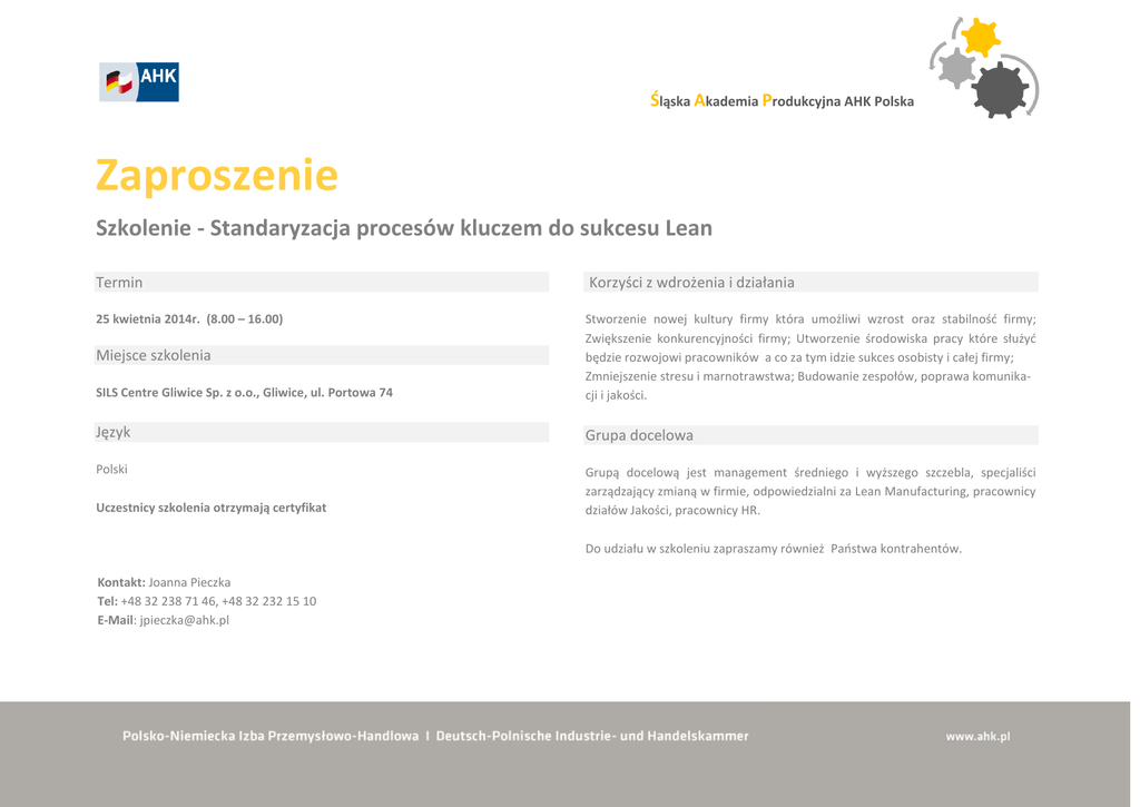 Śląska Akademia Produkcyjna AHK Polska Zaproszenie Szkolenie - Standaryzacja procesów kluczem do sukcesu Lean Termin Korzyści z wdrożenia i działania 25 kwietnia 2014r. (8.00 – 16.00) SILS Centre Gliwice Sp. z o.o., Gliwice, ul. Portowa 74 Stworzenie nowej kultury firmy która umożliwi wzrost oraz stabilność firmy; Zwiększenie konkurencyjności firmy; Utworzenie środowiska pracy które służyć będzie rozwojowi pracowników a co za tym idzie sukces osobisty i całej firmy; Zmniejszenie stresu i marnotrawstwa; Budowanie zespołów, poprawa komunikacji i jakości. Język Grupa docelowa Polski Grupą docelową jest management średniego i wyższego szczebla, specjaliści zarządzający zmianą w firmie, odpowiedzialni za Lean Manufacturing, pracownicy działów Jakości, pracownicy HR. Miejsce szkolenia Uczestnicy szkolenia otrzymają certyfikat Do udziału w szkoleniu zapraszamy również Państwa kontrahentów. Kontakt: Joanna Pieczka Tel: +48 32 238 71 46, +48 32 232 15 10 E-Mail: [email protected] Śląska Akademia Produkcyjna AHK Polska Program 1. Pojęcie i znaczenie standaryzacji 2. Standaryzacja i realizowane procesy Program szkolenia obejmuje zwiedzanie zakładu firmy SILS Centre Gliwice Sp. z o.o., gdzie zobaczymy nowoczesną linię montażową stworzoną według dobrych praktyk lean management. Standaryzacja i stosowna wizualizacja umożliwia dostawy na czas najwyższej jakości komponentów. 3. Stosowanie standaryzacji jako narzędzia redukcji kosztów 4. Procedury poświęcone tworzeniu systemu Standaryzacji 5. Rejestr aktualizacji kart standaryzacji 6. Stosowane wzory dokumentów 7. System egzaminów stanowiskowych Uwaga! Na terenie zakładu niezależnie od pogody i pory roku bezwzględnie obowiązują długie rękawy, długie spodnie (nigdy spódnice) i buty na płaskim obcasie, całkowicie zakrywające stopy. Agenda: Część 1 szkolenia: 8.00 – 9.30 Przerwa kawowa: 9.30 – 9.45 Część 2 szkolenia: 9.45-11.15 Lunch: 11.15 – 12.00 Zwiedzanie zakładu: 12.00-14.30 Część 3 szkolenia: 14.30 – 16.00 Śląska Akademia Produkcyjna AHK Polska Prowadzący Aleksander Wyciślik – certyfikowany trener, konsultant Continuous Improvement Manager w firmie z branży Automotive, będącej światowym liderem w swojej dziedzinie, absolwent Politechniki Śląskiej, wydziału Organizacji i Zarządzania oraz Wyższej Szkoły Bankowej w Poznaniu. Przeprowadzone szkolenia oraz projekty wdrożeniowe związane z Lean Manufacturing między innymi dla: Artech Polska Sp. z o.o. Centrala Zaopatrzenia Hutnictwa S.A., CHL Sławków (Euroterminal), ESA Logistika Sp. z o.o. (Grupa Hitachi Transport System Group), Huta Metali Nieżelaznych Szopienice S.A., Finnveden Polska S.A., Lajkonik Snack GmbH Sp. k., Lear Corporation II Sp. z o.o, Primo Profile Sp. zo.o., Prevac Sp. z o.o, Manuli - Hydraulics Polska S.A., Messer Eutectic Castolin Sp. z o.o., NT Industry Sp. z o.o., Plastic Omnium Auto Exteriors Sp. z o.o., Plastic Omnium Auto Sp. z o.o, PZL Świdnik S.A., Pfleiderer Grajewo S.A., Pfleiderer MDF Sp. z o.o., Politechnika Śląska, Logstor Polska Sp. z o.o. oraz Grupa Kopex S.A. Główny wykładowca oraz autor Rady Programowej w Akademii Lean prowadzonej przez Centrum Szkoleń Twardych. Partner Szkolenia SILS Centre Gliwice Sp. z o.o. obecna od 1999 roku na terenie Polski, specjalizuje się w montażach na zlecenie dla innych producentów, w tym również dostawą zmontowanych komponentów w systemie JIT do GM w Gliwicach. Seryjna produkcja w sekwencji wymaga ciągłego doskonalenia i standaryzacji procesów. Od niedawna SILS dysponuje również nowoczesnym magazynem usługowym i halą montażową dla klientów z różnych branż. Doskonałe wzorce standaryzacji i najlepsze praktyki lean management wykorzystujemy również w produkcji niskoseryjnej. SILS Centre Gliwice Sp. z o. o. pracuje zgodnie z systemem zarządzania jakością zgodnym z normami ISO 9001 oraz ISO TS 16949. Używa narzędzi kontrolnych, które gwarantują praktycznie stuprocentową niezawodność procesów poprzez dokumentację zgodności procesów z normami jakościowymi. Śląska Akademia Produkcyjna AHK Polska Karta zgłoszenia i warunki udziału Szkolenie - Standaryzacja procesów kluczem do sukcesu Lean 25 kwietnia 2014r. (8.00 – 16.00) Gliwice / Siedziba firmy SILS Centre Gliwice Sp. z o.o. / Portowa 74 imię i nazwisko____________________________________________ stanowisko______________________________________________ firma__________________________________________________ dokładny adres____________________________________________ □ Firma członkowska AHK Polska (630 PLN) + 23% VAT / os. □ Firma nie-członkowska AHK Polska (900 PLN)+ 23% VAT / os. Cena zawiera: materiały szkoleniowe, lunch oraz przerwy kawowe. Zgłoszenie prosimy przesyłać na adres mailowy [email protected] do dnia: 18.04.2014r. Uwaga! Bezkosztowa rezygnacja wyłącznie pisemnie do dnia 18.04.2014r. Po tym terminie obciążymy Państwa pełnymi kosztami uczestnictwa niezależnie od członkostwa. Do dn. 18.04.2014r. uczestnicy otrzymają pisemne potwierdzenie udziału w szkoleniu. AHK Polska zastrzega sobie prawo do zmian w programie szkolenia lub zmiany terminu. Informacja telefoniczna: Joanna Pieczka: tel. 48 32 238 71 46; +48 32 232 15 10; e-mail: [email protected]. Uwaga! Zgłoszenie na szkolenie na szkolenie jest jednoznaczne ze zgodą na przekazanie Partnerowi szkolenia danych uczestnika (imię, nazwisko, firma, stanowisko, numer dowodu osobistego, telefon kontaktowy) potrzebnych do wejścia na teren zakładu produkcyjnego. _____________________________________________________ tel_______________________e-mail________________________ www_____________________ NIP__________________________ data_______________________podpis_______________________