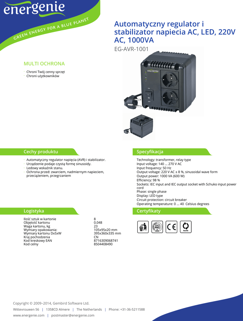 Automatyczny regulator i stabilizator napiecia AC, LED, 220V AC, 1000VA EG-AVR-1001 MULTI OCHRONA - Chroni Twój cenny sprzęt - Chroni użytkowników Cechy produktu Specyfikacja - Technology: transformer, relay type Input voltage: 140 ... 270 V AC Input frequency: 50 Hz Output voltage: 220 V AC ± 8 %, sinusoidal wave form Output power: 1000 VA (600 W) Efficiency: 98 % Sockets: IEC input and IEC output socket with Schuko input power cord Phase: single phase Display: LED type Circuit protection: circuit breaker Operating temperature: 0 ... 40 Celsius degrees Automatyczny regulator napięcia (AVR) i stabilizator. Urządzenie podaje czystą formę sinusoidy. Ledowy wskaźnik stanu. Ochrona przed: zwarciem, nadmiernym napieciem, przeciążeniem, przegrzaniem Logistyka Ilość sztuk w kartonie Objętość kartonu Waga kartonu, kg Wymiary opakowania: Wymiary kartonu DxSxW Kraj pochodzenia Kod kreskowy EAN Kod celny Certyfikaty 8 0.048 23 105x95x20 mm 395x360x335 mm CN 8716309068741 8504408490 Copyright © 2009–2014, Gembird Software Ltd. Wittevrouwen 56 | 1358CD Almere | The Netherlands | Phone: +31-36-5211588 www.energenie.com | [email protected]