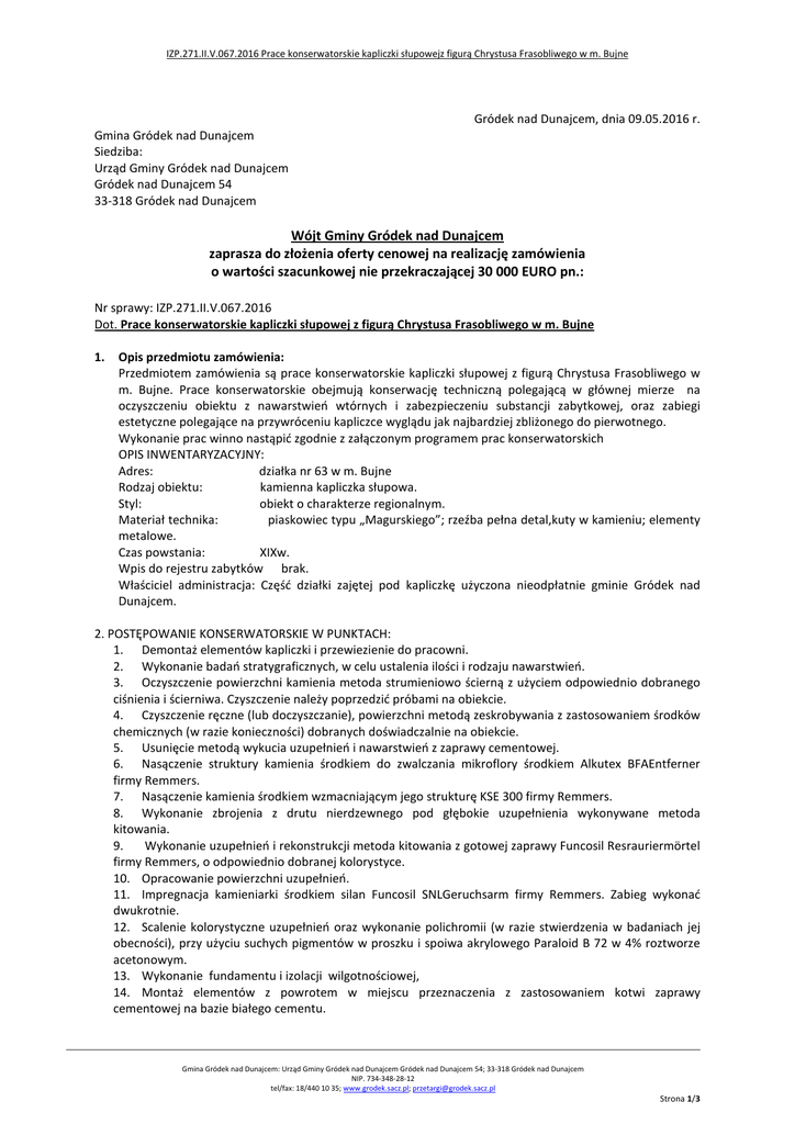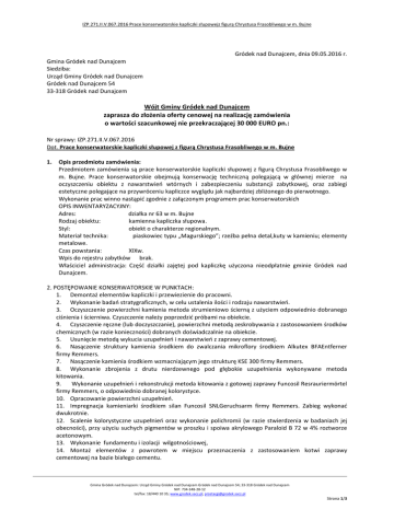 IZP.271.II.V.067.2016 Prace konserwatorskie kapliczki słupowejz figurą Chrystusa Frasobliwego w m. Bujne Gródek nad Dunajcem, dnia 09.05.2016 r. Gmina Gródek nad Dunajcem Siedziba: Urząd Gminy Gródek nad Dunajcem Gródek nad Dunajcem 54 33-318 Gródek nad Dunajcem Wójt Gminy Gródek nad Dunajcem zaprasza do złożenia oferty cenowej na realizację zamówienia o wartości szacunkowej nie przekraczającej 30 000 EURO pn.: Nr sprawy: IZP.271.II.V.067.2016 Dot. Prace konserwatorskie kapliczki słupowej z figurą Chrystusa Frasobliwego w m. Bujne 1. Opis przedmiotu zamówienia: Przedmiotem zamówienia są prace konserwatorskie kapliczki słupowej z figurą Chrystusa Frasobliwego w m. Bujne. Prace konserwatorskie obejmują konserwację techniczną polegającą w głównej mierze na oczyszczeniu obiektu z nawarstwień wtórnych i zabezpieczeniu substancji zabytkowej, oraz zabiegi estetyczne polegające na przywróceniu kapliczce wyglądu jak najbardziej zbliżonego do pierwotnego. Wykonanie prac winno nastąpić zgodnie z załączonym programem prac konserwatorskich OPIS INWENTARYZACYJNY: Adres: działka nr 63 w m. Bujne Rodzaj obiektu: kamienna kapliczka słupowa. Styl: obiekt o charakterze regionalnym. Materiał technika: piaskowiec typu „Magurskiego”; rzeźba pełna detal,kuty w kamieniu; elementy metalowe. Czas powstania: XIXw. Wpis do rejestru zabytków brak. Właściciel administracja: Część działki zajętej pod kapliczkę użyczona nieodpłatnie gminie Gródek nad Dunajcem. 2. POSTĘPOWANIE KONSERWATORSKIE W PUNKTACH: 1. Demontaż elementów kapliczki i przewiezienie do pracowni. 2. Wykonanie badań stratygraficznych, w celu ustalenia ilości i rodzaju nawarstwień. 3. Oczyszczenie powierzchni kamienia metoda strumieniowo ścierną z użyciem odpowiednio dobranego ciśnienia i ścierniwa. Czyszczenie należy poprzedzić próbami na obiekcie. 4. Czyszczenie ręczne (lub doczyszczanie), powierzchni metodą zeskrobywania z zastosowaniem środków chemicznych (w razie konieczności) dobranych doświadczalnie na obiekcie. 5. Usunięcie metodą wykucia uzupełnień i nawarstwień z zaprawy cementowej. 6. Nasączenie struktury kamienia środkiem do zwalczania mikroflory środkiem Alkutex BFAEntferner firmy Remmers. 7. Nasączenie kamienia środkiem wzmacniającym jego strukturę KSE 300 firmy Remmers. 8. Wykonanie zbrojenia z drutu nierdzewnego pod głębokie uzupełnienia wykonywane metoda kitowania. 9. Wykonanie uzupełnień i rekonstrukcji metoda kitowania z gotowej zaprawy Funcosil Resrauriermörtel firmy Remmers, o odpowiednio dobranej kolorystyce. 10. Opracowanie powierzchni uzupełnień. 11. Impregnacja kamieniarki środkiem silan Funcosil SNLGeruchsarm firmy Remmers. Zabieg wykonać dwukrotnie. 12. Scalenie kolorystyczne uzupełnień oraz wykonanie polichromii (w razie stwierdzenia w badaniach jej obecności), przy użyciu suchych pigmentów w proszku i spoiwa akrylowego Paraloid B 72 w 4% roztworze acetonowym. 13. Wykonanie fundamentu i izolacji wilgotnościowej, 14. Montaż elementów z powrotem w miejscu przeznaczenia z zastosowaniem kotwi zaprawy cementowej na bazie białego cementu. Gmina Gródek nad Dunajcem: Urząd Gminy Gródek nad Dunajcem Gródek nad Dunajcem 54; 33-318 Gródek nad Dunajcem NIP. 734-348-28-12 tel/fax: 18/440 10 35; www.grodek.sacz.pl; [email protected] Strona 1/3 Remont drogi gminnej „Sienna-Berdychów” nr 290687K w Siennej w km 0+200 – 0+600 15. Uzupełnienie fugowania na łączeniu elementów zaprawą renowacyjną do fugowania Funncosil FugenmoertelAltweiss firmy Remmers. 16. Uporządkowanie otoczenia wokół kapliczki. 17. Wykonanie i zamontowanie stylowego zadaszenia . Przedmiot zamówienia jest współfinansowany ze środków Województwa Małopolskiego na podstawie uchwały nr XXII/322/16 Sejmiku Województwa Małopolskiego w sprawie przyznania pomocy finansowej w formie dotacji celowej dla jednostek samorządu terytorialnego z terenu województwa małopolskiego. 2. Wymagany termin realizacji umowy: do 30 września 2016 roku. 3. Wykonanie prac winno nastąpić pod nadzorem osoby posiadającej odpowiednie uprawnienia, tj,.uprawnienia określone w ROZPORZĄDZENIU MINISTRA KULTURY I DZIEDZICTWA NARODOWEGO z dnia 27 lipca 2011 r. w sprawie prowadzenia prac konserwatorskich, prac restauratorskich, robót budowlanych, badań konserwatorskich, badań architektonicznych i innych działań przy zabytku wpisanym do rejestru zabytków oraz badań archeologicznych „§ 22. 1. Prace konserwatorskie, prace restauratorskie oraz badania konserwatorskie może prowadzić, w zakresie specjalności określonej w dyplomie ukończenia studiów, osoba, która posiada tytuł zawodowy magistra uzyskany po ukończeniu studiów wyższych: 1) na kierunku konserwacja i restauracja dzieł sztuki lub 2) w specjalności w zakresie konserwacji zabytków - oraz odbyła po ukończeniu tych studiów co najmniej 12-miesięczną praktykę zawodową w zakresie konserwacji lub badania zabytków wpisanych do rejestru zabytków. 2. W dziedzinach nieobjętych programem studiów wyższych, o których mowa w ust. 1, prace konserwatorskie, prace restauratorskie oraz badania konserwatorskie może prowadzić osoba, która posiada: 1) świadectwo ukończenia szkoły średniej zawodowej oraz tytuł zawodowy albo wykształcenie średnie i dyplom potwierdzający posiadanie kwalifikacji zawodowych w zawodach odpowiadających danej dziedzinie lub 2) dyplom mistrza w zawodzie odpowiadającym danej dziedzinie - oraz odbyła co najmniej 5-letnią praktykę zawodową w zakresie konserwacji lub badania zabytków wpisanych do rejestru zabytków.” 4. 5. 6. 7. Przy wyborze oferty do realizacji zamawiający będzie się kierował kryterium 4.1. Cena-100%. Do oferty należy załączyć następujące dokumenty: 5.1. Formularz oferty wg załączonego wzoru, stanowiącego załącznik nr 1 do zaproszenia; 5.2. Kosztorys ofertowy Opis sposobu obliczenia ceny w składanej ofercie: 6.1. W cenę nale