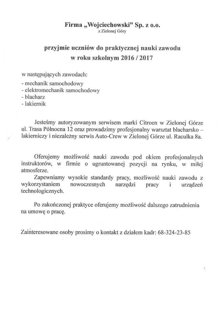 Firma „Wojciechowski" Sp. z o.o. z Zielonej Góry przyjmie uczniów do praktycznej nauki zawodu w roku szkolnym 2016 / 2017 w następujących zawodach: - mechanik samochodowy - elektromechanik samochodowy - blacharz - lakiernik Jesteśmy autoryzowanym serwisem marki Citroen w Zielonej Górze ul. Trasa Północna 12 oraz prowadzimy profesjonalny warsztat blacharsko lakierniczy i niezależny serwis Auto-Crew w Zielonej Górze ul. Raculka 8a. Oferujemy możliwość nauki zawodu pod okiem profesjonalnych instruktorów, w firmie o ugruntowanej pozycji na rynku, w miłej atmosferze. Zapewniamy wysokie standardy pracy, możliwość nauki zawodu z narzędzi pracy i urządzeń wykorzystaniem nowoczesnych techn.o logicznych. Po zakończonej praktyce oferujemy możliwość dalszego zatrudnienia na umowę o pracę. Zaińteresowane osoby prosimy o kontakt z działem kadr: 68-324-23-85