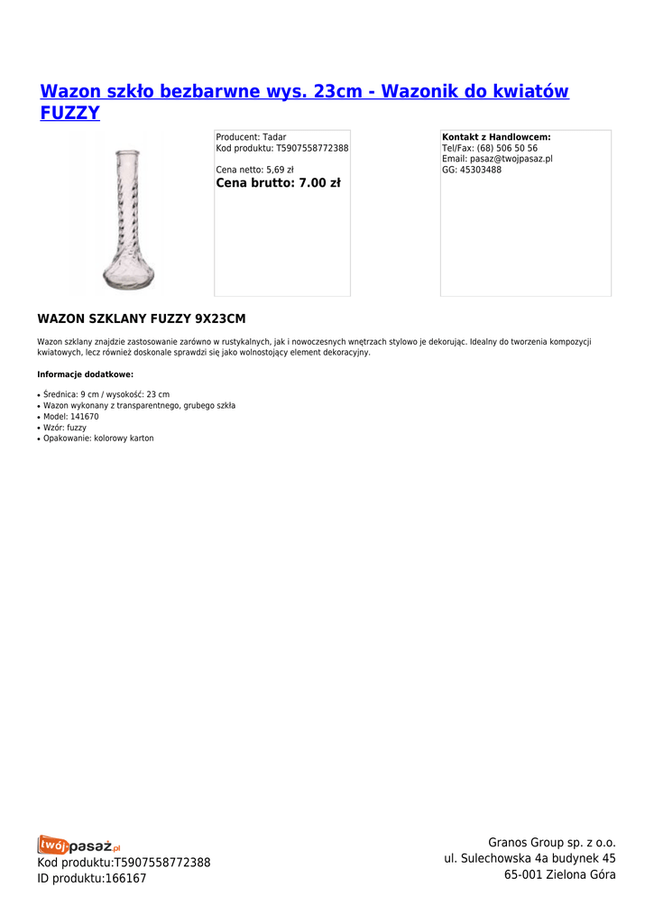 Wazon szkło bezbarwne wys. 23cm - Wazonik do kwiatów FUZZY Producent: Tadar Kod produktu: T5907558772388 Cena netto: 5,69 zł Kontakt z Handlowcem: Tel/Fax: (68) 506 50 56 Email: [email protected] GG: 45303488 Cena brutto: 7.00 zł WAZON SZKLANY FUZZY 9X23CM Wazon szklany znajdzie zastosowanie zarówno w rustykalnych, jak i nowoczesnych wnętrzach stylowo je dekorując. Idealny do tworzenia kompozycji kwiatowych, lecz również doskonale sprawdzi się jako wolnostojący element dekoracyjny. Informacje dodatkowe: ● ● ● ● ● Średnica: 9 cm / wysokość: 23 cm Wazon wykonany z transparentnego, grubego szkła Model: 141670 Wzór: fuzzy Opakowanie: kolorowy karton Kod produktu:T5907558772388 ID produktu:166167 Granos Group sp. z o.o. ul. Sulechowska 4a budynek 45 65-001 Zielona Góra