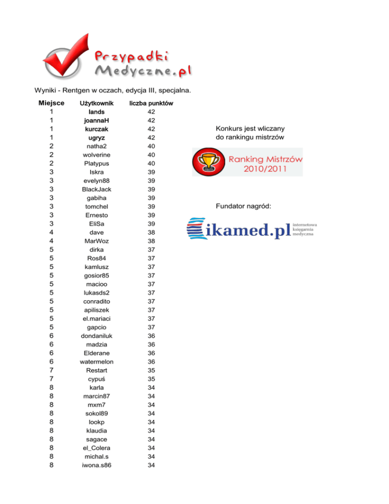 Wyniki - Rentgen w oczach, edycja III, specjalna. Miejsce 1 1 1