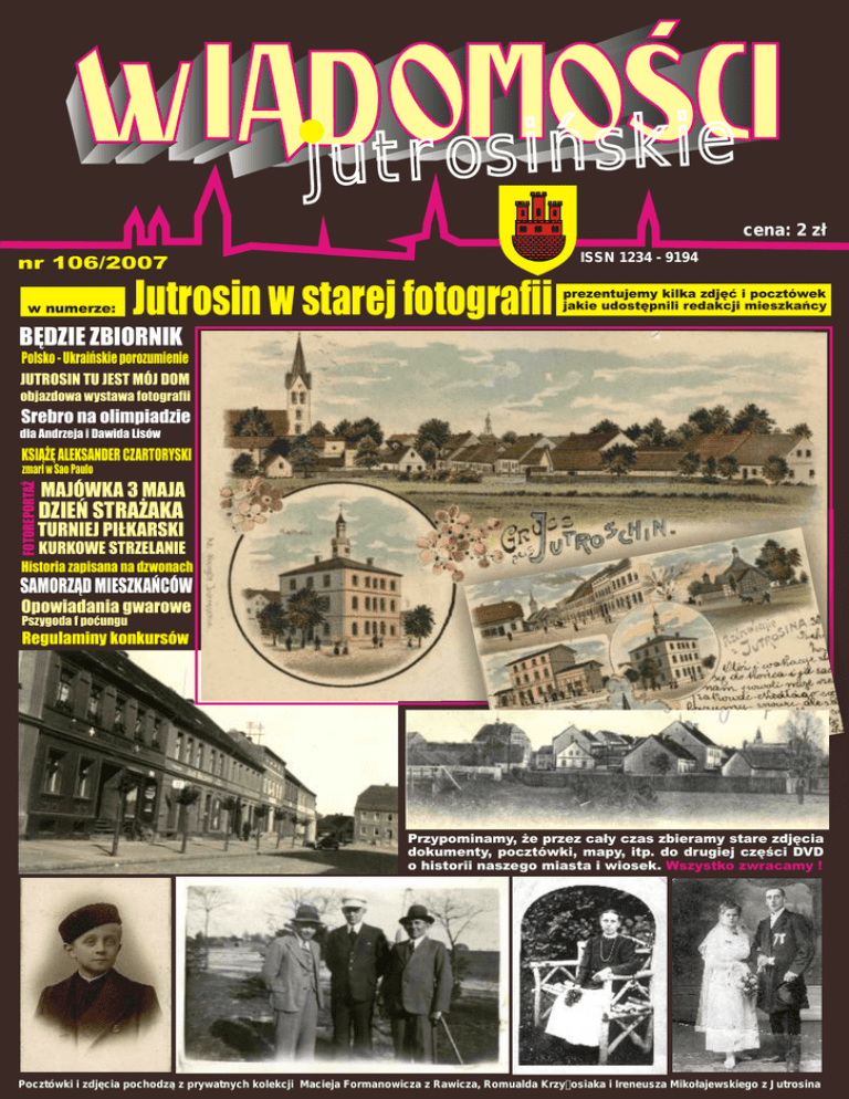 e i k s ń i s o r t ju cena: 2 zł ISSN 1234 - 9194 nr 106/2007 w numerze: Jutrosin w starej fotografii prezentujemy kilka zdjęć i pocztówek jakie udostępnili redakcji mieszkańcy BĘDZIE ZBIORNIK Polsko - Ukraińskie porozumienie JUTROSIN TU JEST MÓJ DOM objazdowa wystawa fotografii Srebro na olimpiadzie dla Andrzeja i Dawida Lisów KSIĄŻĘ ALEKSANDER CZARTORYSKI FOTOREPORTAŻ zmarł w Sao Paulo MAJÓWKA 3 MAJA DZIEŃ STRAŻAKA TURNIEJ PIŁKARSKI KURKOWE STRZELANIE Historia zapisana na dzwonach SAMORZĄD MIESZKAŃCÓW Opowiadania gwarowe Pszygoda f poćungu Regulaminy konkursów Przypominamy, że przez cały czas zbieramy stare zdjęcia dokumenty, pocztówki, mapy, itp. do drugiej części DVD o historii naszego miasta i wiosek. Wszystko zwracamy ! Pocztówki i zdjęcia pochodzą z prywatnych kolekcji Macieja Formanowicza z Rawicza, Romualda Krzyżosiaka i Ireneusza Mikołajewskiego z Jutrosina