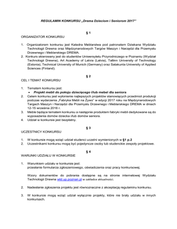 REGULAMIN KONKURSU „Drema Dzieciom i Seniorom 2017” §1 ORGANIZATOR KONKURSU 1. Organizatorem konkursu jest Katedra Meblarstwa pod patronatem Dziekana Wydziału Technologii Drewna oraz Międzynarodowych Targów Maszyn i Narzędzi dla Przemysłu Drzewnego i Meblarskiego DREMA. 2. Konkurs skierowany jest do studentów Uniwersytetu Przyrodniczego w Poznaniu (Wydział Technologii Drewna), Art Academy of Latvia (Latvia), Tallinn University of Technology (Estonia), Technical University of Munich (Germany) oraz Satakunta University of Applied Sciences (Finland). §2 CEL I TEMAT KONKURSU 1. 2. 3. 4. Tematem konkursu jest: Projekt mebli do pokoju dziecięcego i/lub mebel dla seniora Celem konkursu jest wyłonienie najlepszych projektów stanowiących przedmiot produkcji podczas wydarzenia „Fabryka Mebli na Żywo” w edycji 2017 roku na Międzynarodowych Targach Maszyn i Narzędzi dla Przemysłu Drzewnego i Meblarskiego DREMA w dniach 12-15 września 2016 r. Meble będące tematem konkursu a następnie produktem fabryki mebli dedykowane są do wyposażenia domów dziecka i/lub domów seniora. Udział w konkursie jest bezpłatny. §3 UCZESTNICY KONKURSU 1. 2. W konkursie mogą wziąć udział studenci uczelni wymienionych w §1 p.2 Uczestnikami konkursu mogą być pojedyncze osoby lub studenckie zespoły projektowe. §4 WARUNKI UDZIAŁU W KONKURSIE 1. Warunkiem udziału w konkursie jest: przesłanie formularza zgłoszeniowego, oświadczenia oraz pracy konkursowej. Wzory dokumentów do pobrania dostępne są na stronie internetowej Wydziału Technologii Drewna wtd.up.poznan.pl w zakładce aktualności. 2. Nadesłanie zgłoszenia projektu jest równoznaczne z akceptacją regulaminu konkursu. 3. W konkursie mogą wziąć udział wyłącznie projekty, które nie brały udziału w innych konkursach. §5 WARUNKI SPEŁNIANE PRZEZ PROJEKT 1. 2. 3. Zrealizowanie zadania konkursowego polega na przygotowaniu projektu zgodnie z przedstawionym tematem w § 2 regulaminu konkursu. Każdy z uczestników może zgłosić więcej niż jedną pracę konkursową. Praca konkursowa oceniana będzie pod względem: prawidłowej interpretacji tematu i użytych materiałów, estetyki, jakości wykonanej pracy, innowacyjności, oryginalności, możliwości wdrożenia projektu do produkcji podczas wydarzenia „Fabryka Mebli na Żywo”. §6 KAPITUŁA KONKURSU 1. 2. 3. W skład Kapituły konkursu wchodzą: przedstawiciel Dziekana Wydziału Technologii Drewna, trzech przedstawicieli Katedra Meblarstwa jako organizatora, przedstawiciel Międzynarodowych Targów Maszyn i Narzędzi dla Przemysłu Drzewnego i Meblarskiego DREMA, Decyzje Kapituły konkursu są wiążące i ostateczne. Kapituła konkursu zastrzega sobie prawo do nie podawania uzasadnienia swych werdyktów. §7 PRZYGOTOWANIE, TERMIN I MIEJSCE NADSYŁANIA PROJEKTÓW 1. 2. 3. Projekty należy składać osobiście w Katedrze Meblarstwa lub drogą elektroniczna na adres [email protected] , zgodnie z szablonem (do pobrania ze strony internetowej wtd.up.poznan.pl (aktualności) Wymogi dotyczące przekazania projektu: Praca konkursowa w formie projektu graficznego (wizualizacje) Praca konkursowa w formie modelu 3D (*.sat, *.igs, *.stl, *.step, *.pdf) Formularz zgłoszeniowy zawierający krótki opis projektu, a także wyjaśnienie inspiracji w formie elektronicznej. Prace można składać w sekretariacie Katedry Meblarstwa lub drogą elektroniczną na adres [email protected] do dnia 17.02.2017 r. godzina 15:00. Zgłoszenia dokonane po wskazanym terminie, lub dokonane przez uczestników nie spełniających wymogów określonych w regulaminie, lub nie zawierające wypełnionych i podpisanych oświadczeń wymaganych przez Organizatora oraz danych, lub nie zawierające wymaganej dokumentacji zostaną przez Organizatora odrzucone. §8 PRZEBIEG KONKURSU 1. Organizator konkursu do dnia 27.02.2017 r. oceni i zakwalifikuje wybrane prace konkursowe do wystawy prac konkursowych podczas Targów Arena Design 2017. 2. Kapituła konkursu wyłoni najlepszy projekt podczas trwania Targów Arena Design 2017 i zakwalifikuje go do dalszych prac związanych z wdrożeniem projektu do produkcji. 3. Autorzy prac zakwalifikowanych na wystawę podczas Targów Arena Design 2017, zostaną poinformowani mailowo lub telefonicznie. 4. Organizator zastrzega sobie możliwość wręczenia nagród specjalnych, ufundowanych przez współorganizatorów i patronów konkursu. §9 ROZSTRZYGNIĘCIE KONKURSU 1. 2. Wyniki konkursu ogłoszone zostaną po zakończeniu Targów Arena Design 2017. Obrady kapituły konkursu są niejawne. § 10 PRAWA AUTORSKIE DO PROJEKTU 1. Prace konkursowe naruszające prawa osób trzecich zostaną wykluczone z udziału w konkursie.