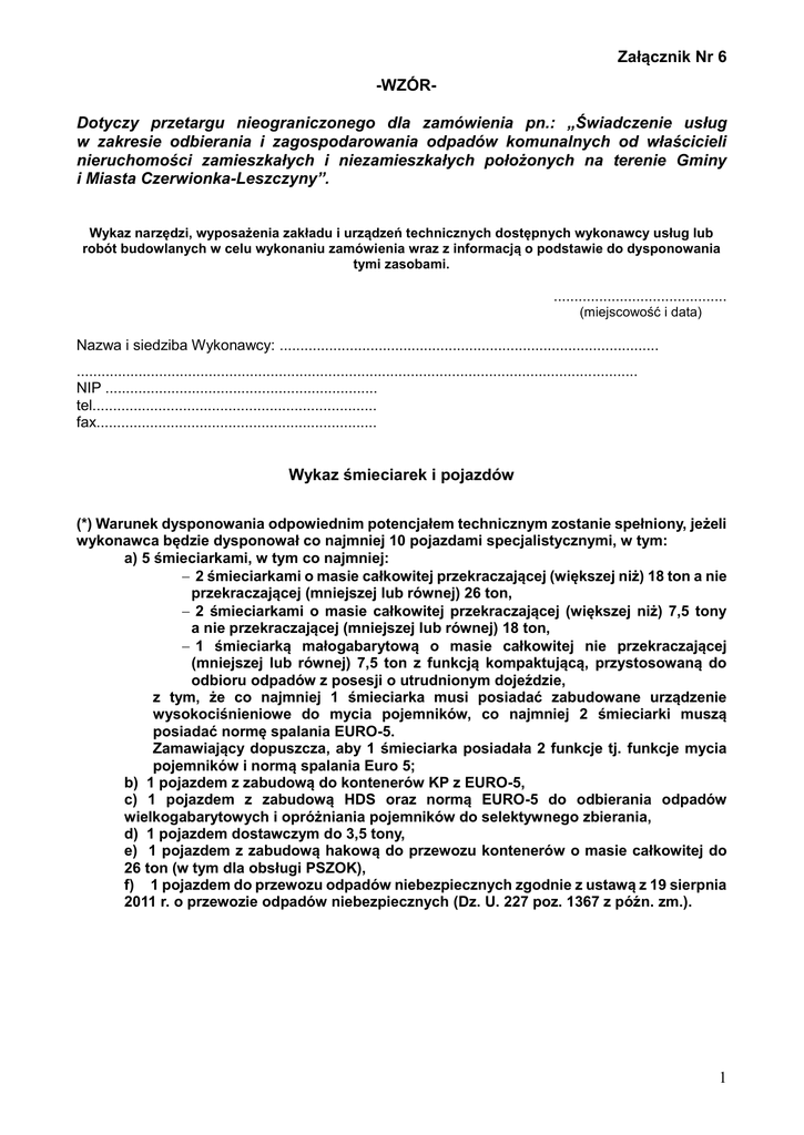 Załącznik Nr 6 -WZÓRDotyczy przetargu nieograniczonego dla zamówienia pn.: „Świadczenie usług w zakresie odbierania i zagospodarowania odpadów komunalnych od właścicieli nieruchomości zamieszkałych i niezamieszkałych położonych na terenie Gminy i Miasta Czerwionka-Leszczyny”. Wykaz narzędzi, wyposażenia zakładu i urządzeń technicznych dostępnych wykonawcy usług lub robót budowlanych w celu wykonaniu zamówienia wraz z informacją o podstawie do dysponowania tymi zasobami. .......................................... (miejscowość i data) Nazwa i siedziba Wykonawcy: ............................................................................................ ........................................................................................................................................ NIP .................................................................. tel..................................................................... fax.................................................................... Wykaz śmieciarek i pojazdów (*) Warunek dysponowania odpowiednim potencjałem technicznym zostanie spełniony, jeżeli wykonawca będzie dysponował co najmniej 10 pojazdami specjalistycznymi, w tym: a) 5 śmieciarkami, w tym co najmniej: 2 śmieciarkami o masie całkowitej przekraczającej (większej niż) 18 ton a nie przekraczającej (mniejszej lub równej) 26 ton, 2 śmieciarkami o masie całkowitej przekraczającej (większej niż) 7,5 tony a nie przekraczającej (mniejszej lub równej) 18 ton, 1 śmieciarką małogabarytową o masie całkowitej nie przekraczającej (mniejszej lub równej) 7,5 ton z funkcją kompaktującą, przystosowaną do odbioru odpadów z posesji o utrudnionym dojeździe, z tym, że co najmniej 1 śmieciarka musi posiadać zabudowane urządzenie wysokociśnieniowe do mycia pojemników, co najmniej 2 śmieciarki muszą posiadać normę spalania EURO-5. Zamawiający dopuszcza, aby 1 śmieciarka posiadała 2 funkcje tj. funkcje mycia pojemników i normą spalania Euro 5; b) 1 pojazdem z zabudową do kontenerów KP z EURO-5, c) 1 pojazdem z zabudową HDS oraz normą EURO-5 do odbierania odpadów wielkogabarytowych i opróżniania pojemników do selektywnego zbierania, d) 1 pojazdem dostawczym do 3,5 tony, e) 1 pojazdem z zabudową hakową do przewozu kontenerów o masie całkowitej do 26 ton (w tym dla obsługi PSZOK), f) 1 pojazdem do przewozu odpadów niebezpiecznych zgodnie z ustawą z 19 sierpnia 2011 r. o przewozie odpadów niebezpiecznych (Dz. U. 227 poz. 1367 z późn. zm.). 1 Załącznik Nr 6 Lp. Rodzaj pojazdu: Dane dotyczące pojazdu (marka, typ, model) : Rok produkcji pojazdu: Masa całkowita w tonach: Podstawa do dysponowania: 1 2 3 4 5 6 1. śmieciarka o masie całkowitej przekraczającej (większej niż) 18 ton a nie przekraczającej (mniejszej lub równej) 26 ton 2. śmieciarka o masie całkowitej przekraczającej (większej niż) 18 ton a nie przekraczającej (mniejszej lub równej) 26 ton 3. śmieciarka o masie całkowitej przekraczającej (większej niż) 7,5 tony a nie przekraczającej (mniejszej lub równej) 18 ton 4. śmieciarka o masie całkowitej przekraczającej (większej niż) 7,5 tony a nie przekraczającej (mniejszej lub równej) 18 ton 5. śmieciarka małogabarytową o masie całkowitej nie przekraczającej (mniejszej lub równej) 7,5 ton, z funkcją kompaktującą, przystosowaną do odbioru odpadów z posesji o utrudnionym dojeździe 6. pojazd z zabudową do kontenerów KP z EURO-5 7. pojazd z zabudową HDS oraz normą EURO-5 do odbierania odpadów wielkogabarytowych i opróżniania pojemników do selektywnego zbierania 8. pojazd dostawczy do 3,5 tony 9. pojazd z zabudową hakową do przewozu kontenerów o masie całkowitej do 26 ton (w tym dla obsługi PSZOK) 2 Załącznik Nr 6 Lp. Rodzaj pojazdu: 10. pojazd do przewozu odpadów niebezpiecznych zgodnie z ustawą z 19 sierpnia 2011 r. o przewozie odpadów niebezpiecznych (Dz. U. 227 poz. 1367 z późn. zm.) Dane dotyczące pojazdu (marka, typ, model) : Rok produkcji pojazdu: Masa całkowita w tonach: Podstawa do dysponowania: 11. (**) Śmieciarka wskazana w powyższej tabeli w Lp. …......... posiada zabudowane urządzenie wysokociśnieniowe do mycia pojemników natomiast śmieciarki wskazane w powyższej tabeli w Lp. … i ..... posiadają normę spalania EURO-5. ..................................................................... (podpis upoważnionego przedstawiciela Wykonawcy) (*) - Zapis zamieszczony w celach informacyjnych. (**) - W przypadku wykazania większej ilości śmieciarek i pojazdów, dany wiersz należy wykorzystać tyle razy ile jest to konieczne, (***) - Uwaga: Wykonawca może polegać na zasobach innych podmiotów, niezależnie od charakteru prawnego łączących go z nimi stosunków. Wykonawca w takiej sytuacji zobowiązany jest udowodnić zamawiającemu, iż będzie dysponował zasobami niezbędnymi do realizacji zamówienia, w szczególności przedstawiając (dołączając do oferty) w tym celu pisemne zobowiązanie tych podmiotów do oddania mu do dyspozycji niezbędnych zasobów na potrzeby wykonania zamówienia. 3