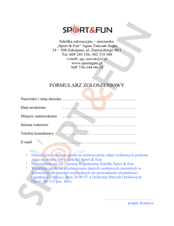 Szkółka rekreacyjno – narciarska „Sport & Fun” Agata Tańczak-Sięka 34 – 500 Zakopane, ul. Zamoyskiego 40/1 Tel. 609 245 156, 502 319 588 e-mail: [email protected] www.sportagata.pl NIP 736-144-96-18 FORMULARZ ZGŁOSZENIOWY Nazwisko i imię dziecka ……………………………………………… Data urodzenia ……………………………………………… Miejsce zamieszkania ……………………………………………… Imiona rodziców ……………………………………………… Telefon kontaktowy ……………………………………………… E-mail ……………………………………………… Niniejszym wyrażam zgodę na umieszczenie zdjęć zrobionych podczas zajęć na stronie www Szkółki Sport & Fun Zapoznałam/em się z treścią Regulaminu Szkółki Sport & Fun Wyrażam zgodę na przetwarzanie danych osobowych zawartych w formularzu dla potrzeb niezbędnych do prowadzenia działalności (zgodnie z Ustawą z dnia 29.08.97 o Ochronie Danych Osobowych (Dz.U. Nr 133 poz. 883). ……………………………… podpis Rodzica