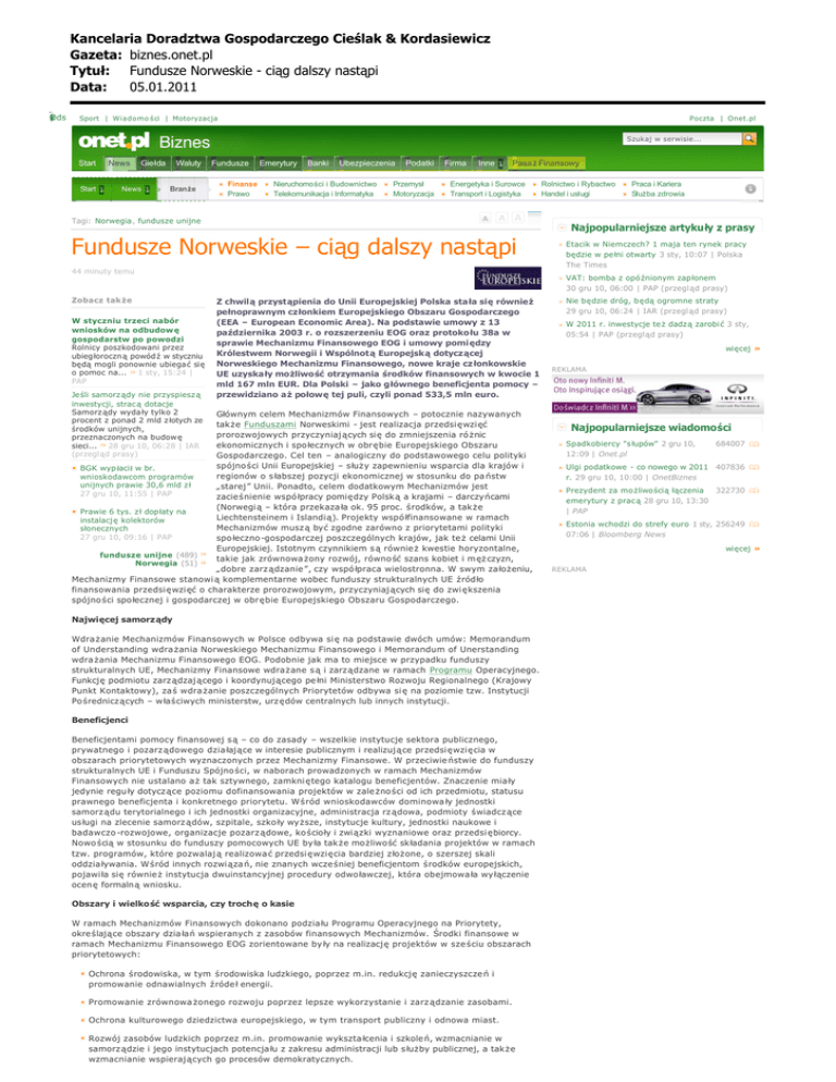 Kancelaria Doradztwa Gospodarczego Cielak & Kordasiewicz Gazeta: biznes.onet.pl Tytu³: Fundusze Norweskie ci¹g dalszy nast¹pi Data: 05.01.2011 Zobacz c ę wi ej wi Oej y c Wi Biznes Onet.pl ds ż łś ę Sport | Wiadomo ści | Motoryzacja Poczta | Onet.pl Szukaj w serwisie... Start Start News Giełda News Waluty Fundusze Finanse Prawo Branże Emerytury Banki Ubezpieczenia Nieruchomości i Budownictwo Telekomunikacja i Informatyka Podatki Przemysł Motoryzacja Firma Inne Pasaż Finansowy Energetyka i Surowce Transport i Logistyka Rolnictwo i Rybactwo Handel i usługi Tagi: Norwegia, fundusze unijne Praca i Kariera Służba zdrowia Najpopularniejsze artykuły z prasy Fundusze Norweskie – ciąg dalszy nastąpi 44 minuty temu Etacik w Niemczech? 1 maja ten rynek pracy będzie w pełni otwarty 3 sty, 10:07 | Polska The Times VAT: bomba z opó źnionym zapłonem 30 gru 10, 06:00 | PAP (przegląd prasy) Zobacz tak że W styczniu trzeci nabór wniosków na odbudow ę gospodarstw po powodzi Rolnicy poszkodowani przez ubiegłoroczną powódź w styczniu będą mogli ponownie ubiegać się o pomoc na... 1 sty, 15:24 | PAP Jeśli samorz ądy nie przyspiesz ą inwestycji, strac ą dotacje Samorz ądy wyda ły tylko 2 procent z ponad 2 mld z łotych ze środków unijnych, przeznaczonych na budow ę sieci... 28 gru 10, 06:28 | IAR (przegląd prasy) Z chwilą przystąpienia do Unii Europejskiej Polska stała się również pełnoprawnym członkiem Europejskiego Obszaru Gospodarczego (EEA – European Economic Area). Na podstawie umowy z 13 października 2003 r. o rozszerzeniu EOG oraz protokołu 38a w sprawie Mechanizmu Finansowego EOG i umowy pomiędzy Królestwem Norwegii i Wspólnotą Europejską dotyczącej Norweskiego Mechanizmu Finansowego, nowe kraje członkowskie UE uzyskały możliwość otrzymania środków finansowych w kwocie 1 mld 167 mln EUR. Dla Polski – jako głównego beneficjenta pomocy – przewidziano aż połowę tej puli, czyli ponad 533,5 mln euro. Głównym celem Mechanizmów Finansowych – potocznie nazywanych także Funduszami Norweskimi - jest realizacja przedsi ęwzięć prorozwojowych przyczyniaj ących się do zmniejszenia ró żnic ekonomicznych i społecznych w obr ębie Europejskiego Obszaru Gospodarczego. Cel ten – analogiczny do podstawowego celu polityki spójno ści Unii Europejskiej – służy zapewnieniu wsparcia dla krajów i BGK wyp łacił w br. regionów o s łabszej pozycji ekonomicznej w stosunku do pa ństw wnioskodawcom programów unijnych prawie 30,6 mld zł „starej ” Unii. Ponadto, celem dodatkowym Mechanizmów jest 27 gru 10, 11:55 | PAP zacieśnienie wspó łpracy pomiędzy Polsk ą a krajami – darczyńcami (Norwegią – która przekaza ła ok. 95 proc. środków, a tak że Prawie 6 tys. z ł dopłaty na Liechtensteinem i Islandi ą). Projekty wspó łfinansowane w ramach instalację kolektorów Mechanizmów musz ą być zgodne zarówno z priorytetami polityki słonecznych 27 gru 10, 09:16 | PAP spo łeczno -gospodarczej poszczególnych krajów, jak te ż celami Unii Europejskiej. Istotnym czynnikiem s ą równie ż kwestie horyzontalne, fundusze unijne (489) takie jak zrównowa żony rozwój, równo ść szans kobiet i męż czyzn, Norwegia (51) „dobre zarz ądzanie ”, czy wspó łpraca wielostronna. W swym za łożeniu, Mechanizmy Finansowe stanowi ą komplementarne wobec funduszy strukturalnych UE źródło finansowania przedsi ęwzięć o charakterze prorozwojowym, przyczyniaj ących się do zwi ększenia spójno ści społecznej i gospodarczej w obr ębie Europejskiego Obszaru Gospodarczego. wi ę cej wi ę cej Najwięcej samorządy Wdra żanie Mechanizmów Finansowych w Polsce odbywa si ę na podstawie dwóch umów: Memorandum of Understanding wdra żania Norweskiego Mechanizmu Finansowego i Memorandum of Unerstanding wdra żania Mechanizmu Finansowego EOG. Podobnie jak ma to miejsce w przypadku funduszy strukturalnych UE, Mechanizmy Finansowe wdrażane s ą i zarządzane w ramach Programu Operacyjnego. Funkcję podmiotu zarz ądzaj ącego i koordynującego pe łni Ministerstwo Rozwoju Regionalnego (Krajowy Punkt Kontaktowy), zaś wdra żanie poszczególnych Priorytetów odbywa się na poziomie tzw. Instytucji Po średniczących – właściwych ministerstw, urzędów centralnych lub innych instytucji. Beneficjenci Beneficjentami pomocy finansowej są – co do zasady – wszelkie instytucje sektora publicznego, prywatnego i pozarz ądowego dzia łające w interesie publicznym i realizuj ące przedsi ęwzięcia w obszarach priorytetowych wyznaczonych przez Mechanizmy Finansowe. W przeciwie ństwie do funduszy strukturalnych UE i Funduszu Spójno ści, w naborach prowadzonych w ramach Mechanizmów Finansowych nie ustalano a ż tak sztywnego, zamkni ętego katalogu beneficjentów. Znaczenie mia ły jedynie regu ły dotyczące poziomu dofinansowania projektów w zale żności od ich przedmiotu, statusu prawnego beneficjenta i konkretnego priorytetu. Wśród wnioskodawców dominowa ły jednostki samorz ądu terytorialnego i ich jednostki organizacyjne, administracja rz ądowa, podmioty świadcz ące usługi na zlecenie samorz ądów, szpitale, szko ły wyższe, instytucje kultury, jednostki naukowe i badawczo -rozwojowe, organizacje pozarz ądowe, ko ścioły i związki wyznaniowe oraz przedsi ębiorcy. Nowo ścią w stosunku do funduszy pomocowych UE by ła także możliwość składania projektów w ramach tzw. programów, które pozwalaj ą realizowa ć przedsi ęwzięcia bardziej złożone, o szerszej skali oddzia ływania. W śród innych rozwiąza ń, nie znanych wcze śniej beneficjentom środków europejskich, pojawi ła się równie ż instytucja dwuinstancyjnej procedury odwo ławczej, która obejmowa ła wyłączenie ocenę formalną wniosku. Obszary i wielkość wsparcia, czy trochę o kasie W ramach Mechanizmów Finansowych dokonano podzia łu Programu Operacyjnego na Priorytety, określające obszary dzia łań wspi