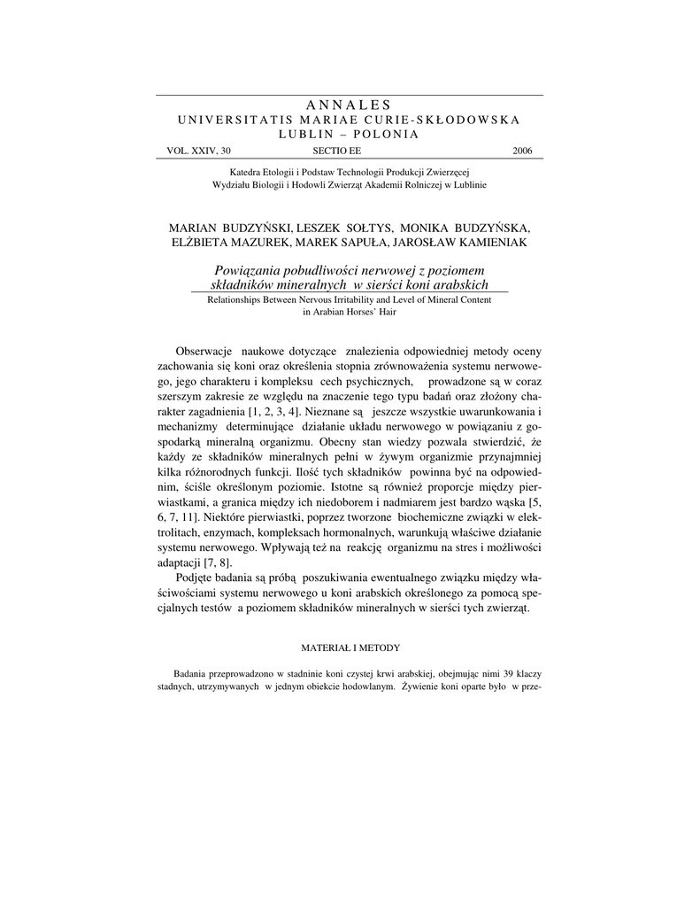 ANNALES UNIVERSITATIS MARIAE CURIE-SKŁODOWSKA LUBLIN – POLONIA VOL. XXIV, 30 SECTIO EE 2006 Katedra Etologii i Podstaw Technologii Produkcji Zwierz cej Wydziału Biologii i Hodowli Zwierz t Akademii Rolniczej w Lublinie MARIAN BUDZY SKI, LESZEK SOŁTYS, MONIKA BUDZY SKA, EL BIETA MAZUREK, MAREK SAPUŁA, JAROSŁAW KAMIENIAK Powi zania pobudliwo ci nerwowej z poziomem składników mineralnych w sier ci koni arabskich Relationships Between Nervous Irritability and Level of Mineral Content in Arabian Horses’ Hair Obserwacje naukowe dotycz ce znalezienia odpowiedniej metody oceny zachowania si koni oraz okre lenia stopnia zrównowa enia systemu nerwowego, jego charakteru i kompleksu cech psychicznych, prowadzone s w coraz szerszym zakresie ze wzgl du na znaczenie tego typu bada oraz zło ony charakter zagadnienia [1, 2, 3, 4]. Nieznane s jeszcze wszystkie uwarunkowania i mechanizmy determinuj ce działanie układu nerwowego w powi zaniu z gospodark mineraln organizmu. Obecny stan wiedzy pozwala stwierdzi , e ka dy ze składników mineralnych pełni w ywym organizmie przynajmniej kilka ró norodnych funkcji. Ilo tych składników powinna by na odpowiednim, ci le okre lonym poziomie. Istotne s równie proporcje mi dzy pierwiastkami, a granica mi dzy ich niedoborem i nadmiarem jest bardzo w ska [5, 6, 7, 11]. Niektóre pierwiastki, poprzez tworzone biochemiczne zwi zki w elektrolitach, enzymach, kompleksach hormonalnych, warunkuj wła ciwe działanie systemu nerwowego. Wpływaj te na reakcj organizmu na stres i mo liwo ci adaptacji [7, 8]. Podj te badania s prób poszukiwania ewentualnego zwi zku mi dzy właciwo ciami systemu nerwowego u koni arabskich okre lonego za pomoc specjalnych testów a poziomem składników mineralnych w sier ci tych zwierz t. MATERIAŁ I METODY Badania przeprowadzono w stadninie koni czystej krwi arabskiej, obejmuj c nimi 39 klaczy stadnych, utrzymywanych w jednym obiekcie hodowlanym. ywienie koni oparte było w prze- 218 M. Budzy ski, L. Sołtys, M. Budzy ska, E. Mazurek, M. Sapuła, J. Kamieniak wa aj cej wi kszo ci na paszach wyprodukowanych we własnym gospodarstwie. Klacze poddano indywidualnej ocenie stopnia pobudliwo ci za pomoc zmodyfikowanych testów l kliwo ci według metody Budzy skiego [3, 4]. Obserwacji dokonano w trzech układach: 1. Układ optyczny (O), w którym reakcj konia na bodziec wzrokowy badano w czasie prowadzenia przez masztalerza konia st pem na placu eksperymentalnym pomi dzy dwoma parawanami, za którymi były ustawione z lewej i prawej strony dwa obracaj ce si z czarno-białe kwadraty. 2. Układ akustyczny (A) – ko przechodził mi dzy parawanami, przy kwadratach nieobracaj cych si , natomiast wł czone były bod ce akustyczne, to jest d wi ki uzyskiwane z tonometru o okre lonej wysokoci. 3. Układ optyczno-akustyczny (OA), w którym rejestrowano zachowanie konia podczas przejcia mi dzy parawanami przy ruchomych kwadratach oraz emitowanych d wi kach. Zarówno podczas przej cia w jedn stron , jak i przy powrocie rejestrowano we wszystkich układach (O, A, OA) zachowanie koni w skali punktowej od 1 (niezrównowa ony nerwowo) do 10 (zachowanie spokojne, zrównowa one). W ka dym układzie testu ko mógł uzyska maksymalnie 20 punktów. Jako podstaw do zakwalifikowania klaczy do okre lonej grupy pobudliwo ci przyj to ł czn ocen punktow z trzech układów testu. Na tej podstawie utworzono nast puj ce grupy pobudliwo ci klaczy: „spokojne” – 45 pkt i powy ej, „ rednio pobudliwe” – 40 – 44 pkt i „pobudliwe” – 39 pkt i poni ej. W celu okre lenia poziomu poszczególnych składników mineralnych klaczom pobrano próbki sier ci z okolic karku spod grzywy w ilo ci ok. 500 mg. Okre lono w nich poziom 28 pierwiastków. Analizy pierwiastków dokonano przy u yciu spektrometru emisji atomowej z plazm wzbudzon indukcyjnie (ICP – OES) serii Optima 5300 DV firmy Perkin Elmer poprzez pomiar emisji atomowej z zastosowaniem optycznej techniki spektroskopowej. Badania przeprowadzono w Laboratorium Pierwiastków ladowych w Łodzi. Analizowane składniki mineralne pogrupowano na makroelementy (Ca, P, Na, K, S, Mg), mikroelementy (Co, Mg, Fe, I, Mg, Zn,) ladowe (Al., B, Cr, Mo, Ni, Se, Si) i toksyczne (As, Cd, Ba, Ge, Hg, Li, Pb, Sn, Sr) według przyj tych i podawanych w pi miennictwie [5, 6, 7, 9, 10, 11] zasad. Wyniki opracowano statystycznie przy wykorzystaniu pakietu Excel 7,0 i Statistica 6,0. Wyliczono rednie arytmetyczne (x) i odchylenia standardowe (S). Okre lono równie poziom poszczególnych grup pierwiastków w skrajnych grupach pobudliwo ci – „spokojne”, „pobudliwe” w porównaniu ze redni w badanej populacji. OMÓWIENIE WYNIKÓW Magnez uwa a si za pierwiastek warunkuj cy prawidłowe reagowanie organizmu na stres. Podczas stresu działaj mechanizmy wywołuj ce niedobór tego pierwiastka [7, 8]. Wyniki oceny stopnia pobudliwo ci pozwalaj na konstatacj , e poziom stresu wywołanego podczas wykonywania testów l kliwo ci (O, A, OA) mo e by powi zany z zawarto ci magnezu w sier ci badanych klaczy. Najwy sz ilo wykazano u klaczy zaliczonych do grupy spokojnych natomiast najni sz u klaczy pobudliwych. Po rednie warto ci wyst piły u klaczy rednio pobudliwych (tab. 1, ryc. 1). W przypadku miedzi i elaza (zaliczonych do grupy mikroelementów) klacze spokojne cechowały si tak e najwy szym poziomem tych pierwiastków, rednio pobudliwe ni szym, a najmniej wymienionych pierwiastków stwierdzono u klaczy pobudliwych. Tab. 1. Zestawienie rednich zawarto ci makroelementów i mikroelementów (w mg/kg s.m.) w sier ci badanych klaczy arabskich z uwzgl dnieniem przynale no ci do grup pobudliwo ci Average content of macroelements and microelements (in mg/kg DM) in the hair of the studied Arabian mares considering their affinity to exitability groups Klacze ogółem n = 39 Mikroelementy Makroelementy Wyszczególnienie Spokojne 45 pkt i powy ej n = 16 x S rednio pobudliwe od 40 do 44 pkt n = 13 x S Pobudliwe 39 pkt i poni j n = 10 x S x S w