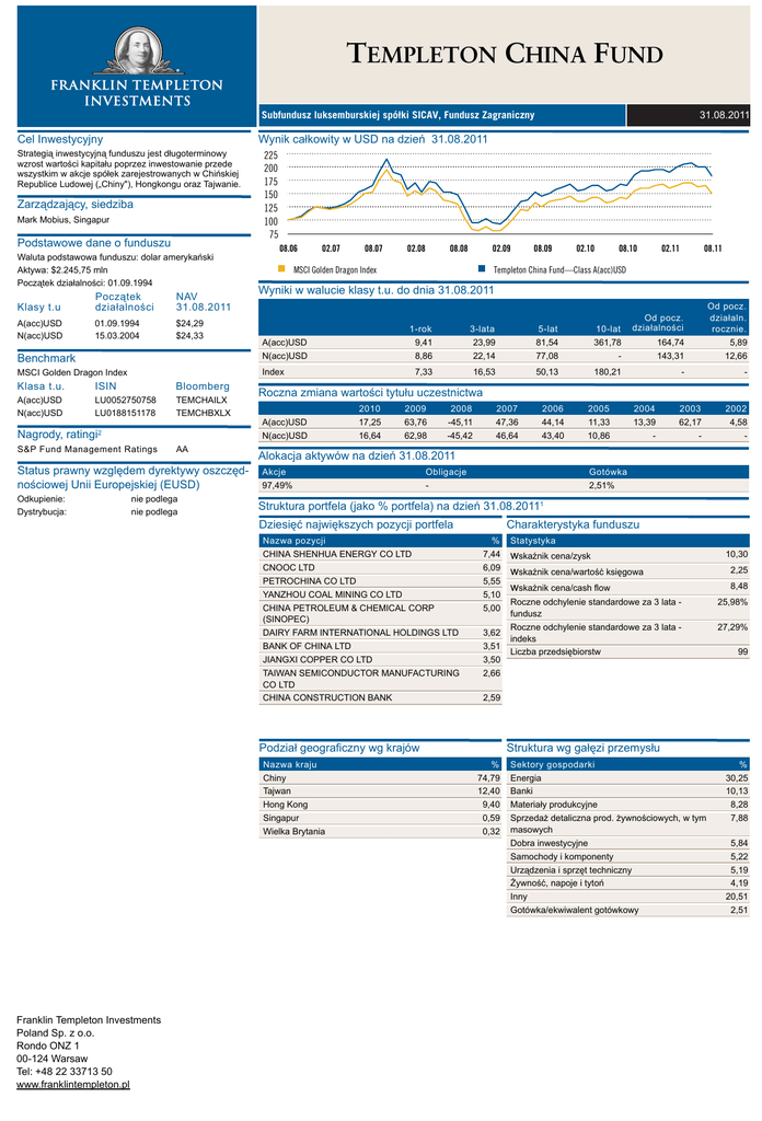 TEMPLETON CHINA FUND 31.08.2011 Subfundusz luksemburskiej spółki SICAV, Fundusz Zagraniczny Cel Inwestycyjny Wynik całkowity w USD na dzień 31.08.2011 Strategią inwestycyjną funduszu jest długoterminowy wzrost wartości kapitału poprzez inwestowanie przede wszystkim w akcje spółek zarejestrowanych w Chińskiej Republice Ludowej („Chiny"), Hongkongu oraz Tajwanie. Zarządzający, siedziba Mark Mobius, Singapur Podstawowe dane o funduszu Waluta podstawowa funduszu: dolar amerykański Aktywa: $2.245,75 mln Początek działalności: 01.09.1994 Klasy t.u Początek działalności NAV 31.08.2011 A(acc)USD N(acc)USD 01.09.1994 15.03.2004 $24,29 $24,33 Benchmark Klasa t.u. ISIN Bloomberg A(acc)USD N(acc)USD LU0052750758 LU0188151178 TEMCHAILX TEMCHBXLX Nagrody, ratingi2 S&P Fund Management Ratings AA Status prawny względem dyrektywy oszczędnościowej Unii Europejskiej (EUSD) nie podlega nie podlega 06&,*ROGHQ'UDJRQ,QGH[ 7HPSOHWRQ&KLQD)XQG¥&ODVV$DFF86' A(acc)USD N(acc)USD 1-rok 9,41 8,86 3-lata 23,99 22,14 5-lat 81,54 77,08 10-lat 361,78 - 7,33 16,53 50,13 180,21 Od pocz. działalności Od pocz. działaln. rocznie. 164,74 143,31 5,89 12,66 - - Roczna zmiana wartości tytułu uczestnictwa A(acc)USD N(acc)USD 2010 17,25 16,64 2009 63,76 62,98 2008 -45,11 -45,42 2007 47,36 46,64 2006 44,14 43,40 2005 11,33 10,86 2004 13,39 - 2003 62,17 - 2002 4,58 - Alokacja aktywów na dzień 31.08.2011 Akcje 97,49% Obligacje - Gotówka 2,51% Struktura portfela (jako % portfela) na dzień 31.08.20111 Dziesięć największych pozycji portfela Charakterystyka funduszu Nazwa pozycji CHINA SHENHUA ENERGY CO LTD CNOOC LTD PETROCHINA CO LTD YANZHOU COAL MINING CO LTD CHINA PETROLEUM & CHEMICAL CORP (SINOPEC) % 7,44 6,09 5,55 5,10 5,00 DAIRY FARM INTERNATIONAL HOLDINGS LTD BANK OF CHINA LTD JIANGXI COPPER CO LTD TAIWAN SEMICONDUCTOR MANUFACTURING CO LTD 3,62 3,51 3,50 2,66 CHINA CONSTRUCTION BANK 2,59 Podział geograficzny wg krajów Nazwa kraju Chiny Tajwan Hong Kong Singapur Wielka Brytania Franklin Templeton Investments Poland Sp. z o.o. Rondo ONZ 1 00-124 Warsaw Tel: +48 22 33713 50 www.franklintempleton.pl Wyniki w walucie klasy t.u. do dnia 31.08.2011 Index MSCI Golden Dragon Index Odkupienie: Dystrybucja: Statystyka wskaźnik cena/zysk wskaźnik cena/wartość księgowa wskaźnik cena/cash flow 10,30 2,25 8,48 Roczne odchylenie standardowe za 3 lata fundusz 25,98% Roczne odchylenie standardowe za 3 lata indeks 27,29% Liczba przedsiębiorstw 99 Struktura wg gałęzi przemysłu % 74,79 12,40 9,40 0,59 0,32 Sektory gospodarki Energia Banki Materiały produkcyjne Sprzedaż detaliczna prod. żywnościowych, w tym masowych % 30,25 10,13 8,28 7,88 Dobra inwestycyjne Samochody i komponenty Urządzenia i sprzęt techniczny Żywność, napoje i tytoń Inny Gotówka/ekwiwalent gotówkowy 5,84 5,22 5,19 4,19 20,51 2,51 T EMPLETON C HINA F UND 31.08.2011 Zastrzeżenie prawne - Templeton China Fund Prawa autorskie © 2011. Franklin Templeton Investments. Wszelkie prawa zastrzeżone. Niniejszy dokument został sporządzony wyłącznie do celów informacyjnych i nie stanowi porady prawnej ani podatkowej ani oferty sprzedaży jakichkolwiek udziałów ani zaproszenia do zapisów na tytuły uczestnictwa jakiegokolwiek funduszu luksemburskiego SICAV Franklin Templeton Investment Funds (zwanego dalej „Funduszem”). Żadnej z części niniejszego dokumentu nie należy traktować jako porady inwestycyjnej . Zapisy na tytuły uczestnictwa mogą być dokonywane wyłącznie w oparciu o aktualny, pełny lub skrócony prospekt informacyjny Funduszu, ostatnie roczne sprawozdanie finansowe opatrzone opinią biegłego rewidenta oraz ostatnie półroczne sprawozdanie finansowe, o ile zostało opublikowane później niż sprawozdanie roczne. Ceny tytułów uczestnictwa i dochody uzyskiwane z tytułów uczestnictwa mogą ulec zmniejszeniu lub zwiększeniu, a inwestorzy mogą nie odzyskać całej zainwestowanej kwoty. Wyniki historyczne nie gwarantują wyników przyszłych. Zmiany kursów walut mogą wpływać na wartość inwestycji zagranicznych. Inwestowanie w fundusz denominowany w walucie obcej także wiąże się z ryzykiem zmian kursów wymiany. Inwestowanie w tytuły uczestnictwa Funduszu wiąże się z ryzykiem opisanym w pełnym i skróconym prospekcie informacyjnym Funduszu. Ryzyko związane z inwestycjami na rynkach wschodzących może być większe niż ryzyko na rynkach rozwiniętych. Inwestycje w instrumenty pochodne wiążą się z określonym rodzajem ryzyka szczegółowo opisanym w prospekcie informacyjnym Funduszu. Tytuły uczestnictwa Funduszu nie mogą być bezpośrednio ani pośrednio oferowane ani sprzedawane obywatelom ani rezydentom Stanów Zjednoczonych Ameryki Północnej. Tytuły uczestnictwa Funduszu nie są dostępne na każdym terytorium podlegającym dowolnej jurysdykcji, a osoby ubiegające się o pozyskanie tytułów uczestnictwa powinny sprawdzić możliwość nabycia tytułów uczestnictwa u lokalnego przedstawiciela Franklin Templeton przed planowaniem inwestycji. Wszelkie badania i analizy uwzględnione w niniejszym dokumencie zostały opracowane na potrzeby i do wyłącznych celów Franklin Templeton Investments i są udostępniane w niniejszym dokumencie wyłącznie do celów informacyjnych. Odniesienia do konkretnych gałęzi przemysłu, sektorów czy spółek mają charakter ogólnych informacji i nie muszą odzwierciedlać rzeczywistego zaangażowania funduszu w jakimkolwiek momencie. Przed podjęciem jakichkolwiek decyzji inwestycyjnych, zalecamy skonsultowanie się z doradcą finansowym. Kopię najnowszej wersji prospektu informacyjnego, rocznego sprawozdania finansowego lub półrocznego sprawozdania finansowego, o ile zostało opublikowane po publikacji ostatniego sprawozdania rocznego, można znaleźć na naszej stronie internetowej www.franklintempleton.pl lub otrzymać za darmo od Franklin Templeton Investments Poland Sp. z o.o.; Rondo ONZ1; 00-124 Warsaw Tel: +48 22 337 13 50; Fax: 