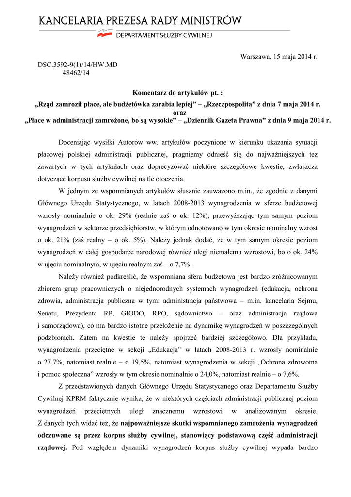 Warszawa, 15 maja 2014 r. DSC.3592-9(1)/14/HW.MD 48462/14 Komentarz do artykułów pt. : „Rząd zamroził płace, ale budŜetówka zarabia lepiej” – „Rzeczpospolita” z dnia 7 maja 2014 r. oraz „Płace w administracji zamroŜone, bo są wysokie” – „Dziennik Gazeta Prawna” z dnia 9 maja 2014 r. Doceniając wysiłki Autorów ww. artykułów poczynione w kierunku ukazania sytuacji płacowej polskiej administracji publicznej, pragniemy odnieść się do najwaŜniejszych tez zawartych w tych artykułach oraz doprecyzować niektóre szczegółowe kwestie, zwłaszcza dotyczące korpusu słuŜby cywilnej na tle otoczenia. W jednym ze wspomnianych artykułów słusznie zauwaŜono m.in., Ŝe zgodnie z danymi Głównego Urzędu Statystycznego, w latach 2008-2013 wynagrodzenia w sferze budŜetowej wzrosły nominalnie o ok. 29% (realnie zaś o ok. 12%), przewyŜszając tym samym poziom wynagrodzeń w sektorze przedsiębiorstw, w którym odnotowano w tym okresie nominalny wzrost o ok. 21% (zaś realny – o ok. 5%). NaleŜy jednak dodać, Ŝe w tym samym okresie poziom wynagrodzeń w całej gospodarce narodowej równieŜ uległ niemałemu wzrostowi, bo o ok. 24% w ujęciu nominalnym, w ujęciu realnym zaś – o 7,7%. NaleŜy równieŜ podkreślić, Ŝe wspomniana sfera budŜetowa jest bardzo zróŜnicowanym zbiorem grup pracowniczych o niejednorodnych systemach wynagrodzeń (edukacja, ochrona zdrowia, administracja publiczna w tym: administracja państwowa – m.in. kancelaria Sejmu, Senatu, Prezydenta RP, GIODO, RPO, sądownictwo – oraz administracja rządowa i samorządowa), co ma bardzo istotne przełoŜenie na dynamikę wynagrodzeń w poszczególnych podzbiorach. Zatem na kwestie te naleŜy spojrzeć bardziej szczegółowo. Dla przykładu, wynagrodzenia przeciętne w sekcji „Edukacja” w latach 2008-2013 r. wzrosły nominalnie o 27,7%, natomiast realnie – o 19,5%, natomiast wynagrodzenia w sekcji „Ochrona zdrowotna i pomoc społeczna” wzrosły w tym okresie nominalnie o 24,0%, natomiast realnie – o 7,6%. Z przedstawionych danych Głównego Urzędu Statystycznego oraz Departamentu SłuŜby Cywilnej KPRM faktycznie wynika, Ŝe w niektórych częściach administracji publicznej poziom wynagrodzeń przeciętnych uległ znacznemu wzrostowi w analizowanym okresie. Z danych tych widać teŜ, Ŝe najpowaŜniejsze skutki wspomnianego zamroŜenia wynagrodzeń odczuwane są przez korpus słuŜby cywilnej, stanowiący podstawową część administracji rządowej. Pod względem dynamiki wynagrodzeń korpus słuŜby cywilnej wypada bardzo niekorzystnie na tle swojego otoczenia, co powoduje stały spadek jego konkurencyjności płacowej względem rynku i innych części administracji. W jednym z artykułów słusznie zwrócono teŜ uwagę, Ŝe wzrosty wynagrodzeń w sektorze publicznym mają miejsce pomimo zamroŜenia funduszu wynagrodzeń zapowiadanego rok rocznie w kolejnych aktualizacjach Wieloletniego Planu Finansowego Państwa. Jak zauwaŜono, nie wszystkie części tego sektora są objęte zamroŜeniem, co powoduje pogłębianie się dysproporcji w dynamice wynagrodzeń w poszczególnych częściach sektora publicznego. W wyniku zamroŜenia wynagrodzeń mamy do czynienia z utrzymaniem się realnego spadku poziomu wynagrodzeń w korpusie słuŜby cywilnej od 5 lat oraz realnymi wzrostami w innych segmentach, o czym wspomniano wcześniej i co pokazuje poniŜszy wykres. Dynamika realnych wynagrodzeń w KSC na tle otoczenia w ostatnich 5 latach (w %) 9,2 7,7 9 6,4 7 5,2 5 3 1 -1 -3 -5 -7 -4,9 Administracja państwowa Gospodarka narodowa Sektor publiczny Administracja samorządu terytorialnego Korpus służby cywilnej Ponadto, zaznaczyć naleŜy, Ŝe przeciętne miesięczne wynagrodzenie w korpusie słuŜby cywilnej w 2013 r. było co prawda o 30,7% wyŜsze od przeciętnego miesięcznego wynagrodzenia w gospodarce narodowej ogółem, które w tym samym okresie wyniosło 3 650 zł brutto (wzrost nominalny względem 2012 r – o 3,4%), jednakŜe róŜnica ta w 2012 r. wynosiła 34,0%, natomiast w 2009 r. – 42,3%. NaleŜy przy tym pamiętać, Ŝe dane te stanowią porównanie wynagrodzeń członków korpusu słuŜby cywilnej, czyli wynagrodzeń grupy osób o wyŜszych kwalifikacjach zawodowych (co najmniej 50% osób zajmuje stanowiska, na których wymagane jest wykształcenie wyŜsze) z wynagrodzeniami osób zatrudnionych w całej gospodarce narodowej (udział osób z wyŜszym wykształceniem wynosi w niej ok. 30%). Zdaniem Departamentu SłuŜby Cywilnej realny spadek wynagrodzeń w korpusie słuŜby cywilnej jest szczególnie odczuwalny przez "najbiedniejsze" urzędy, w których przeciętne miesięczne wynagrodzenie wynosi poniŜej 80% przeciętnego wynagrodzenia w gospodarce narodowej (tj. poniŜej 60% średniej dla korpusu słuŜby cywilnej – poniŜej kwoty 2 862 zł brutto). Do tej grupy zalicza się ok. 370 urzędów – przede wszystkim administracji zespolonej szczebla powiatowego i wojewódzkiego. Tak więc odnosząc się do stwierdzenia zawartego w jednym 2 z ww. artykułów, Ŝe „według ekspertów zamroŜenie płac w kolejnych latach łatwiej zniosą te urzędy, w których wynagrodzenie wynosi około 8 tys. zł.” pragniemy zauwaŜyć, Ŝe do takich urzędów w korpusie słuŜby cywilnej moŜna zaliczyć jedynie Ministerstwo Spraw Zagranicznych oraz placówki zagraniczne, w których łączne zatrudnienie stanowi 2% całego korpusu słuŜby cywilnej. W sytuacji dalszego zamroŜenia wynagrodzeń problemem jest więc sytuacja w urzędach najniŜej opłacanych – mających zdecydowanie większy udział w korpusie niŜ urzędy wysoko opłacane. Ponadto prawdą jest, jak wskazano w artykule, Ŝe wynagrodzenia pracowników na najniŜszych szczeblach kariery w administracji publicznej są stosunkowo konkurencyjne względem sektora prywatnego, jednakŜe są to jedyne stanowiska, o których moŜna tak powiedzieć. Z badania zrealizowanego przez firmę HRM Partners S.A.1 na