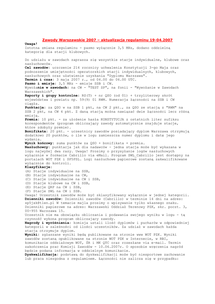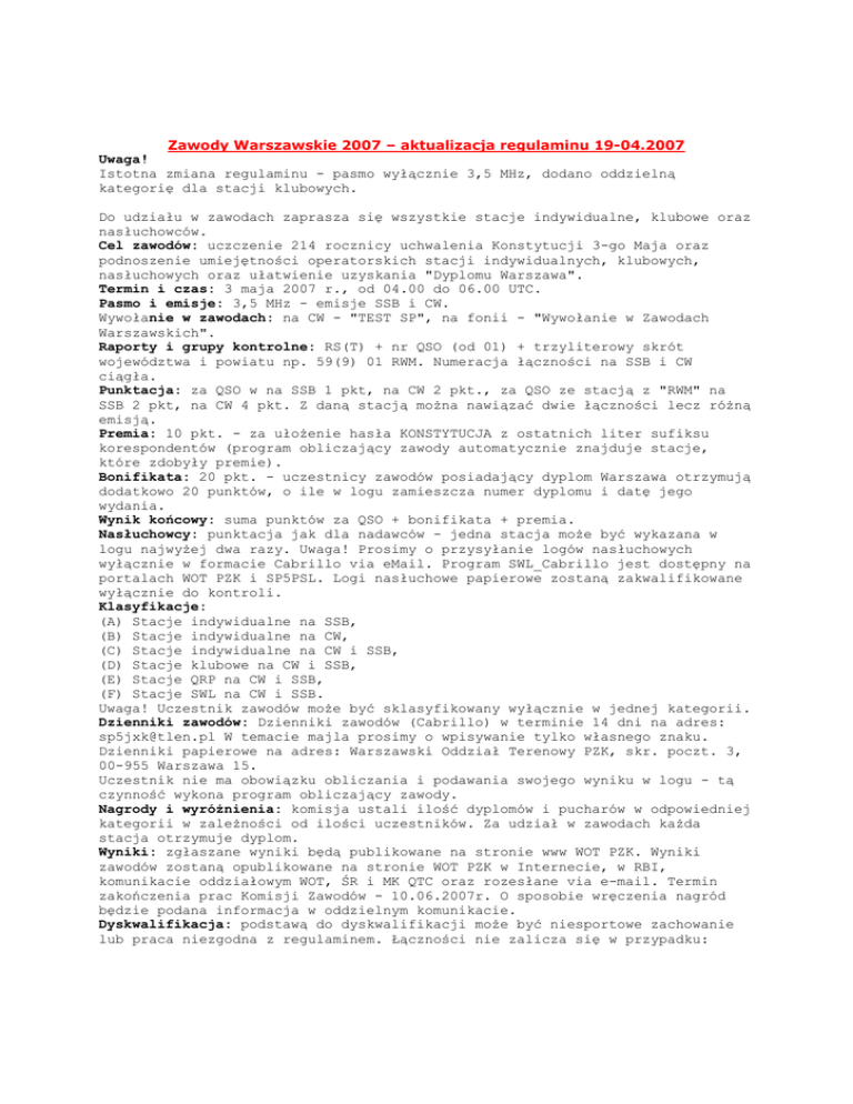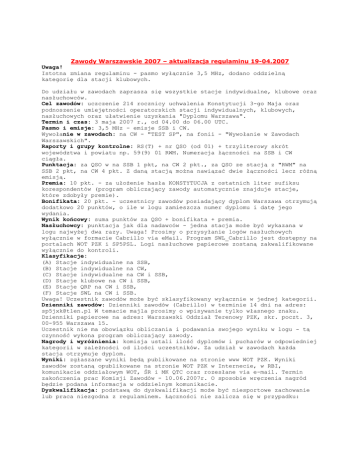 Zawody Warszawskie 2007 – aktualizacja regulaminu 19-04.2007 Uwaga! Istotna zmiana regulaminu - pasmo wyłącznie 3,5 MHz, dodano oddzielną kategorię dla stacji klubowych. Do udziału w zawodach zaprasza się wszystkie stacje indywidualne, klubowe oraz nasłuchowców. Cel zawodów: uczczenie 214 rocznicy uchwalenia Konstytucji 3-go Maja oraz podnoszenie umiejętności operatorskich stacji indywidualnych, klubowych, nasłuchowych oraz ułatwienie uzyskania "Dyplomu Warszawa". Termin i czas: 3 maja 2007 r., od 04.00 do 06.00 UTC. Pasmo i emisje: 3,5 MHz - emisje SSB i CW. Wywołanie w zawodach: na CW - "TEST SP", na fonii - "Wywołanie w Zawodach Warszawskich". Raporty i grupy kontrolne: RS(T) + nr QSO (od 01) + trzyliterowy skrót województwa i powiatu np. 59(9) 01 RWM. Numeracja łączności na SSB i CW ciągła. Punktacja: za QSO w na SSB 1 pkt, na CW 2 pkt., za QSO ze stacją z "RWM" na SSB 2 pkt, na CW 4 pkt. Z daną stacją można nawiązać dwie łączności lecz różną emisją. Premia: 10 pkt. - za ułożenie hasła KONSTYTUCJA z ostatnich liter sufiksu korespondentów (program obliczający zawody automatycznie znajduje stacje, które zdobyły premie). Bonifikata: 20 pkt. - uczestnicy zawodów posiadający dyplom Warszawa otrzymują dodatkowo 20 punktów, o ile w logu zamieszcza numer dyplomu i datę jego wydania. Wynik końcowy: suma punktów za QSO + bonifikata + premia. Nasłuchowcy: punktacja jak dla nadawców - jedna stacja może być wykazana w logu najwyżej dwa razy. Uwaga! Prosimy o przysyłanie logów nasłuchowych wyłącznie w formacie Cabrillo via eMail. Program SWL_Cabrillo jest dostępny na portalach WOT PZK i SP5PSL. Logi nasłuchowe papierowe zostaną zakwalifikowane wyłącznie do kontroli. Klasyfikacje: (A) Stacje indywidualne na SSB, (B) Stacje indywidualne na CW, (C) Stacje indywidualne na CW i SSB, (D) Stacje klubowe na CW i SSB, (E) Stacje QRP na CW i SSB, (F) Stacje SWL na CW i SSB. Uwaga! Uczestnik zawodów może być sklasyfikowany wyłącznie w jednej kategorii. Dzienniki zawodów: Dzienniki zawodów (Cabrillo) w terminie 14 dni na adres: [email protected] W temacie majla prosimy o wpisywanie tylko własnego znaku. Dzienniki papierowe na adres: Warszawski Oddział Terenowy PZK, skr. poczt. 3, 00-955 Warszawa 15. Uczestnik nie ma obowiązku obliczania i podawania swojego wyniku w logu - tą czynność wykona program obliczający zawody. Nagrody i wyróżnienia: komisja ustali ilość dyplomów i pucharów w odpowiedniej kategorii w zależności od ilości uczestników. Za udział w zawodach każda stacja otrzymuje dyplom. Wyniki: zgłaszane wyniki będą publikowane na stronie www WOT PZK. Wyniki zawodów zostaną opublikowane na stronie WOT PZK w Internecie, w RBI, komunikacie oddziałowym WOT, ŚR i MK QTC oraz rozesłane via e-mail. Termin zakończenia prac Komisji Zawodów - 10.06.2007r. O sposobie wręczenia nagród będzie podana informacja w oddzielnym komunikacie. Dyskwalifikacja: podstawą do dyskwalifikacji może być niesportowe zachowanie lub praca niezgodna z regulaminem. Łączności nie zalicza się w przypadku: niezgodności grup kontrolnych oraz różnicy czasu ponad 5 minut. Decyzje komisji zawodów są ostateczne. Manager Zawodów Warszawskich - Janusz SP5JXK/SN5J Zawody Warszawskie 2007 – regulamin poprzedni 1. Do udziału w zawodach zaprasza się wszystkie stacje indywidualne, klubowe oraz nasłuchowców. 2. Cel zawodów: Celem zawodów jest uczczenie 214 rocznicy uchwalenia Konstytucji 3-go Maja oraz podnoszenie umiejętności operatorskich stacji indywidualnych, klubowych, nasłuchowych oraz ułatwienie uzyskania "Dyplomu Warszawa". 3. Termin i czas zawodów: 3 maja 2007r. Pasmo 3.5 MHz w godzinach 04.00-06.00 UTC. 4. Pasmo i emisje: KF 3,5 MHz emisje SSB i CW. Obowiązuje przestrzeganie band planu. 5. Wywołanie w zawodach: Na CW - TEST SP, na fonii - WYWOŁANIE W ZAWODACH WARSZAWSKICH. 6. Raporty i grupy kontrolne RS(T) + nr QSO (od 01) + trzy literowy skrót województwa i powiatu np. 59(9) 01 RWM. Numeracja łączności na SSB i CW ciągła. 7. Punktacja Za QSO w paśmie KF na SSB 1 pkt, CW 2 pkt. Za QSO ze stacja z "RWM" SSB 2 pkt, CW 4 pkt. Z daną stacją można nawiązać dwie łączności lecz różną emisją. 8. Premia: 10 pkt. - za ułożenie hasła KONSTYTUCJA z ostatnich liter sufiksu korespondentów (program obliczający zawody automatycznie znajduje stacje, które zdobyły premię). 9. Bonifikata: 20 pkt. - Uczestnicy zawodów posiadający dyplom Warszawa otrzymują dodatkowo 20 punktów o ile w logu zamieszczą numer dyplomu i datę jego wydania. 10. Wynik końcowy Wynik końcowy zawodów stanowi suma punktów za QSO + bonifikata + premia. Nie stosuje się mnożników. 11. Nasłuchowcy Punktacja jak dla nadawców - jedna stacja może być wykazana w logu najwyżej dwa razy. Uwaga prosimy o przysyłanie logów nasłuchowych wyłącznie w formacie cabrillo via e-mail. Program SWL_Cabrillo jest dostępny na portalach WOT i SP5PSL. Logi nasłuchowe papierowe zostaną zakwalifikowane wyłącznie do kontroli. 12. Klasyfikacja : Uczestnik zawodów może być sklasyfikowany wyłącznie w jednej kategorii. A. Pasmo 3.5 MHz SSB (3.5 MHz emisja SSB) B. Pasmo 3.5 MHz CW (3.5 MHz emisja CW) C. Pasmo 3.5 MHz MIXED (3.5 MHz emisja CW+SSB) D. QRP Mixed (emisja CW+SSB) E. SWL Mixed (emisja CW+SSB) 13. Dzienniki zawodów: Dzienniki zawodów ze stroną sumaryczną (nie jest konieczne obliczanie wyniku), zaznaczoną kategorią klasyfikacji (np. A - Pasmo 3,5 SSB), zaznaczonym trzyliterowym skrótem województwa i powiatu np. RWM należy wysłać w terminie 14 dni (decyduje data wysyłki) na adres e-mail: [email protected]. W temacie e-majla prosimy o wpisywanie tylko własnego znaku. Preferowany format logu - Cabrillo - log w tym formacie generowany jest przez programy do logowania w zawodach – DQR_Log, MixW, N1MM, CT, WriteLog i inne programy. Fil - log w tym formacie generowany jest przez program do zawodów krajowych autor