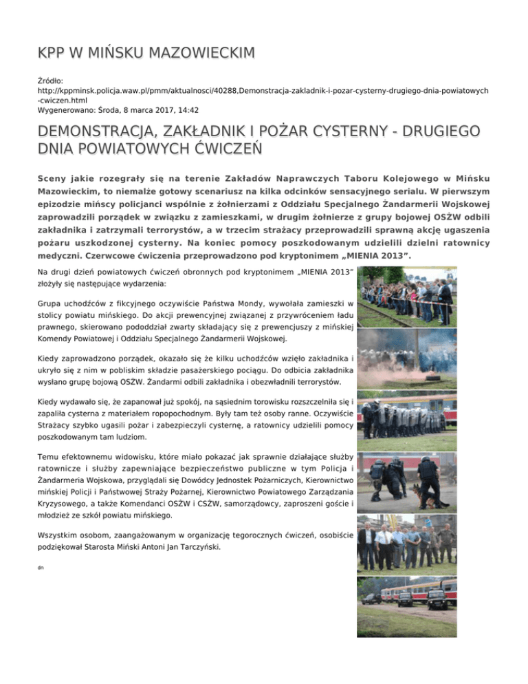 KPP W MIŃSKU MAZOWIECKIM Źródło: http://kppminsk.policja.waw.pl/pmm/aktualnosci/40288,Demonstracja-zakladnik-i-pozar-cysterny-drugiego-dnia-powiatowych -cwiczen.html Wygenerowano: Środa, 8 marca 2017, 14:42 DEMONSTRACJA, ZAKŁADNIK I POŻAR CYSTERNY - DRUGIEGO DNIA POWIATOWYCH ĆWICZEŃ Sceny jakie rozegrały się na terenie Zakładów Naprawczych Taboru Kolejowego w Mińsku Mazowieckim, to niemalże gotowy scenariusz na kilka odcinków sensacyjnego serialu. W pierwszym epizodzie mińscy policjanci wspólnie z żołnierzami z Oddziału Specjalnego Żandarmerii Wojskowej zaprowadzili porządek w związku z zamieszkami, w drugim żołnierze z grupy bojowej OSŻW odbili zakładnika i zatrzymali terrorystów, a w trzecim strażacy przeprowadzili sprawną akcję ugaszenia pożaru uszkodzonej cysterny. Na koniec pomocy poszkodowanym udzielili dzielni ratownicy medyczni. Czerwcowe ćwiczenia przeprowadzono pod kryptonimem „MIENIA 2013”. Na drugi dzień powiatowych ćwiczeń obronnych pod kryptonimem „MIENIA 2013” złożyły się następujące wydarzenia: Grupa uchodźców z fikcyjnego oczywiście Państwa Mondy, wywołała zamieszki w stolicy powiatu mińskiego. Do akcji prewencyjnej związanej z przywróceniem ładu prawnego, skierowano pododdział zwarty składający się z prewencjuszy z mińskiej Komendy Powiatowej i Oddziału Specjalnego Żandarmerii Wojskowej. Kiedy zaprowadzono porządek, okazało się że kilku uchodźców wzięło zakładnika i ukryło się z nim w pobliskim składzie pasażerskiego pociągu. Do odbicia zakładnika wysłano grupę bojową OSŻW. Żandarmi odbili zakładnika i obezwładnili terrorystów. Kiedy wydawało się, że zapanował już spokój, na sąsiednim torowisku rozszczelniła się i zapaliła cysterna z materiałem ropopochodnym. Były tam też osoby ranne. Oczywiście Strażacy szybko ugasili pożar i zabezpieczyli cysternę, a ratownicy udzielili pomocy poszkodowanym tam ludziom. Temu efektownemu widowisku, które miało pokazać jak sprawnie działające służby ratownicze i służby zapewniające bezpieczeństwo publiczne w tym Policja i Żandarmeria Wojskowa, przyglądali się Dowódcy Jednostek Pożarniczych, Kierownictwo mińskiej Policji i Państwowej Straży Pożarnej, Kierownictwo Powiatowego Zarządzania Kryzysowego, a także Komendanci OSŻW i CSŻW, samorządowcy, zaproszeni goście i młodzież ze szkół powiatu mińskiego. Wszystkim osobom, zaangażowanym w organizację tegorocznych ćwiczeń, osobiście podziękował Starosta Miński Antoni Jan Tarczyński. dn Ocena: 0/5 (0) Tweetnij