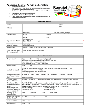 Application Form for Au Pair/ Mother’s Help • • • • • • 3 page application form Dear Family letter – write about your home, family, education, childcare experience, hobbies – at least 200 words 2 references – At least 1 reference must be childcare related but these cannot be from family member –forms supplied Photos of you with children/ family/ friends Medical Questionnaire – form supplied Police check – visit your local police station and apply for certificate to show any criminal history Personal details Name Female Male Address Contact details Nationality Phone: Country currently living in: Age and date of birth E-mail: Skype Address: Date of Birth Nationality and Passport number Marital status: Nationality Passport number Married Single Boyfriend/Girlfriend Divorced What type of location do you currently live in? City Mobile: Fax: Age Town Village Countryside General questions Do you drive? Do you smoke Available from-until Yes No Date when test passed: Have you had any accidents or convictions? Yes No How often? daily: Weekly: Monthly: Type of Roads? City Town: Rural Yes Yes No If yes, will you agree to not smoke in the house or around the kids? Yes From: Until: The longer you can stay the better it is Where do you wish to work? Please X all that FLEXIBLE apply Specific location: Au-pair Au-pair + Positions Sought City Town Village UK Countryside Scotland No Ireland Mothers help, only if you have 1 year + experience with children Please X all that apply Definition of Roles Pocket money/ salary weekly Have you got any brothers or sisters? If yes, please specify. How well do you speak English? Au Pair, 20-25 hours, 2 free days and (up to) 2 nights babysitting, pocket money from £70 Au Pair plus, 30-35 hours, 2 free days and (up to) 3 nights babysitting, pocket money from £80 Mother’s help, 35-45 hours per week with at least 1 day off – £100 - £200+ 1.Name and age: 2.Name and age: 3.Name and age: 4.Name and age: Do you wish to attend English classes? FLEXIBLE Do you like pets? Yes No Care for pets? Yes No Poor Adequate Yes Good Very good No Are you in perfect health? Allergies etc. Please give details. Specific food requirements? (Vegetarian etc) Please give details. Can you swim? Yes No Yes No Yes No Have you ever lived away from your family and friends? If yes, please specify. Will you accept a family that is not British? Will you accept Single Parent? What duties are you prepared to do? Please Yes No X as many as apply. The more you tick the more choice of family you’ll get FLEXIBLE Yes FLEXIBLE Yes Cook Supervise homework Wash up after meals Help with shopping No Yes, if they speak English at home No Single mother only Tidy/Clean children’s rooms Hoover Supervise bedtime Baby-sit Wash Children’s clothes Iron Tidy/dust Please tell us briefly about your hobbies and interests: Please state what qualities you find most important in yourself. ( Ex. Reliable, flexible etc) Education and qualifications Please give brief details of your education, how long you have studied for and examinations you have passed. Please give details of any other qualifications such as First aid certificates etc. Childcare Experience Are you experienced with the following? Please give brief details of your current childcare experience, including babysitting, summer camp. Ages of children etc. What age of children do you prefer? Babies under 6 months Yes No Happy to learn Toddlers Yes No Happy to learn School aged children? Yes No Happy to learn Why do you want become an au-pair? Brief description – Write at least 5-10 lines. More information can be detailed on your “Dear family letter”. How did you hear about Au Pair Programme? Please be helpful and tell us how you heard about us. If you were referred by someone who has used our services before, please give name. Thank you! I here declare the information on this application form is correct. Signature: Date: Biuro Wyjazdów Zagranicznych KANGIEL ul. Karczówkowska 5A, pok.39 25-019 Kielce email: [email protected] tel. 041 345 34 20 www.kangiel.pl, Please now complete PART 2 OF THE FORM AS SOON AS POSSIBLE AND THEN RETURN TO US – WE CANNOT OFFER YOU A FAMILY UNTIL WE HAVE YOUR FULL APPLICATION FORM Childcare reference This person is applying to be an au pair in Britain (Ta osoba ubiega się o udział w programie Au Pair w Wielkiej Brytanii) Au pair name Date of Birth We know this person as our (znamy tę osobę jako naszą): Babysitter (opiekunkę) / Nanny-Au pair (nianię lub au pair)/ Employee (nursery – school) (pracownika- przedszkola,szkoły)/ Club leader (animatora)/ Trainee (if learning to be childcarer) (praktykanta)/ other (inne) (please circle and specify) (proszę zakreślić właściwe I opisać) How long have you known this person for? Jak długo zna Pani/Pan w/w osobę? What are the ages, sex and number of children the candidate looked after (Dziećmi w jakim wieku I jakiej płci opiekowała się w/w osoba): boy(s) years old, girl(s) How long has this person helped you? years old From(od) Until (do) Jak długo ta osoba pomagała Pani/Panu? Describe childcare duties in brief (proszę opisać w skrócie obowiązki w/w osoby) Did the applicant also assist with light housework? Yes No Cooking? Yes No Czy aplikantka pomagała w lekkich pracach domowych? Tak Nie w gotowaniu? Nie Please consider these aspects (proszę określić poszególne cechy aplikanta) Getting along with children (kontakt z dziećmi) Excellent Love for children (miłość do dzieci) Excellent Communication with children (porozumiewanie się z dziećmi) Excellent Understanding of children (rozumienie dzieci) Excellent Entertainment/play with children (zabawa z dziećmi) Excellent Patience (cierpliwość) Excellent Flexibility (elastyczność) Excellent Responsibility level (odpowiedzialność) Excellent Maturity level (dojrzałość) Excellent Able to follow simple instructions (zdolność do wykonywanie poleceń) Excellent Communicat