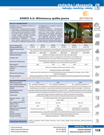 stolarka i akcesoria żaluzje, markizy, rolety ANWIS A.G. Wiśniewscy spółka jawna ROLETY ZEWNĘTRZNE uwzględnione w projekcie; skrzynka Dostępne są w 3 rodzajach zależnie od jest zabudowana sposobu montażu: ■ elewacyjne – montowane po wykoń- ■ naokienne BeClever – montowane czeniu domu do elewacji nad wnęką w otworach okiennych lub drzwiookienną lub drzwiową albo w świetle wych do ramy stolarki przed jej tej wnęki (wtedy nieznacznie ograosadzeniem; wymagają zaprojektoniczają dostęp światła); skrzynka wania wyższych otworów; możliwa na pancerz rolety jest widoczna jest całkowita zabudowa skrzynki od wnętrza domu lub na zewnątrz. ■ podtynkowe INTEGRO – montowane przed wykończeniem domu W ofercie jest też 6 typów profili pancewe wnęce w nadprożu; powinny być rza rolet o różnych wymiarach i kształcie. Nazwa typu profili Wys./gr. profili [mm] Materiał i konstrukcja rolet PA 37 37,0/8,0 PA 39 39,0/9,0 PA 40 40,0/8,7 pozostałe prezentacje PE 41* 41,0/8,5 PA 45 45,0/9,0 PA 52 52,0/13,0 pancerz rolety z profili aluminiowych w prowadnicach z aluminium lub tworzywa; skrzynka z aluminium lub tworzywa z rurą nawojową pancerza; profile z pianką poliuretanową, mogą być perforowane Maks. szer./wys. rolet [mm] Wymiary skrzynki 2800/2700 2800/3000 3200/3000 3800/4200 2900/3500 zależnie od rodzaju i powierzchni rolet oraz typu profili 3700/3800 manualny linkowy, taśmowy, sprężynowy lub korbowy oraz elektryczny (silnik 230 V/50 Hz o mocy 65-270 W, umieszczony w rurze nawojowej) Napędy rolet drogą kablową (przełącznik) lub radiową; indywidualne lub grupowe; możliwość współpracy np. ze sterownikami czasowymi Sterowanie elektryczne Masa [kg/m2] 2,80 Odporność na obciążenie wiatrem 3,50 6,83 3,00 3,50 zależnie od rodzaju profili oraz szerokości rolety Kolory wg palety kolorów profili ANWIS rygle ręczne lub automatyczne, zamek baskwilowy, wieszaki blokady lub wieszaki „Lock to Play”, kątowniki blokujące Mechanizmy blokujące Normy, aprobaty Deklaracja Zgodności z PN-EN 13659:2008+A1, Certyfikat ITB 1037/W, Aprobata AT-06-0183/2005 * dostępne tylko w wersji bez pianki poliuretanowej i bez perforacji ŻALUZJE FASADOWE Nazwa typu lameli Szer. i kształt lameli [mm] C 65 65 – przekrój w kształcie „C” Materiał i konstrukcja żaluzji lamele aluminiowe zawieszone na drabinkach poliestrowych umocowanych do rynny górnej ze stali ocynkowanej; rynna dolna – aluminium anodowane lub malowane; osłony maskujące – aluminium Prowadzenie lameli Napęd żaluzji Z 90 90 – przekrój w kształcie „Z” prowadnice (aluminium) lub linki (stal nierdzewna w osłonie z PVC) prowadnice (aluminium lub tworzywo) manualny korbowy lub elektryczny (silnik 230 V/50 Hz o mocy 90-210 W, umieszczony w rynnie górnej) ręczne (mechanizm korbowy), elektryczne (silnik); opcjonalnie: automatyka z możliwością podłączenia do systemu komputerowego sterowania budynkiem Sterowanie Wymiary żaluzji [mm] C 80 80 – przekrój w kształcie „C” szer. wys. min. 600 (napęd korba), 700 (napęd silnik); maks. 4000 maks. 4000 Wys. pakietu złożonych żaluzji* [mm] 200-400 160-360 3,42 3,47 3,53 2 (linka lub prowadnica) 0 (linka); 1 (prowadnica) 3 (prowadnica z tworzywa); 4 (prowadnica z aluminium) Masa [kg/m2] Odporność na obciążenie wiatrem [m/s] Kolory Sposób montażu Normy, aprobaty * zależnie od wysokości żaluzji 180-350 standardowe kolory z palety RAL 9006; 9007; 7016; 9016 VSR-240; możliwość zamówienie innych do ramy okna, do konstrukcji fasady, bezpośrednio do ściany Deklaracja Zgodności – 3/2009, EN 13659:2004 markizy, moskitiery, kraty i bramy rolowane, wewn. rolety, żaluzje, maty rolowane, zasłony panelowe POZOSTAŁE PRODUKTY i rzymskie www.anwis.pl informacja techniczna informacja handlowa [email protected] 54 412 88 00 54 412 88 00 adres firmy – str. 274 KATALOG INŻYNIERA Budownictwo Ogólne 2010/2011 119