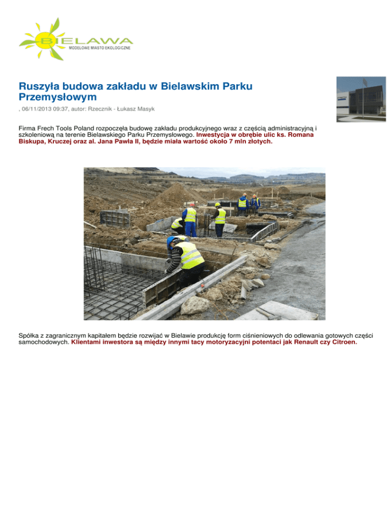 Ruszyła budowa zakładu w Bielawskim Parku Przemysłowym , 06/11/2013 09:37, autor: Rzecznik - Łukasz Masyk Firma Frech Tools Poland rozpoczęła budowę zakładu produkcyjnego wraz z częścią administracyjną i szkoleniową na terenie Bielawskiego Parku Przemysłowego. Inwestycja w obrębie ulic ks. Romana Biskupa, Kruczej oraz al. Jana Pawła II, będzie miała wartość około 7 mln złotych. Spółka z zagranicznym kapitałem będzie rozwijać w Bielawie produkcję form ciśnieniowych do odlewania gotowych części samochodowych. Klientami inwestora są między innymi tacy motoryzacyjni potentaci jak Renault czy Citroen. Frech Tools Poland jest dobrze znana w naszym mieście, ponieważ działalność produkcyjną od kilku lat prowadzi w hali przy ulicy Jana III Sobieskiego. Dobra pozycja na rynku, a także coraz większa ilość zamówień spowodowały, że firma zdecydowała się zwiększyć zatrudnienie oraz przystąpić do budowy własnej hali. Jak powiedział dyrektor Frech Tools Poland Jerzy Bielicz, dzięki idealnym warunkom do inwestowania przygotowanym przez miasto wewnątrz nowej części obwodnicy, spółka nie musiała szukać nowej lokalizacji poza Bielawą. Zgodnie z zapewnieniami inwestora, w hali której budowa zakończy się w kwietniu 2014 roku, pracę znajdzie kilkadziesiąt osób. Warto w tym miejscu podkreślić, że działalność produkcyjna będzie miała charakter nieuciążliwy dla środowiska oraz dla mieszkańców. Specyfiką produkcji jest bowiem wytwarzanie wysoko precyzyjnych podzespołów na obrabiarkach CNC. Wizualizację przyszłego zakładu można zobaczyć poniżej. Frech Tools Poland to nie jedyne przedsiębiorstwo, które w przyszłym roku wybuduje swoją siedzibę w Bielawskim Parku Przemysłowym wewnątrz al. Jana Pawła II. Na wiosnę 2014 roku firma DK System przystąpi w tym miejscu do budowy zakładu produkcyjnego. DK SYSTEM wytwarzać będzie w Bielawie termostaty i regulatory do pomp oraz kotłów obsługujących m.in. układy solarne. Firma posiada własne opatentowane produkty, które cieszą się bardzo dobrą opinią wśród coraz większej liczby odbiorców. © 2010 Gmina Bielawa. Wszelkie prawa zastrzeżone. All rights reserved. Projekt: XOOOM