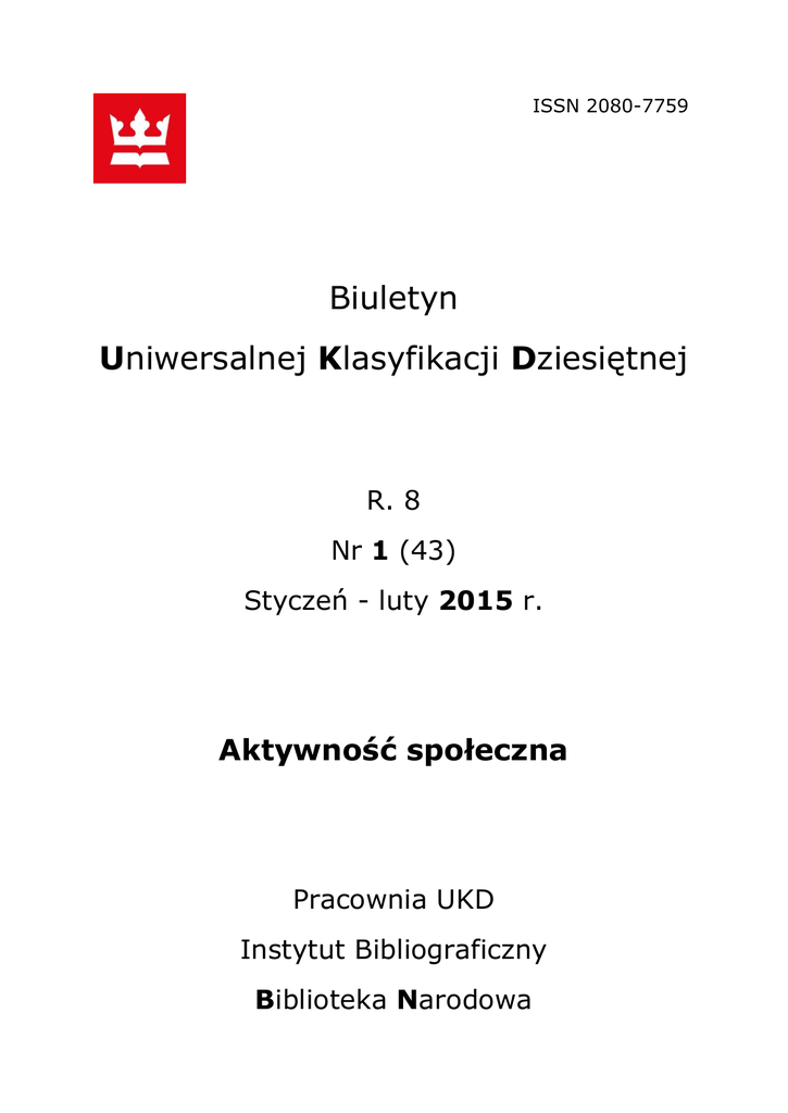 ISSN 2080-7759 Biuletyn Uniwersalnej Klasyfikacji Dziesiętnej R. 8 Nr 1 (43) Styczeń - luty 2015 r. Aktywność społeczna Pracownia UKD Instytut Bibliograficzny Biblioteka Narodowa Aktualności 1. Poddziały wspólne formy od 2015 r. Od stycznia 2015 roku rozszerzono wykaz poddziałów wspólnych formy, stosowanych w „Przewodniku Bibliograficznym” o następujące poddziały: (047) Reportaże Np.: 94(497) (047) Bałkańskie, kraje - historia Reportaż amerykański - od 1989 r. 7.071(73) (047) Lynch, Dennis (1969- ) Artyści amerykańscy - 21 w. Wywiady (083.824) Katalogi wystaw czasowych Np.: 75.071(438) (083.824) Gierymski, Aleksander (1850-1901) Muzeum Narodowe (Warszawa) - wystawy Warszawa - wystawy - od 1989 r. Katalogi wystaw Malarstwo polskie - 19-20 w. 2. Od stycznia 2015 r. wykaz działów UKD dla Bibliografii Zawartości Czasopism został rozszerzony o symbole uwzględnione w wykazie działów dla Zintegrowanej Platformy Polskich Czasopism Naukowych „Merkuriusz”. Przygotowany schemat układu działowego uzupełniony poddziałem wspólnym formy (045/046) Artykuły w prasie i czasopismach jest obecnie wspólny dla Bibliografii Zawartości Czasopism i dla Zintegrowanej Platformy Polskich Czasopism Naukowych „Merkuriusz”. 2 BIULETYN UKD NR 1 (43) AKTYWNOŚĆ SPOŁECZNA Aktywność społeczna to dobrowolne działanie na rzecz określonego środowiska. 316.6 Psychologia społeczna. Zachowania społeczne. Aktywność i bierność w zachowaniu społecznym. Zachowania ukierunkowane celowo1. Zachowanie prospołeczne. Aktywność społeczna (socjologia) 323.21 Współpraca ludności z państwem. Zaangażowanie obywateli w sprawy państwa. Pozytywna postawa obywatela do państwa2. Dialog społeczny (polityka). Konsultacje społeczne (polityka). Aktywność społeczna (polityka) Symbole UKD wyrażające pojęcia pokrewne dla aktywności społecznej: 304 Polityka społeczna. Kampanie społeczne 316.325 Społeczeństwo ze Społeczeństwo obywatelskie względu na specyficzne kryteria. 316.334.5 Socjologia społeczności regionalnych i lokalnych 316.77 Socjologia komunikowania. Komunikacja społeczna. Konsultacje społeczne (socjologia) 33.012.4 Formy organizacji gospodarczych wg celów handlowych. Organizacje non-profit 330.322.16 Inwestycje publiczno-prywatne. Partnerstwo publicznoprywatne 342.57 Prawa narodu. Udział narodu w rządzeniu. Konsultacje społeczne z parlamentem (prawo). Demokracja bezpośrednia (prawo) 364-32 Organizacje wolontariuszy. Wolontariat 1 316.625 Goal-oriented behaviour. Action (MRF); 316.62 Human behaviour. Social behaviour. Social life (MRF); 316.625 Společenská angažovanost (CZENAS) 2 323.21 Involvement of the people in state affairs. Positive attitude of citizen to state. Participation arising from voluntary initiative. Participation through official initiative (MRF); 323.21 Občanská společnost. Politická angažovanost (CZENAS) 3
