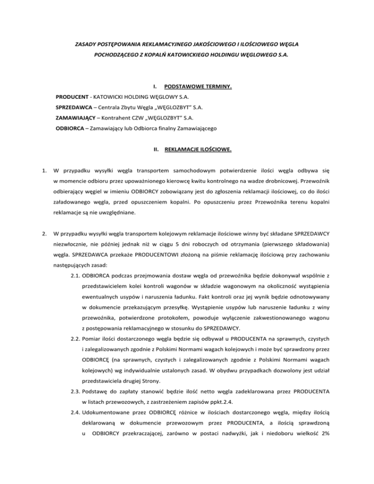 ZASADY POSTĘPOWANIA REKLAMACYJNEGO JAKOŚCIOWEGO I ILOŚCIOWEGO WĘGLA POCHODZĄCEGO Z KOPALŃ KATOWICKIEGO HOLDINGU WĘGLOWEGO S.A. I. PODSTAWOWE TERMINY. PRODUCENT - KATOWICKI HOLDING WĘGLOWY S.A. SPRZEDAWCA – Centrala Zbytu Węgla „WĘGLOZBYT” S.A. ZAMAWIAJĄCY – Kontrahent CZW „WĘGLOZBYT” S.A. ODBIORCA – Zamawiający lub Odbiorca finalny Zamawiającego II. REKLAMACJE ILOŚCIOWE. 1. W przypadku wysyłki węgla transportem samochodowym potwierdzenie ilości węgla odbywa się w momencie odbioru przez upoważnionego kierowcę kwitu kontrolnego na wadze drobnicowej. Przewoźnik odbierający węgiel w imieniu ODBIORCY zobowiązany jest do zgłoszenia reklamacji ilościowej, co do ilości załadowanego węgla, przed opuszczeniem kopalni. Po opuszczeniu przez Przewoźnika terenu kopalni reklamacje są nie uwzględniane. 2. W przypadku wysyłki węgla transportem kolejowym reklamacje ilościowe winny być składane SPRZEDAWCY niezwłocznie, nie później jednak niż w ciągu 5 dni roboczych od otrzymania (pierwszego składowania) węgla. SPRZEDAWCA przekaże PRODUCENTOWI złożoną na piśmie reklamację ilościową przy zachowaniu następujących zasad: 2.1. ODBIORCA podczas przejmowania dostaw węgla od przewoźnika będzie dokonywał wspólnie z przedstawicielem kolei kontroli wagonów w składzie wagonowym na okoliczność wystąpienia ewentualnych usypów i naruszenia ładunku. Fakt kontroli oraz jej wynik będzie odnotowywany w dokumencie przekazującym przesyłkę. Wystąpienie usypów lub naruszenie ładunku z winy przewoźnika, potwierdzone protokołem, powoduje wyłączenie zakwestionowanego wagonu z postępowania reklamacyjnego w stosunku do SPRZEDAWCY. 2.2. Pomiar ilości dostarczonego węgla będzie się odbywał u PRODUCENTA na sprawnych, czystych i zalegalizowanych zgodnie z Polskimi Normami wagach kolejowych i może być sprawdzony przez ODBIORCĘ (na sprawnych, czystych i zalegalizowanych zgodnie z Polskimi Normami wagach kolejowych) wg indywidualnie ustalonych zasad. W obydwu przypadkach dozwolony jest udział przedstawiciela drugiej Strony. 2.3. Podstawę do zapłaty stanowić będzie ilość netto węgla zadeklarowana przez PRODUCENTA w listach przewozowych, z zastrzeżeniem zapisów ppkt.2.4. 2.4. Udokumentowane przez ODBIORCĘ różnice w ilościach dostarczonego węgla, między ilością deklarowaną w dokumencie przewozowym przez PRODUCENTA, a ilością sprawdzoną u ODBIORCY przekraczającej, zarówno w postaci nadwyżki, jak i niedoboru wielkość 2% wynikającą z tolerancji wag i dopuszczalnych ubytków naturalnych, będą uwzględnione w płatnościach za dostawy, na podstawie reklamacji ilościowej zgłoszonej na piśmie przez ZAMAWIAJĄCEGO, o ile SPRZEDAWCA uzna reklamację za uzasadnioną. Załącznikami do reklamacji są: - kopia wydruku ważenia masy brutto, - kopia wydruku ważenia tary, - kopia listu przewozowego. 2.5. Podstawą rozpoczęcia postępowania przy reklamacji ilościowej jest pismo reklamacyjne ZAMAWIAJĄCEGO skierowane do SPRZEDAWCY, który przekaże je do właściwej kopalni – PRODUCENTA. Do pisma należy dołączyć protokół komisyjny ustalający stan przesyłki i wagonu w chwili przystąpienia do rozładunku. 2.6. Telefoniczne, faksowe i mailowe zawiadomienie SPRZEDAWCY nie zwalnia ZAMAWIAJĄCEGO z obowiązku pisemnego złożenia reklamacji. 2.7. Podstawą rozpatrzenia reklamacji ilościowej jest komisyjny protokół odbiorczy przesyłki, w którym m.in. stwierdza się: − datę jego sporządzenia, − miejsce oraz formę stwierdzenia braków ilościowych, − stan wagonu, tj. czy wagon jest sprawny technicznie, czy też uszkodzony, − stan przesyłki, tj. czy ładunek jest nienaruszony. 2.8. Po dokładnym rozpatrzeniu przez PRODUCENTA zasadności zgłoszonej reklamacji ZAMAWIAJĄCY zostanie zawiadomiony przez SPRZEDAWCĘ o sposobie jej załatwienia. 2.9. W przypadku uznania reklamacji ilościowej SPRZEDAWCA wystawia ZAMAWIAJĄCEMU fakturę korygującą, stanowiącą podstawę do dokonania stosownych zmian w zakresie rozliczeń finansowych. 2.10. SPRZEDAWCA nie ponosi odpowiedzialności za stwierdzone u ODBIORCY braki ilościowe w wagonowych przesyłkach węgla powstałe z winy osób trzecich. III. REKLAMACJE JAKOŚCIOWE. 1. ODBIORCA ma prawo przeprowadzania badań jakościowych otrzymanego węgla. Badania te należy przeprowadzić zgodnie z obowiązującymi Polskimi Normami. 2. W przypadku stwierdzenia przez ODBIORCĘ określonych wad jakościowych węgla przysługuje prawo zgłoszenia reklamacji jakościowej. 3. Podstawą rozpoczęcia trybu reklamacyjnego jest pisemne zgłoszenie przez ZAMAWIAJĄCEGO do SPRZEDAWCY reklamacji, która zostanie przekazana do właściwej kopalni - PRODUCENTA oraz udostępnienie kopalni partii reklamowanego węgla oddzielnie zeskładowanego. Reklamacje jakościowe winny być składane niezwłocznie, nie później jednak niż w ciągu 5 dni roboczych od otrzymania (pierwszego składowania) węgla. 4. W przypadku, gdy ODBIORCA ze względów technicznych i ruchowych nie ma możliwości zmagazynowania i zabezpieczenia reklamowanego węgla - celem przeprowadzenia komisyjnego badania jego jakości lub komisyjnego pobrania próbek, względnie zużył węgiel przed dokonaniem badania – wówczas reklamację załatwia się na podstawie wyników kontroli przedwysyłkowej dokonanej u PRODUCENTA. 5. Przedstawiciel PRODUCENTA przeprowadza u ODBIORCY komisyjne, wspólne pobieranie prób z reklamowanej partii węgla zgodnie z aktualną normą, a uzyskane wyniki będą podstawą do uznania bądź odrzucenia roszczeń reklamacyjnych. W trakcie pobierania spisuje się protokół i sporządza 3 próbki: jedną dla PRODUCENTA, drugą dla ODBIORCY, trzecią stanowiącą próbę rozjemczą. 6. W przypadku stwierdzenia wad jakościowych węgla, wyrażonych konkretnymi wartościami liczbowymi, ZAMAWIAJĄCEMU przysługuje prawo uzyskania stosownej bonifikaty. 7. W razie rozbieżności badania parametrów jako