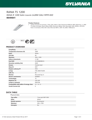 RANA T5 1200 RANA R 1200 Satin Louvre 2x28W DALI MPM 830 0049841 Product features • Ceiling recessed T5 luminaire, 1196 x 294 x 46mm, Satin Aluminium Reflector 98% reflectivity, 2 x 28W T5 lamps (included), Warm White 3000K, Electronic Ballast, DALI dimmable, 64W, 4920lm, LOR 93%, Push-in Connector, IP20, IK07, Glow Wire test 960°C, UGR<18, LM65<1000cd/m2 PRODUCT OVERVIEW Certyfikaty CE Temperatura barwowa (K) 3000 Kolor White CRI (Ra) 80 Wymiary 300 x 1200 Zakres sciemniania 3-100 Kod EAN 5410288498416 Strumien swietlny (lm) 4920 Korpus Painted steel Klasa IK IK07 Stopien ochrony IP IP20 Lampy FHE 28W/T5/830 LOR (%) 93 Montaz Reccesed lay-in Numer zamówienia 0049841 Technologia T5 Napiecie (V) 220-240 Lampa w zestawie 0002766 Compatibile with bulbs of energy class: A++ A+ A Inrush Current (A) 0 DATA TABLE Physical data Typ sufitu T bar grid 300*1200 Kolor White Ksztalt wyciecia Rectangular Wymiary 300 x 1200 Awaryjne No © Feilo Sylvania | Date Printed: 08 mar 2017 Page 1 of 4 RANA T5 1200 RANA R 1200 Satin Louvre 2x28W DALI MPM 830 0049841 Wysokosc (mm) 46 Klasa IK IK07 Stopien ochrony IP IP20 Lampa w zestawie Yes Dlugosc (mm) 1183 Wykonczenie rastra Satin Material rastra Satin Aluminium Reflectivity 98% Glebokosc wpuszczenia (mm) 120 Wykonczenie odblysnika Satin Aluminium Reflectivity 98% Material uzyty do produkcji odblysnika Anodised aluminium Waga (kg) 3.97 Szerokosc (mm) 295 Lampa w zestawie 0002766 Outer package dimensions (L x W x H) (cm) 6.00 x 122.00 x 32.00 Single package dimensions (L x W x H) (cm) 6.00 x 122.00 x 32.00 General data Certyfikaty CE Dostepnosc osprzetu sterujacego Included Montaz osprzetu sterujacego Integral Typ osprzetu sterujacego Electronic DALI Kod EAN 5410288498416 Srodowisko Interior Zastosowania ogólne Office ; Education Korpus Painted steel Montaz Reccesed lay-in Numer zamówienia 0049841 Nazwa produktu RANA R 1200 Satin Louvre 2x28W DALI MPM 830 Technologia T5 Calkowite zuzycie energii (W) 64 Ilosc opakowan sprzedazowych 1 Compatibile with bulbs of energy class: A++ A+ A Product features Ceiling recessed T5 luminaire, 1196 x 294 x 46mm, Satin Aluminium Reflector 98% reflectivity, 2 x 28W T5 lamps (included), Warm White 3000K, Electronic Ballast, DALI dimmable, 64W, 4920lm, LOR 93%, Push-in Connector, IP20, IK07, Glow Wire test 960°C, UGR<18, LM65<1000cd/m2 Optical data Temperatura barwowa (K) 3000 CRI (Ra) 80 Zakres sciemniania 3-100 © Feilo Sylvania | Date Printed: 08 mar 2017 Page 2 of 4 RANA T5 1200 RANA R 1200 Satin Louvre 2x28W DALI MPM 830 0049841 Typ dystrybucji Direct - Symmetric Strumien swietlny (lm) 4920 Kontrola olsnien UGR<18 LOR (%) 93 System optyczny High performance aluminium louvre Electrical data Ochrona elektryczna Class I Test rozzarzonym drutem 960°C Lampy FHE 28W/T5/830 Klasa Ta (°C) 25°C Laczna liczba lamp 2 Napiecie (V) 220-240 Inrush Current (A) 0 PHOTOMETRY TECHNICAL DRAWINGS © Feilo Sylvania | Date Printed: 08 mar 2017 Page 3 of 4 RANA T5 1200 RANA R 1200 Satin Louvre 2x28W DALI MPM 830 0049841 © Feilo Sylvania | Date Printed: 08 mar 2017 Page 4 of 4