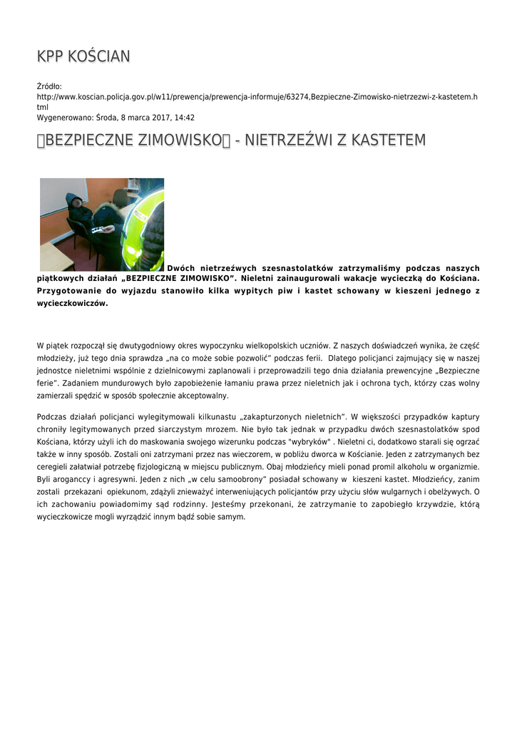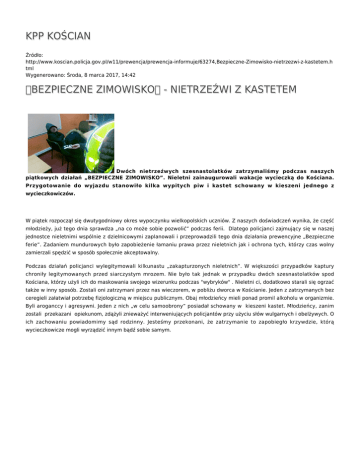 KPP KOŚCIAN Źródło: http://www.koscian.policja.gov.pl/w11/prewencja/prewencja-informuje/63274,Bezpieczne-Zimowisko-nietrzezwi-z-kastetem.h tml Wygenerowano: Środa, 8 marca 2017, 14:42 BEZPIECZNE ZIMOWISKO - NIETRZEŹWI Z KASTETEM Dwóch nietrzeźwych szesnastolatków zatrzymaliśmy podczas naszych piątkowych działań „BEZPIECZNE ZIMOWISKO”. Nieletni zainaugurowali wakacje wycieczką do Kościana. Przygotowanie do wyjazdu stanowiło kilka wypitych piw i kastet schowany w kieszeni jednego z wycieczkowiczów. W piątek rozpoczął się dwutygodniowy okres wypoczynku wielkopolskich uczniów. Z naszych doświadczeń wynika, że część młodzieży, już tego dnia sprawdza „na co może sobie pozwolić” podczas ferii. Dlatego policjanci zajmujący się w naszej jednostce nieletnimi wspólnie z dzielnicowymi zaplanowali i przeprowadzili tego dnia działania prewencyjne „Bezpieczne ferie”. Zadaniem mundurowych było zapobieżenie łamaniu prawa przez nieletnich jak i ochrona tych, którzy czas wolny zamierzali spędzić w sposób społecznie akceptowalny. Podczas działań policjanci wylegitymowali kilkunastu „zakapturzonych nieletnich”. W większości przypadków kaptury chroniły legitymowanych przed siarczystym mrozem. Nie było tak jednak w przypadku dwóch szesnastolatków spod Kościana, którzy użyli ich do maskowania swojego wizerunku podczas "wybryków" . Nieletni ci, dodatkowo starali się ogrzać także w inny sposób. Zostali oni zatrzymani przez nas wieczorem, w pobliżu dworca w Kościanie. Jeden z zatrzymanych bez ceregieli załatwiał potrzebę fizjologiczną w miejscu publicznym. Obaj młodzieńcy mieli ponad promil alkoholu w organizmie. Byli aroganccy i agresywni. Jeden z nich „w celu samoobrony” posiadał schowany w kieszeni kastet. Młodzieńcy, zanim zostali przekazani opiekunom, zdążyli znieważyć interweniujących policjantów przy użyciu słów wulgarnych i obelżywych. O ich zachowaniu powiadomimy sąd rodzinny. Jesteśmy przekonani, że zatrzymanie to zapobiegło krzywdzie, którą wycieczkowicze mogli wyrządzić innym bądź sobie samym. Ocena: 0/5 (0) Tweetnij