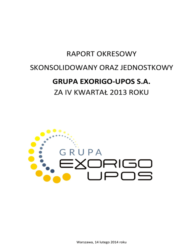 RAPORT OKRESOWY SKONSOLIDOWANY ORAZ JEDNOSTKOWY GRUPA EXORIGO-UPOS S.A. ZA IV KWARTAŁ 2013 ROKU Warszawa, 14 lutego 2014 roku Raport okresowy za IV kwartał 2013 r. Spis treści: 1. 2. 3. 4. 5. 6. 7. 8. 9. 10. 11. 12. PODSTAWOWE INFORMACJE O SPÓŁCE KWARTALNE SKRÓCONE SKONSOLIDOWANE SPRAWOZDANIE FINANSOWE KWARTALNE SKRÓCONE JEDNOSTKOWE SPRAWOZDANIE FINANSOWE INFORMACJE O ZASADACH PRZYJĘTYCH PRZY SPORZĄDZANIU RAPORTU, W TYM INFORMACJE O ZMIANACH STOSOWANYCH ZASAD (POLITYKI) RACHUNKOWOŚCI ISTOTNE DOKONANIA LUB NIEPOWODZENIA EMITENTA WRAZ Z OPISEM NAJWAŻNIEJSZYCH CZYNNIKÓW I ZDARZEO, W SZCZEGÓLNOŚCI O NIETYPOWYM CHARAKTERZE, MAJĄCYCH WPŁYW NA OSIĄGNIĘTE WYNIKI STANOWISKO DOTYCZĄCE MOŻLIWOŚCI ZREALIZOWANIA PROGNOZ OPIS STANU REALIZACJI DZIAŁAO I INWESTYCJI EMITENTA ORAZ HARMONOGRAMU ICH REALIZACJI INFORMACJE NA TEMAT AKTYWNOŚCI W ZAKRESIE INICJATYW NASTAWIONYCH NA WPROWADZENIE ROZWIĄZAO INNOWACYJNYCH W PRZEDSIĘBIORSTWIE W OBSZARZE ROZWOJU PROWADZONEJ DZIAŁALNOŚCI OPIS ORGANIZACJI GRUPY KAPITAŁOWEJ, ZE WSKAZANIEM JEDNOSTEK PODLEGAJĄCYCH KONSOLIDACJI WSKAZANIE PRZYCZYN NIESPORZĄDZANIA SKONSOLIDOWANYCH SPRAWOZDAO FINANSOWYCH INFORMACJA O STRUKTURZE AKCJONARIATU EMITENTA, ZE WSKAZANIEM AKCJONARIUSZY POSIADAJĄCYCH, NA DZIEO PRZEKAZANIA RAPORTU, CO NAJMNIEJ 5% GŁOSÓW NA WALNYM ZGROMADZENIU INFORMACJE DOTYCZĄCE LICZBY OSÓB ZATRUDNIONYCH PRZEZ EMITENTA, W PRZELICZENIU NA PEŁNE ETATY Warszawa, 14 lutego 2014 roku Strona 2 Raport okresowy za IV kwartał 2013 r. 1. PODSTAWOWE INFORMACJE O SPÓŁCE Siedziba Telefon Fax E-mail Strona internetowa NIP REGON Numer KRS wraz z organem prowadzącym rejestr Zarząd Rada Nadzorcza ul. Kolejowa 5/7, 01-217 Warszawa (+48) 22 12 20 400 (+48) 22 12 20 499 [email protected] www.exorigo-upos.pl 5252535950 146251737 Spółka jest wpisana do rejestru przedsiębiorców Krajowego Rejestru Sądowego prowadzonego przez Sąd Rejonowy dla miasta stołecznego Warszawy w Warszawie, XII Wydział Gospodarczy Krajowego Rejestru Sądowego pod numerem KRS 0000428347. Paweł Dudziuk Prezes Zarządu Andrzej Dudziuk Przewodniczący Rady Nadzorczej Jan Woźniak Wiceprzewodniczący Rady Nadzorczej Jarosław Kopaoski Członek Rady Nadzorczej Piotr Karmelita Członek Rady Nadzorczej Jacek Legutko Członek Rady Nadzorczej Na dzieo sporządzenia niniejszego raportu, kapitał zakładowy Spółki jest opłacony w całości i wynosi 73.800.000 zł. Składa się na niego 10.000.000 akcji o wartości nominalnej 7,38 zł każda: 9.002.214 akcji imiennych serii A, 997.786 akcji zwykłych serii B, Warszawa, 14 lutego 2014 roku Strona 3 Raport okresowy za IV kwartał 2013 r. 2. KWARTALNE SKRÓCONE SKONSOLIDOWANE SPRAWOZDANIE FINANSOWE 2.1. SKONSOLIDOWANY RACHUNEK ZYSKÓW I STRAT 01.10.2013 - 01.10.2012 - 01.01.2013 - 01.01.2012 Wyszczególnienie Przychody netto ze sprzedaży produktów, towarów i materiałów Przychody netto ze sprzedaży produktów 31.12.2013 31.12.2012 31.12.2013 31.12.2012 [tys. PLN] [tys. PLN] [tys. PLN] [tys. PLN] 31 797 31 099 102 787 102 010 24 347 20 236 82 374 74 896 7 450 10 863 20 413 27 114 -23 201 -24 217 -75 578 -77 535 -16 671 -15 035 -58 174 -55 417 -6 530 -9 182 -17 404 -22 118 8 596 6 882 27 209 24 475 -626 -731 -2 601 -2 880 Koszty ogólnego zarządu -3 646 -3 482 -14 714 -14 216 Zysk (strata) ze sprzedaży 4 324 2 669 9 894 7 379 123 26 323 435 11 6 77 150 112 20 246 285 -439 -307 -880 -918 72 -256 -200 -352 -511 -51 -680 -566 4 008 2 388 9 337 6 896 144 495 586 835 0 0 91 89 137 232 408 480 Zysk ze zbycia inwestycji 0 78 55 78 Aktualizacja wartości inwestycji 0 182 0 182 Inne 7 3 32 6 Koszty finansowe -73 -315 -206 -427 Odsetki -51 -157 -135 -173 0 26 0 -46 -22 -184 -71 -208 Zysk (strata) z działalności gospodarczej 4 079 2 568 9 717 7 304 Zysk (strata) brutto 4 079 2 568 9 717 7 304 Podatek dochodowy 2 300 -537 1 256 -1 480 Zysk (strata) netto 6 379 2 031 10 973 5 824 Przychody netto ze sprzedaży towarów i materiałów Koszty sprzedanych produktów, towarów i materiałów Koszt wytworzenia sprzedanych produktów Wartośd sprzedanych towarów i materiałów Zysk (strata) brutto ze sprzedaży Koszty sprzedaży Pozostałe przychody operacyjne Zysk ze zbycia niefinansowych aktywów trwałych Inne przychody operacyjne Pozostałe koszty operacyjne Aktualizacja wartości aktywów niefinansowych Inne koszty operacyjne Zysk (strata) z działalności operacyjnej Przychody finansowe Dywidendy i udziały w zyskach Odsetki Strata ze zbycia inwestycji Inne 2.2. SKONSOLIDOWANY BILANS Warszawa, 14 lutego 2014 roku Strona 4 Raport okresowy za IV kwartał 2013 r. Wyszczególnienie Aktywa trwałe 31.12.2013 31.12.2012 [tys. PLN] [tys. PLN] 12 456 13 279 Wartości niematerialne i prawne 2 683 3 285 Rzeczowe aktywa trwałe 5 831 4 631 635 3 946 3 307 1 417 42 891 31 900 3 737 4 021 Należności krótkoterminowe 26 596 20 046 Inwestycje krótkoterminowe 11 135 7 348 1 423 485 AKTYWA RAZEM 55 347 45 179 Kapitał (Fundusz) własny 36 229 29 459 Kapitał (fundusz) podstawowy 73 800 73 800 Kapitał (fundusz) zapasowy 14 099 13 671 -4 -1 111 111 -60 050 -63 946 Zysk (strata) netto 10 973 5 824 Odpisy z zysku netto w ciągu roku (wielkośd ujemna) -2 700 0 Zobowiązania i rezerwy na zobowiązania 19 118 15 720 4 761 3 456 493 927 Zobowiązania krótkoterminowe 9 814 8 073 Rozliczenia międzyokresowe 4 050 3 264 55 347 45 179 Inwestycje długoterminowe Długoterminowe rozliczenia międzyokresowe Aktywa obrotowe Zapasy Krótkoterminowe rozliczenia międzyokresowe Kapitał (fundusz) z aktualizacji wyceny Pozostałe kapitały (fundusze) rezerwowe Zysk (strata) lat ubiegłych Rezerwy na zobowiązania Zobowiązania długoterminowe PASYWA RAZEM Warszawa, 14 lutego 2014 roku Strona 5 Raport okresowy za IV kwartał 2013 r. 2.3. ZESTAWIENIE ZMIAN W SKONSOLIDOWANYM KAPITALE WŁASNYM 01.10.2013 - 01.10.2012 - 01.01.2013 - 01.01.2012 Wyszczególnienie 31.12.2013 31.12.2012 31.12.2013 31.12.2012 [tys. PLN] [tys. PLN] [tys. PLN] [tys. PLN] Kapitał (fundusz) własn