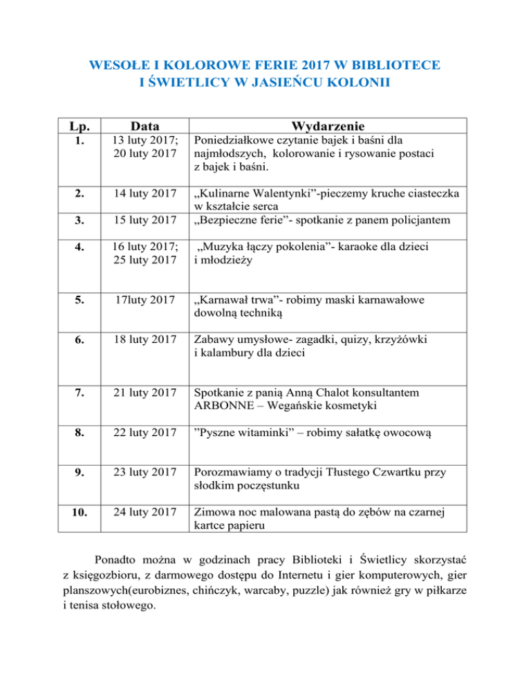 WESOŁE I KOLOROWE FERIE 2017 W BIBLIOTECE I ŚWIETLICY W JASIEŃCU KOLONII Lp. Data Wydarzenie 1. 13 luty 2017; 20 luty 2017 Poniedziałkowe czytanie bajek i baśni dla najmłodszych, kolorowanie i rysowanie postaci z bajek i baśni. 2. 14 luty 2017 3. 15 luty 2017 „Kulinarne Walentynki”-pieczemy kruche ciasteczka w kształcie serca „Bezpieczne ferie”- spotkanie z panem policjantem 4. 16 luty 2017; 25 luty 2017 „Muzyka łączy pokolenia”- karaoke dla dzieci i młodzieży 5. 17luty 2017 „Karnawał trwa”- robimy maski karnawałowe dowolną techniką 6. 18 luty 2017 Zabawy umysłowe- zagadki, quizy, krzyżówki i kalambury dla dzieci 7. 21 luty 2017 Spotkanie z panią Anną Chalot konsultantem ARBONNE – Wegańskie kosmetyki 8. 22 luty 2017 ”Pyszne witaminki” – robimy sałatkę owocową 9. 23 luty 2017 Porozmawiamy o tradycji Tłustego Czwartku przy słodkim poczęstunku 10. 24 luty 2017 Zimowa noc malowana pastą do zębów na czarnej kartce papieru Ponadto można w godzinach pracy Biblioteki i Świetlicy skorzystać z księgozbioru, z darmowego dostępu do Internetu i gier komputerowych, gier planszowych(eurobiznes, chińczyk, warcaby, puzzle) jak również gry w piłkarze i tenisa stołowego.