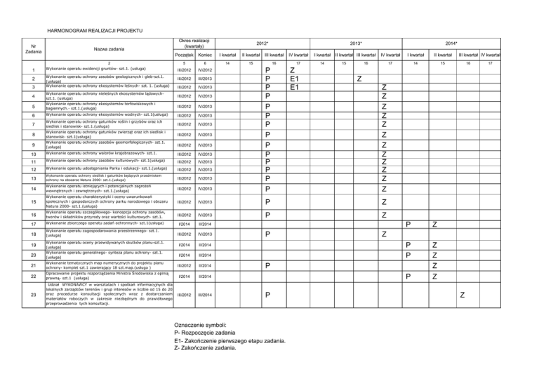 HARMONOGRAM REALIZACJI PROJEKTU Nr Zadania Nazwa zadania 2 Wykonanie operatu ewidencji gruntów- szt.1. (usługa) Okres realizacji (kwartały) 2012* 2013* Początek Koniec I kwartał II kwartał III kwartał IV kwartał I kwartał 5 6 14 15 16 17 14 III/2012 IV/2012 III/2012 III/2013 III/2012 IV/2013 III/2012 IV/2013 III/2012 IV/2013 II kwartał III kwartał 15 IV kwartał I kwartał II kwartał 17 14 15 16 10 Wykonanie operatu ochrony walorów krajobrazowych- szt.1. III/2012 IV/2013 11 Wykonanie operatu ochrony zasobów kulturowych- szt.1(usługa) III/2012 IV/2013 12 Wykonanie operatu udostępniania Parku i edukacji- szt.1.(usługa) III/2012 IV/2013 13 Wykonanie operatu ochrony siedlisk i gatunków będących przedmiotem ochrony na obszarze Natura 2000- szt.1.(usługa) III/2012 IV/2013 14 Wykonanie operatu istniejących i potencjalnych zagrożeń wewnętrznych i zewnętrznych- szt.1.(usługa) III/2012 IV/2013 P P P P P P P P P P P P P P 15 Wykonanie operatu charakterystyki i oceny uwarunkowań społecznych i gospodarczych ochrony parku narodowego i obszaru Natura 2000- szt.1.(usługa) III/2012 IV/2013 P Z 16 Wykonanie operatu szczegółowego- koncepcja ochrony zasobów, tworów i składników przyrody oraz wartości kulturowych- szt.1. III/2012 IV/2013 P Z 17 Wykonanie zbiorczego operatu zadań ochronnych- szt.1(usługa) I/2014 II/2014 18 Wykonanie operatu zagospodarowania przestrzennego- szt.1. (usługa) III/2012 IV/2013 I/2014 II/2014 I/2014 II/2014 III/2012 II/2014 I/2014 II/2014 III/2012 III/2014 1 2 3 Wykonanie operatu ochrony zasobów geologicznych i gleb-szt.1. (usługa) Wykonanie operatu ochrony ekosystemów leśnych- szt. 1. (usługa) 5 Wykonanie operatu ochrony nieleśnych ekosystemów lądowychszt.1. (usługa) Wykonanie operatu ochrony ekosystemów torfowiskowych i bagiennych.- szt.1.(usługa) 6 Wykonanie operatu ochrony ekosystemów wodnych- szt.1(usługa) III/2012 IV/2013 7 Wykonanie operatu ochrony gatunków roślin i grzybów oraz ich siedlisk i stanowisk- szt.1.(usługa) III/2012 IV/2013 III/2012 IV/2013 III/2012 IV/2013 4 8 9 Wykonanie operatu ochrony gatunków zwierząt oraz ich siedlisk i stanowisk- szt.1(usługa) Wykonanie operatu ochrony zasobów geomorfologicznych- szt.1. (usługa) 20 Wykonanie operatu oceny przewidywanych skutków planu-szt.1. (usługa) Wykonanie operatu generalnego- synteza planu ochrony- szt.1. (usługa) 21 Wykonanie tematycznych map numerycznych do projektu planu ochrony- komplet szt.1 zawierający 18 szt.map.(usługa ) 22 Opracowanie projektu rozporządzenia Ministra Środowiska z opinią prawną- szt.1 (usługa) 23 Udział WYKONAWCY w warsztatach i spotkań informacyjnych dla lokalnych zarządców terenów i grup interesów w liczbie od 15 do 20 oraz procedurze konsultacji społecznych wraz z dostarczaniem materiałów roboczych w zakresie niezbędnym do prawidłowego przeprowadzenia tych konsultacji. 19 P Z E1 E1 2014* Z Z Z Z Z Z Z Z Z Z Z Z P Z P P Z Z Z Z Z P Oznaczenie symboli: P- Rozpoczęcie zadania E1- Zakończenie pierwszego etapu zadania. Z- Zakończenie zadania. 16 Z P P III kwartał IV kwartał Z 17