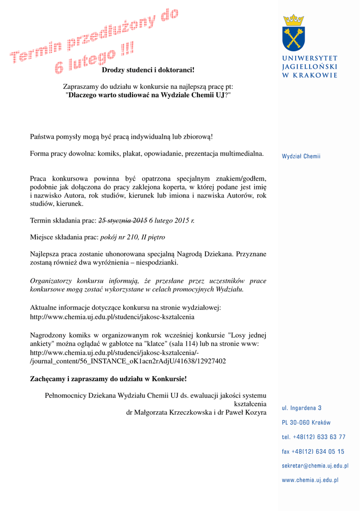 Drodzy studenci i doktoranci! Zapraszamy do udziału w konkursie na najlepszą pracę pt: "Dlaczego warto studiować na Wydziale Chemii UJ?" Państwa pomysły mogą być pracą indywidualną lub zbiorową! Forma pracy dowolna: komiks, plakat, opowiadanie, prezentacja multimedialna. Praca konkursowa powinna być opatrzona specjalnym znakiem/godłem, podobnie jak dołączona do pracy zaklejona koperta, w której podane jest imię i nazwisko Autora, rok studiów, kierunek lub imiona i nazwiska Autorów, rok studiów, kierunek. Termin składania prac: 25 stycznia 2015 6 lutego 2015 r. Miejsce składania prac: pokój nr 210, II piętro Najlepsza praca zostanie uhonorowana specjalną Nagrodą Dziekana. Przyznane zostaną również dwa wyróżnienia – niespodzianki. Organizatorzy konkursu informują, że przesłane przez uczestników prace konkursowe mogą zostać wykorzystane w celach promocyjnych Wydziału. Aktualne informacje dotyczące konkursu na stronie wydziałowej: http://www.chemia.uj.edu.pl/studenci/jakosc-ksztalcenia Nagrodzony komiks w organizowanym rok wcześniej konkursie "Losy jednej ankiety" można oglądać w gablotce na "klatce" (sala 114) lub na stronie www: http://www.chemia.uj.edu.pl/studenci/jakosc-ksztalcenia//journal_content/56_INSTANCE_oK1acn2rAdjU/41638/12927402 Zachęcamy i zapraszamy do udziału w Konkursie! Pełnomocnicy Dziekana Wydziału Chemii UJ ds. ewaluacji jakości systemu kształcenia dr Małgorzata Krzeczkowska i dr Paweł Kozyra