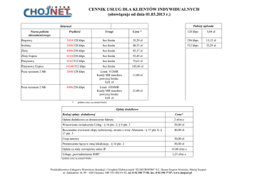 CENNIK USŁUG DLA KLIENTÓW INDYWIDUALNYCH (obowiązuje od dnia 01.03.2013 r.) Pakiety uploadu Internet Nazwa pakietu abonamentowego Prędkość Uwagi Cena * 128 kbps 5,04 zł Brązowy 1024/128 kbps bez limitu 35,29 zł 256 kbps 15,12 zł Srebrny 2048/128 kbps bez limitu 40,33 zł 512 kbps 35,29 zł Złoty 4096/256 kbps bez limitu 45,37 zł Złoty Expres 6144/256 kbps bez limitu 55,45 zł Platynowy 8192/512 kbps bez limitu 75,61 zł Platynowy Expres 10240/512 kbps bez limitu 105,86 zł Poza sezonem 2 Mb 2048/128 kbps Limit: 512MB Każdy MB transferu powyżej limitu: 0,01 zł Poza sezonem 2 Mb 4096/256 kbps • Limit: 1024MB Każdy MB transferu powyżej limitu: 0,01 zł 11,00 zł 21,00 zł podane ceny są cenami brutto Opłaty dodatkowe Rodzaj opłaty dodatkowej Cena* Opłata dodatkowa za dostarczenie faktury 2 zł/m-c Wznowienie świadczenia Usług - § 16 pkt. 2; § 8 pkt. 3 50,00 zł Bezzasadne wezwanie ekipy technicznej, awaria z winy Abonenta - § 17 pkt. 6; § 17 pkt. 5 40,00 zł Cesja umowy 30,00 zł Przeniesienie łącza w inną lokalizację - § 16 pkt. 2 50,00 zł Opłata za stały zewnętrzny adres IP 15,00 zł/m-c Usługa „powiadomienia SMS” 1,23 zł/m-c * podane ceny są cenami brutto Przedsiębiorstwo Usługowo Wytwórcze Instalacji i Urządzeń Elektrycznych “ELEKTROPIM” S.C. Hanna Szypryt-Nowicka, Maciej Szypryt ul. Zakładowa 18, 89 – 620 Chojnice, NIP 555-202-81-92, tel. 0-52 396 77 85, fax. 0-52 396 77 87, www.chojnet.pl