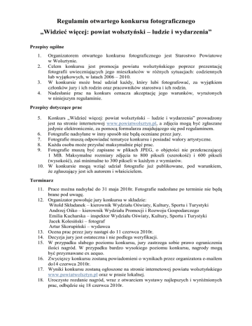 Regulamin otwartego konkursu fotograficznego „Widzieć więcej: powiat wolsztyński – ludzie i wydarzenia” Przepisy ogólne 1. 2. 3. 4. Organizatorem otwartego konkursu fotograficznego jest Starostwo Powiatowe w Wolsztynie. Celem konkursu jest promocja powiatu wolsztyńskiego poprzez prezentację fotografii uwieczniających jego mieszkańców w róŜnych sytuacjach: codziennych lub wyjątkowych, w latach 2006 – 2010. W konkursie moŜe brać udział kaŜdy, który lubi fotografować, za wyjątkiem członków jury i ich rodzin oraz pracowników starostwa i ich rodzin. Nadesłanie prac na konkurs oznacza akceptację jego warunków, wyraŜonych w niniejszym regulaminie. Przepisy dotyczące prac 5. Konkurs „Widzieć więcej: powiat wolsztyński – ludzie i wydarzenia” prowadzony jest na stronie internetowej www.powiatwolsztyn.pl, a zdjęcia mogą być zgłaszane jedynie elektronicznie, za pomocą formularza znajdującego się pod regulaminem. 6. Fotografie nadsyłane w inny sposób nie będą oceniane przez jury. 7. Fotografie muszą odpowiadać tematyce konkursu i posiadać walory artystyczne. 8. KaŜda osoba moŜe przysłać maksymalnie pięć prac. 9. Fotografie muszą być zapisane w plikach JPEG, o objętości nie przekraczającej 1 MB. Maksymalne rozmiary zdjęcia to 800 pikseli (szerokość) i 600 pikseli (wysokość), zaś minimalne to 300 pikseli w kaŜdym z wymiarów. 10. W konkursie mogą wziąć udział fotografie juŜ publikowane, pod warunkiem, Ŝe zgłaszający jest ich autorem i właścicielem. Terminarz 11. Prace moŜna nadsyłać do 31 maja 2010r. Fotografie nadesłane po terminie nie będą brane pod uwagę. 12. Organizator powołuje jury konkursu w składzie: Witold Składanek – kierownik Wydziału Oświaty, Kultury, Sportu i Turystyki Andrzej Ośko – kierownik Wydziału Promocji i Rozwoju Gospodarczego Emilia Kucharska – inspektor Wydziału Oświaty, Kultury, Sportu i Turystyki Jacek Kolesiński – fotograf Artur Skorupiński – wydawca 13. Ocena prac przez jury nastąpi do 11 czerwca 2010r. 14. Decyzja jury jest ostateczna i nie podlega weryfikacji. 15. W przypadku słabego poziomu konkursu, jury zastrzega sobie prawo ograniczenia ilości nagród. W przypadku bardzo wysokiego poziomu konkursu, nagrody mogą być przyznawane ex aequo. 16. Zwycięzcy konkursu zostaną powiadomieni o wynikach przez organizatora e-mailem do14 czerwca 2010r. 17. Wyniki konkursu zostaną ogłoszone na stronie internetowej powiatu wolsztyńskiego www.powiatwolsztyn.pl oraz w prasie lokalnej. 18. Uroczyste rozdanie nagród, wraz z otwarciem wystawy najlepszych i wyróŜnionych prac, odbędzie się 18 czerwca 2010r. Nagrody 19. Organizator konkursu przewiduje następujące nagrody: I – II – III – IV – V – 600 zł 500 zł 400 zł 300 zł 200 zł Korzystanie z prac nagrodzonych i wyróŜnionych 20. Organizator uzyskuje prawo do umieszczania nadesłanych prac (oznaczonych imieniem i nazwiskiem autora) na stronie www.powiatwolsztyn.pl oraz w lokalnej prasie, a takŜe do wielokrotnej ekspozycji. 21. Organizator uzyskuje prawo do wielokrotnego umieszczania prac (oznaczonych imieniem i nazwiskiem autora) na wydawanych przez siebie materiałach promocyjnych i publikacjach. 22. Organizator uzyskuje prawo do łączenia fotografii z innymi fotografiami oraz utworami audio lub video, przerabiania i modyfikowania fotografii, w szczególności poprzez obróbkę cyfrową, zmianę barw, kadrowanie. 23. Uprawnienia, o których mowa powyŜej, przysługują organizatorowi nieodpłatnie, nie są ograniczone czasowo i terytorialne. Organizator uzyskuje uprawnienia na podstawie elektronicznych oświadczeń złoŜonych przez autorów zdjęć, a wymaganych w formularzu zgłoszeniowym do konkursu. Więcej informacji o konkursie udziela Emilia Kucharska, inspektor Wydziału Oświaty, Kultury, Sportu i Turystyki Starostwa Powiatowego w Wolsztynie tel: (068) 384 56 28, e-mail: [email protected]