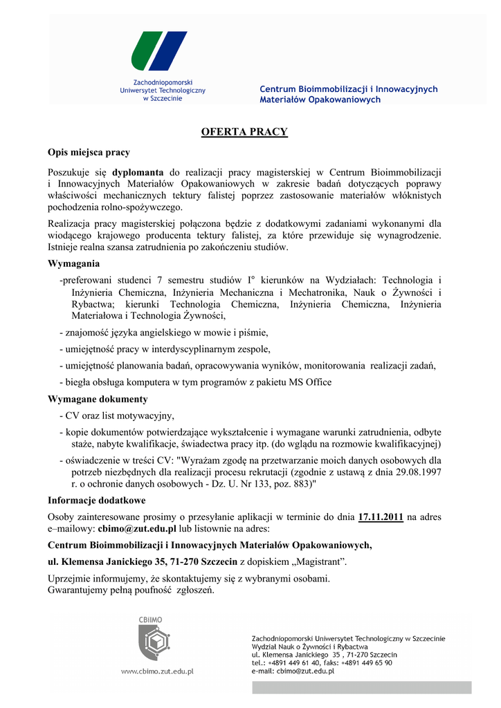 OFERTA PRACY Opis miejsca pracy Poszukuje się dyplomanta do realizacji pracy magisterskiej w Centrum Bioimmobilizacji i Innowacyjnych Materiałów Opakowaniowych w zakresie badań dotyczących poprawy właściwości mechanicznych tektury falistej poprzez zastosowanie materiałów włóknistych pochodzenia rolno-spożywczego. Realizacja pracy magisterskiej połączona będzie z dodatkowymi zadaniami wykonanymi dla wiodącego krajowego producenta tektury falistej, za które przewiduje się wynagrodzenie. Istnieje realna szansa zatrudnienia po zakończeniu studiów. Wymagania -preferowani studenci 7 semestru studiów I° kierunków na Wydziałach: Technologia i Inżynieria Chemiczna, Inżynieria Mechaniczna i Mechatronika, Nauk o Żywności i Rybactwa; kierunki Technologia Chemiczna, Inżynieria Chemiczna, Inżynieria Materiałowa i Technologia Żywności, - znajomość języka angielskiego w mowie i piśmie, - umiejętność pracy w interdyscyplinarnym zespole, - umiejętność planowania badań, opracowywania wyników, monitorowania realizacji zadań, - biegła obsługa komputera w tym programów z pakietu MS Office Wymagane dokumenty - CV oraz list motywacyjny, - kopie dokumentów potwierdzające wykształcenie i wymagane warunki zatrudnienia, odbyte staże, nabyte kwalifikacje, świadectwa pracy itp. (do wglądu na rozmowie kwalifikacyjnej) - oświadczenie w treści CV: "Wyrażam zgodę na przetwarzanie moich danych osobowych dla potrzeb niezbędnych dla realizacji procesu rekrutacji (zgodnie z ustawą z dnia 29.08.1997 r. o ochronie danych osobowych - Dz. U. Nr 133, poz. 883)" Informacje dodatkowe Osoby zainteresowane prosimy o przesyłanie aplikacji w terminie do dnia 17.11.2011 na adres e–mailowy: [email protected] lub listownie na adres: Centrum Bioimmobilizacji i Innowacyjnych Materiałów Opakowaniowych, ul. Klemensa Janickiego 35, 71-270 Szczecin z dopiskiem „Magistrant”. Uprzejmie informujemy, że skontaktujemy się z wybranymi osobami. Gwarantujemy pełną poufność zgłoszeń.
