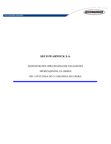 SECO/WARWICK S.A. JEDNOSTKOWE SPRAWOZDANIE FINANSOWE SPORZĄDZONE ZA OKRES OD 1 STYCZNIA DO 31 GRUDNIA 2012 ROKU SPIS TREŚCI JEDNOSTKOWE SPRAWOZDANIE FINANSOWE SPORZĄDZONE ZA OKRES OD 1 STYCZNIA DO 31 GRUDNIA 2012 ROKU………………………………………………...………………………...1 1. Informacje ogólne…………….…………………………………………...……………………4 2. Wybrane dane finansowe przeliczone na EUR………………………………………..…….....8 3. Oświadczenie Zarządu….……………………………………………………...……………….9 JEDNOSTKOWE SPRAWOZDANIE FINANSOWE ZA OKRES OD 1 STYCZNIA DO 31 GRUDNIA 2012 SPORZĄDZONE WEDŁUG MIĘDZYNARODOWYCH STANDARDÓW SPRAWOZDAWCZOŚCI FINANSOWEJ…...……………………………………………….………...10 Jednostkowe Sprawozdanie z Sytuacji Finansowej……………………….…….………….........11 Jednostkowe Sprawozdanie z Całkowitych Dochodów…………………………………………13 Jednostkowe Sprawozdanie z Przepływów Pieniężnych…………………..…………………….14 Jednostkowe Sprawozdanie ze Zmian w Kapitale Własnym……………………………….........16 INFORMACJA DODATKOWA DO JEDNOSTKOWEGO SPRAWOZDANIA FINANSOWEGO ZAKOŃCZONEGO 31 GRUDNIA 2012 ROKU……………………………………...…………….….17 I. II. Zgodność z Międzynarodowymi Standardami Sprawozdawczości Finansowej………….18 Założenie kontynuacji działalności gospodarczej i porównywalność sprawozdań finansowych………………………………………………………………………………18 III. Opis przyjętych zasad (polityki) rachunkowości, w tym metod wyceny aktywów i pasywów oraz przychodów i kosztów……………………………………………..…….18 IV. Istotne wartości oparte na profesjonalnym osądzie i szacunkach………………………...25 V. Zmiany zasad (polityki) rachunkowości……………………………………………...…..27 VI. Nowe standardy oczekujące na wdrożenie przez jednostkę……………………………....27 DODATKOWE NOTY I OBJAŚNIENIA DO SPRAWOZDANIA FINANSOWEGO ZAKOŃCZONEGO 31 GRUDNIA 2012 ROKU………………………………………………..……31 1. Przychody ze sprzedaży………..……………………………………………………………...32 2. Segmenty operacyjne….……………………………………………………..………………..32 3. Koszty działalności operacyjnej………………………………..……………………….…….32 4. Pozostałe przychody i koszty operacyjne.……………………………………………………33 5. Przychody i koszty finansowe…………….….…………….….…………….….…………….….….34 6. Podatek dochodowy i odroczony podatek dochodowy…………….….…………….….…………35 7. Aktywa przeznaczone do sprzedaży…………………………………………………………..37 8. Dywidendy zaproponowane lub uchwalone……………………...…………………………...37 9. Rzeczowe aktywa trwałe ……….…………………………………………………..………...38 10. Wartości niematerialne...………………………………..………………………..……….......42 11. Nieruchomości inwestycyjne………………………………..………………..……………….45 12. Inwestycje w jednostkach zależnych, współzależnych i stowarzyszonych...…….....………...46 13. Test na utratę wartości………………………………………………………………………...48 14. Zapasy…………………………………………………………………………………………49 15. Kontrakty długoterminowe……………………………………………………………………50 16. Należności handlowe oraz pozostałe należności…………………………………..………….50 17. Pozostałe aktywa i zobowiązania finansowe.…………………………………………………52 18. Rozliczenia międzyokresowe…………………………………………………………………55 19. Środki pieniężne i ich ekwiwalenty ………………..…………………………………………55 20. Kapitał podstawowy i kapitały zapasowe/rezerwowe ..……………………..……………..…55 21. Niepodzielony wynik finansowy…..…………..…………………………..……………….…57 22. Zobowiązania finansowe i pozostałe zobowiązania ..……………………..……………….…57 23. Zobowiązania z tytułu dostaw i usług oraz pozostałe zobowiązania…………………………61 24. Rezerwy…………………….……………………….…………………….………………..…65 2 25. Leasing..…………………….……………………….…………………….………………..…67 26. Rozliczenia międzyokresowe przychodów……………………………………………………67 27. Objaśnienia do rachunku przepływów pieniężnych…………………………………………..68 28. Informacje o podmiotach powiązanych……………………………………………………….69 29. Wynagrodzenie kluczowego personelu……………………………………………………….70 30. Aktywa finansowe…..……………………………………………...…………………………72 31. Struktura zatrudnienia….....….……………………….…… …………………………………73 32. Cele i polityka zarządzania ryzykiem finansowym …………………………………………..73 33. Opcje Managerskie………………………………………………………………………