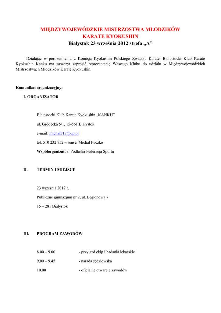 MIĘDZYWOJEWÓDZKIE MISTRZOSTWA MŁODZIKÓW KARATE KYOKUSHIN Białystok 23 września 2012 strefa „A” Działając w porozumieniu z Komisją Kyokushin Polskiego Związku Karate, Białostocki Klub Karate Kyokushin Kanku ma zaszczyt zaprosić reprezentację Waszego Klubu do udziału w Międzywojewódzkich Mistrzostwach Młodzików Karate Kyokushin. Komunikat organizacyjny: I. ORGANIZATOR Białostocki Klub Karate Kyokushin „KANKU” ul. Gródecka 5/1, 15-561 Białystok e-mail: [email protected] tel: 510 232 752 – sensei Michał Puczko Współorganizator: Podlaska Federacja Sportu II. TERMIN I MIEJSCE 23 września 2012 r. Publiczne gimnazjum nr 2, ul. Legionowa 7 15 – 281 Białystok III. PROGRAM ZAWODÓW 8.00 – 9.00 - przyjazd ekip i badania lekarskie 9.00 – 9.45 - narada sędziowska 10.00 - oficjalne otwarcie zawodów IV. KATEGORIE 1. Zawody będą rozgrywane wg przepisów i regulaminu PZK w następujących konkurencjach: - Kumite semi kontakt Młodzik (rocznik 1997 – 1998) 14 - 15 lat - Kumite semi kontakt Młodziczek (rocznik 1997 – 1998) 14 - 15 lat - Kumite light kontakt Młodzik - Kumite light kontakt Młodziczek - Kata Młodzików - Kata Młodziczek - Walki reżyserowane Młodzików i Młodziczek 2. Konkurencje kumite zostaną rozegrane w systemie pucharowym w następujących kategoriach: A. Semi kontakt - Młodzicy: kategoria -55, -65, +65 kg - Młodziczki: kategoria -50, +50 kg B. Light kontakt - Młodzicy: kategoria open - Młodziczki: kategoria open 3. Konkurencja kata zostanie rozegrana w dwóch turach: - tura I - obowiązkowa, zawodnik wykonuje kata podane przez sędziego - tura II - zawodnik wykonuje kata dowolna z wymienionych dla tej tury: KATEGORIA Młodzicy/Młodziczki I TURA Taikyoku Sono San Sokugi Sono Ni Pinian Sono Ich II TURA Pinian Sono Ni Pinian Sono San Kihon Sono Ni Pinian Sono Yon Sokugi Sono San Tuki No Kata 4. Walki reżyserowane - Młodzicy i Młodziczki razem V. WARUNKI UCZESTNICTWA 1. W zawodach mogą wziąć udział ekipy składające się z dowolnej liczby zawodników w danej konkurencji. UWAGA! Zawodnicy mogą startować tylko w jednej konkurencji kumite (semi lub light). 2. Do startu dopuszczeni będą zawodnicy zgłoszeni przez kluby posiadające aktualną licencję PZK i posiadający: - aktualną kartę zdrowia sportowca - licencję zawodnika PZK - legitymację szkolną - białe ochraniacze (wg przepisów PZK semi kontakt Karate Kyokushin), organizator zapewnia kaski bez osłony brody i pancerze ochronne typu hogo - uiszczoną opłatę startową - zgodę rodziców lub opiekunów prawnych (wzór w załączniku) VI. ZGŁOSZENIA 1. Załączoną Kartę zgłoszenia zawodników prosimy przesłać w nieprzekraczalnym terminie do dnia 20.09.2012 r. (czwartek) pocztą elektroniczną na adres: [email protected] UWAGA! Losowanie zawodników odbędzie się w dniu 21.09.1012 r. na podstawie nadesłanych zgłoszeń. W trosce o sprawne przeprowadzenie turnieju zgłoszenia przesłane po terminie nie będą rozpatrywane. Jeżeli zawodnik nie będzie miał właściwej wagi lub z innych powodów nie zostanie zweryfikowany pozytywnie - zostanie skreślony z listy uczestników. 2. Opłatę startową w wysokości 30 zł/osoba należy uiścić w dniu zawodów. VII. POSTANOWIENIA KOŃCOWE 1. Sędzią głównym zawodów jest Shihan Jacek Czerniec 5 Dan. 2. W sprawach nieobjętych regulaminem decyduje Sędzia Główny i Organizator. 3. Składy sędziowskie zostaną powołane przez Sędziego Głównego w dniu zawodów. 4. Jeśli zawodnik w dniu turnieju będzie ważył więcej niż wynosi limit kategorii do jakiej został zgłoszony lub nie będzie miał uiszczonej opłaty startowej zostanie skreślony z listy uczestników. 5. Wstęp na zawody jest bezpłatny. 6. Zwycięzcy I, II i III miejsca otrzymają medale i dyplomy (nie będzie walki o III miejsce). 7. Kierownik Klubu zobowiązany jest do sędziowania zawodów, w tym celu powinien posiadać odpowiedni strój zgodny z wymogami PZK (czarna koszula, biała muszka, czarne spodnie, opcjonalnie białe skarpetki i gwizdek) Organizatorzy Międzywojewódzkich Mistrzostw Młodzików Karate Kyokushin życzą sportowych sukcesów i miłego pobytu w Białymstoku. Organizator MIĘDZYWOJEWÓDZKIE MISTRZOSTWA MŁODZIKÓW KARATE KYOKUSHIN Białystok 23 września 2012 strefa „A” Karta zgłoszenia zawodników Klub:…………………………………………………………………………………………………. Kierownik Klubu:…………………………………………………………………………………… Lp. Nazwisko Imię Data ur Numer Licencji Kyu Konkurencja 1 Kumite semi kontakt Młodzik -55kg 2 Kumite semi kontakt Młodzik -65kg 3 Kumite semi kontakt Młodzik +65kg 4 Kumite semi kontakt Młodziczki -50kg 5 Kumite semi kontakt Młodziczki +50kg 6 Kumite light kontakt Młodzicy Open 7 Kumite light kontakt Młodziczki Open 8 Kata Młodzików 9 Kata Młodzików 10 Walki reżyserowane Młodzików i Młodziczek Opłata startowa: 30zł x ……………………. = ……………………….. ……………………………. podpis księgowego ……………………………. podpis prezesa klubu