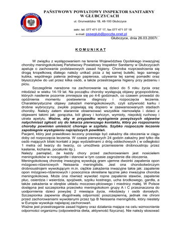 PAŃSTWOWY POWIATOWY INSPEKTOR SANITARNY W GŁUBCZYCACH ul. Grunwaldzka 1B, 48-100 Głubczyce sekr. tel. 077 471 07 17, fax 077 471 07 18 e-mail: [email protected] Głubczyce, dnia 26.03.2007r. KOMUNIKAT W związku z występowaniem na terenie Województwa Opolskiego inwazyjnej choroby meningokokowej Państwowy Powiatowy Inspektor Sanitarny w Głubczycach apeluje o zachowanie podstawowych zasad higieny. Choroba rozprzestrzenia się drogą kropelkową dlatego naleŜy unikać picia z tej samej butelki, tego samego kubka, wspólnego palenia jednego papierosa, uŜywania tej samej pomadki oraz błyszczyków do ust przez kilka osób, a takŜe przestrzegania higieny przy jedzeniu i piciu. Szczególnie naraŜone na zachorowanie są dzieci do 5 roku Ŝycia oraz młodzieŜ w wieku 14-19 lat. Na początku choroby występują objawy grypopodobne, których nasilenie pozornie zmniejsza się po 4-6 godzinach, co czasem prowadzi do opóźnienia momentu postawienia diagnozy i rozpoczęcia leczenia. Charakterystyczne objawy zakaŜeń meningokokowych, czyli sztywność karku i drobne wybroczyny, zwykle pojawiają się dopiero w zaawansowanych stadiach choroby. NaleŜy zatem starannie obserwować wszystkie niemowlęta i dzieci z objawami takimi jak: gorączka, ból głowy i kończyn, wymioty, niepokój ruchowy i utrata apetytu. WaŜne, aby w przypadku wystąpienia powyŜszych objawów natychmiast zgłosić się do lekarza pierwszego kontaktu, który po rozpoznaniu choroby powinien umieścić chorego w szpitalu. Szybko rozpoczęte leczenie zapobiegnie wystąpieniu najcięŜszych powikłań. Pacjent, który jest prawidłowo leczony przestaje być zakaźny dla otoczenia w ciągu doby od rozpoczęcia leczenia. W czasie pierwszych 24 godzin zakaźny jest tylko dla osób mających bliski kontakt z jego wydzielinami z dróg oddechowych ( w odległości 1 metra od twarzy do twarzy, co umoŜliwia przeniesienie drobnoustroju przez kasłanie, kichanie, pocałunki itp.). NaleŜy pamiętać, Ŝe kaŜdy chory przed zachorowaniem jest nosicielem meningokoków w nosogardle i stanowi w tym czasie zagroŜenie dla otoczenia. Meningokokową chorobę inwazyjną wywołują gram ujemne dwoinki zapalenia opon mózgowo-rdzeniowych Neisseria meningitidis. Jest ona chorobotwórczym drobnoustrojem wywołującym m.in. cięŜkie zakaŜenia inwazyjne takie jak: zapalenie opon mózgowo-rdzeniowych i posocznica określane łącznie jako inwazyjna choroba meningokokowa. MoŜe ona równieŜ wywołać ropne zapalenie stawów, zapalenie płuc, osierdzia i wsierdzia, spojówek, szpiku kostnego, ucha środkowego, gardła, a takŜe zakaŜenia w obrębie układu moczowo-płciowego i miednicy małej. W Polsce dostępna jest szczepionka przeciwko meningokokom grupy A i C przeznaczona do uodpornienia dzieci powyŜej 2 miesiąca Ŝycia, młodzieŜy i osób dorosłych. Szczepionka zapewnia długotrwałą odporność poszczepienną, jednak nie chroni przed zachorowaniami wywołanymi przez typ B Neisseria meningitidis, który niestety w Europie wywołuje najwięcej zachorowań. WaŜne jest przestrzeganie zasad higieny oraz działania mające na celu wzmocnienie odporności organizmu (odpowiednia dieta, aktywność fizyczna). Nie naleŜy stosować antybiotykoterapii bez uzasadnienia, poniewaŜ osłabiamy w ten sposób naturalne mechanizmy obronne ustroju, m.in. niszcząc fizjologiczną florę bakteryjną. Państwowa Inspekcja Sanitarna poprzez Powiatowe Stacje SanitarnoEpidemiologiczne po zgłoszeniu przez lekarza podejrzenia wystąpienia choroby meningokokowej obejmie nadzorem epidemiologicznym osoby z najbliŜszego otoczenia chorego. W kaŜdym przypadku zakaŜenia meningokokowego lekarz sprawujący opiekę nad osobami z bezpośredniego kontaktu z chorym powinien: - pobrać wymaz z noso-gardzieli i przesłać materiał na badanie do najbliŜszej Wojewódzkiej Stacji Sanitarno-Epidemiologicznej; - rozpocząć moŜliwie najszybciej chemioprofilaktykę (najlepiej w ciągu 24 godzin) nie czekając na wyniki badania Więcej informacji moŜna uzyskać odwiedzając następujące strony internetowe: - Światowa Organizacja Zdrowia www.who.int - Europejskie Centrum Zapobiegania i Kontroli Chorób www.ecdc.en.int - Państwowy Zakład Higieny www.pzh.gov.pl - MediWeb.pl www.mediweb.pl