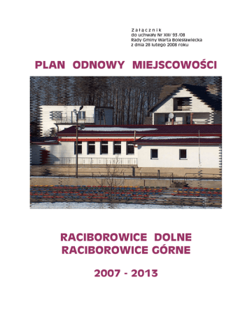 Załącznik do uchwały Nr XIII/ 93 /08 Rady Gminy Warta Bolesławiecka z dnia 28 lutego 2008 roku PLAN ODNOWY MIEJSCOWOŚCI RACIBOROWICE DOLNE RACIBOROWICE GÓRNE 2007 - 2013 Plan Odnowy Miejscowości / Raciborowice Dolne i Górne / 2007 – 2013 gmina Warta Bolesławiecka/powiat bolesławiecki/województwo dolnośląskie SPIS TREŚCI WSTĘP I. ZGODNOŚĆ I SPÓJNOŚĆ PLANU ODNOWY MIEJSCOWOŚCI RACIBOROWICE DOLNE I GÓRNE Z DOKUMENTAMI STRATEGICZNYMI II. OGÓLNA CHARAKTERYSTYKA MIEJSCOWOŚCI 1. LOKALIZACJA 2. HISTORIA 3. CHARAKTERYSTYKA STANU OBECNEGO 3.1. Morfologia i walory krajobrazowe 3.2. Ludność 3.3. Podmioty gospodarcze 3.4. Struktura bezrobocia 4. INWENTARYZACJA ZASOBÓW MIEJSCOWOŚCI 4.1. infrastruktura techniczna; 4.2. kultura, oświata , sport; 4.3. opieka zdrowotna; 4.4. inne instytucje obsługi mieszkańców; 4.5.organizacje społeczne 4.6. rekreacja i turystyka 4.7. tereny inwestycyjne III. ANALIZA SWOT IV. IDENTYFIKACJA WYSTĘPUJĄCYCH PROBLEMÓW V. OPIS I UZASADNIENIE PROJEKTU VI. PRZEDMIOT PROJEKTU VII. CELE PROJEKTU VIII. OCZEKIWANE REZULTATY IX. PARTNERZY X. ZARZĄDZANIE I MONITORING XI. HARMONOGRAM REALIZACJI PRZEDSIĘWZIĘĆ UJĘTYCH W PLANIE ODNOWY MIEJSCOWOŚCI RACIOROWICE DOLNE I GÓRNE 2 Plan Odnowy Miejscowości / Raciborowice Dolne i Górne / 2007 – 2013 gmina Warta Bolesławiecka/powiat bolesławiecki/województwo dolnośląskie WSTĘP Idea powstania Planu Odnowy Miejscowości Raciborowice Dolne i Raciborowice Górne narodziła się w momencie skonkretyzowania potrzeb i marzeń społeczności lokalnej. Dokument ten stanowić ma charakterystykę i wizję rozwoju miejscowości uwzględniający zgłaszane przez mieszkańców wsi problemy i propozycje poprawy warunków życia społeczności lokalnej. Zaangażowanie , wzrost społecznej świadomości zaowocowało podjętą decyzją o opracowaniu dokumentu. Stanowić on będzie również podstawę do aplikowania środków w ramach Programu Rozwoju Obszarów Wiejskich na lata 2007 – 2013. I. ZGODNOŚĆ I SPÓJNOŚĆ PLANU ODNOWY MIEJSCOWOŚCI RACIBOROWICE DOLNE I RACIBOROWICE GÓRNE Z DOKUMENTAMI STRATEGICZNYMI Plan odnowy miejscowości Raciborowice Dolne i Raciborowice Górne jest spójny z Narodowymi Strategicznymi Ramami Odniesienia w którym to dokumencie jednym z celów strategicznych jest rozwój obszarów wiejskich . Plan odnowy miejscowości Raciborowice Dolne i Raciborowice Górne wpisuje się w realizację celów strategicznych określonych w Programie Rozwoju Obszarów Wiejskich na lata 2007 – 2013 – oś priorytetowa 3 – podniesienie jakości życia na obszarach wiejskich – działanie 3 – odnowa i rozwój wsi. 3 Plan Odnowy Miejscowości / Raciborowice Dolne i Górne / 2007 – 2013 gmina Warta Bolesławiecka/powiat bolesławiecki/województwo dolnośląskie Plan odnowy miejscowości Raciborowice Dolne i Raciborowice Górne jest zgodny z celami strategicznymi określonymi w Strategii Rozwoju Województwa Dolnośląskiego do roku 2020 ponieważ realizacja przyjętych w planie zadań to : osiągnięcie strategicznego celu „przestrzennego” Strategii Województwa tj. zwiększenie spójności przestrzennej i infrastrukturalnej regionu i jego integracja z europejskimi obszarami wzrostu; wpisanie się w realizację priorytetu 2 sfery przestrzennej Strategii Województwa tj. podniesienie poziomu życia ludności wiejskiej Plan odnowy miejscowości Raciborowice Dolne I Raciborowice Górne jest spójny ze Strategią Rozwoju Obszarów Wiejskich Województwa Dolnośląskiego bowiem stanowi podstawę dla realizacji celu Strategii jakim jest podniesienie poziomu życia ludności wiejskiej. Plan odnowy miejscowości Raciborowice Dolne I Raciborowice Górne jest zgodny z Planem Rozwoju Lokalnego Gminy Warta Bolesławiecka ; ze Strategią Rozwoju Gminy Warta Bolesławiecka oraz ze Studium uwarunkowań i kierunków przestrzennego zagospodarowania Gminy Warta Bolesławiecka 4 Plan Odnowy Miejscowości / Raciborowice Dolne i Górne / 2007 – 2013 gmina Warta Bolesławiecka/powiat bolesławiecki/województwo dolnośląskie II. OGÓLNA CHARAKTERYSTYKA MIEJSCOWOŚCI 1. LOKALIZACJA 5 Plan Odnowy Miejscowości / Raciborowice Dolne i Górne / 2007 – 2013 gmina Warta Bolesławiecka/powiat bolesławiecki/województwo dolnośląskie Wieś Raciborowice Dolne i Górne należy do gminy Warta Bolesławiecka położonej w obrębie Prowincji - Niżu Środkowoeuropejskiego, podprowincji Nizina Sasko-Łużycka oraz Sudeckiej i pogórza Sudeckiego, Makroregion - Nizina Śląsko – Łużycka. Północna część gminy leży na obszarze Równiny Chojnowskiej, wchodzącej w skład Niziny Śląsko-Łużyckiej, natomiast południowa leży w obrębie Pogórza Kaczawskiego , wchodzącego w skład Pogórza Zachodnio- Sudeckiego. Administracyjnie Gmina Warta Bolesławiecka leży w powiecie bolesławieckim, w południowo-zachodniej części województwa dolnośląskiego na obszarze 11 090 ha. Od strony północnej, wschodniej i częściowo południowej graniczy z gminami Gromadka, Chojnów, Zagrodno i Pielgrzymka. Od strony zachodniej i południowo-zachodniej z gminami Bolesławiec i Lwówek Śląski. Miejscowość Raciborowice Dolne i Górne jest wsią położoną części gminy. Jej północna część w południowej graniczy z Wartą Bolesławiecką i Iwinami, wschodnia – z Jurkowem. Wieś zamyka południową granicę gminy Warta Bolesławiecka przylegając od strony zachodniej do gminy Bolesławiec, od południa do gminy Lwówek i od wschodu – do gminy Pielgrzymka. 2. HISTORIA Raciborowice Dolne i Górne – niemiecka nazwa wsi – Groß Hartmannsdorf Wieś położona nad Bobrzycą podzielona na część Górną i Dolną. Po raz pierwszy wymieniona jako Hartmanni villa – w 1268 roku, założona przez kolonistów niemieckich około 1200 roku na prawie niemieckim, szybko się rozrastała i została podzielona na dwie domeny: górną i dolną. Zamieszkiwało ją kilkudziesięciu zawdzięcza bogatych chłopów (bauerów).