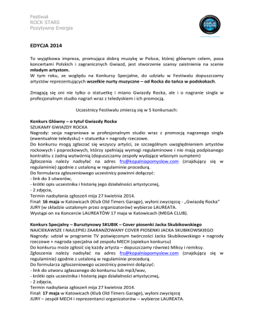 Festiwal ROCK STARS Pozytywna Energia EDYCJA 2014 To wyjątkowa impreza, promująca dobrą muzykę w Polsce, której głównym celem, poza koncertami Polskich i zagranicznych Gwiazd, jest stworzenie szansy zaistnienia na scenie młodym artystom. W tym roku, ze względu na Konkursy Specjalne, do udziału w Festiwalu dopuszczamy artystów reprezentujących wszelkie nurty muzyczne – od Rocka do tańca w podskokach. Zmagają się oni nie tylko o statuetkę i miano Gwiazdy Rocka, ale i o nagranie singla w profesjonalnym studio nagrań wraz z teledyskiem i ich promocją. Uczestnicy Festiwalu zmierzą się w 5 konkursach: Konkurs Główny – o tytuł Gwiazdy Rocka SZUKAMY GWIAZDY ROCKA Nagrody: sesja nagraniowa w profesjonalnym studio wraz z promocją nagranego singla (ewentualnie teledysku) + statuetka + nagrody rzeczowe. Do konkursu mogą zgłaszać się wszyscy artyści, ze szczególnym uwzględnieniem artystów rockowych i poprockowych, którzy spełniają wymogi regulaminowe i nie mają podpisanego kontraktu z żadną wytwórnią (dopuszczamy zespoły wydające własnym sumptem) Zgłoszenia należy nadsyłać na adres [email protected] (znajdujący się w regulaminie) zgodnie z ustaloną w regulaminie procedurą. Do formularza zgłoszeniowego uczestnicy powinni dołączyć: - link do 3 utworów, - krótki opis uczestnika i historię jego działalności artystycznej, - 2 zdjęcia, Termin nadsyłania zgłoszeń mija 27 kwietnia 2014. Finał: 16 maja w Katowicach (Klub Old Timers Garage), wyłoni zwycięzcę - „Gwiazdę Rocka” JURY (w składzie ustalonym przez organizatorów) wybierze LAUREATA. Wystąpi on na Koncercie LAUREATÓW 17 maja w Katowicach (MEGA CLUB). Konkurs Specjalny – Bursztynowy SKUBIK – Cover piosenki Jacka Skubikowskiego NAJCIEKAWSZE I NAJLEPIEJ ZAARANŻOWANY COVER PIOSENKI JACKA SKUBIKOWSKIEGO Nagrody: udział w programie TV poświęconym twórczości Jacka Skubikowskiego + nagrody rzeczowe + nagroda specjalna od zespołu MECH (opiekun konkursu) Do konkursu może zgłosić się każdy artysta – dopuszczamy również Miksy i remiksy. Zgłoszenia należy nadsyłać na adres [email protected] (znajdujący się w regulaminie) zgodnie z ustaloną w regulaminie procedurą. Do formularza zgłoszeniowego uczestnicy powinni dołączyć: - link do utworu zgłaszanego do konkursu lub mp3/wav, - krótki opis uczestnika i historię jego działalności artystycznej, - 2 zdjęcia, Termin nadsyłania zgłoszeń mija 27 kwietnia 2014. Finał: 17 maja w Katowicach (Klub Old Timers Garage), wyłoni zwycięzcę JURY – zespół MECH i reprezentanci organizatorów – wybierze LAUREATA. Festiwal ROCK STARS Pozytywna Energia Konkurs Specjalny – Hit na lato SZUKAMY PRZEBOJU NACHODZĄCEGO LATA Nagrody: promocja utworu jako hitu na lato + nagrody rzeczowe + udział w koncercie laureatów + nagroda specjalna od sponsora i partnera konkursu. Do konkursu może zgłosić się każdy artysta. Zgłoszenia należy nadsyłać na adres [email protected] (znajdujący się w regulaminie) zgodnie z ustaloną w regulaminie procedurą. Do formularza zgłoszeniowego uczestnicy powinni dołączyć: - link do utworu zgłaszanego do konkursu lub mp3/wav, - krótki opis uczestnika i historię jego działalności artystycznej, - 2 zdjęcia, Termin nadsyłania zgłoszeń mija 27 kwietnia 2014. Finał: 17 maja w Katowicach (ul. Mariacka), poznamy zwycięzcę + wybranych 5 zespołów. LAUREATA wybiorą widzowie/słuchacze/internauci na stronach FRS do głosowania. Konkurs Specjalny – Piosenka/ballada o miłości SZUKAMY NAJLEPSZEJ PIOSENKI O MIŁOŚCI NA 2014 ROK Nagrody: promocja utworu jako piosenki o miłości + nagrody rzeczowe + udział w koncercie laureatów + nagroda specjalna od sponsora i partnera konkursu. Do konkursu może zgłosić się każdy artysta. Zgłoszenia należy nadsyłać na adres [email protected] (znajdujący się w regulaminie) zgodnie z ustaloną w regulaminie procedurą. Do formularza zgłoszeniowego uczestnicy powinni dołączyć: - link do utworu zgłaszanego do konkursu lub mp3/wav, - krótki opis uczestnika i historię jego działalności artystycznej, - 2 zdjęcia, Termin nadsyłania zgłoszeń mija 27 kwietnia 2014. Finał: 15 maja w Katowicach (ulica Mariacka), poznamy zwycięzcę + wybranych 5 zespołów. LAUREATA wybiorą widzowie/słuchacze/internauci na stronach FRS do głosowania. Konkurs Specjalny – Fest Przebój SZUKAMY SKOCZNEGO PRZEBOJU BEER FESTU Nagrody: promocja oraz występ na imprezie sponsora (BEER FEST) + nagrody rzeczowe + udział w koncercie laureatów + nagroda specjalna od sponsora i partnera konkursu. Do konkursu może zgłosić się każdy artysta. Zgłoszenia należy nadsyłać na adres [email protected] (znajdujący się w regulaminie) zgodnie z ustaloną w regulaminie procedurą. Do formularza zgłoszeniowego uczestnicy powinni dołączyć: - link do utworu zgłaszanego do konkursu lub mp3/wav, - krótki opis uczestnika i historię jego działalności artystycznej, - 2 zdjęcia, Termin nadsyłania zgłoszeń mija 27 kwietnia 2014. Finał: 17 maja w Katowicach (ul. Mariacka), poznamy zwycięzcę + wybranych 5 zespołów. LAUREATA wybiorą widzowie/słuchacze/internauci na stronach FRS do głosowania. Festiwal ROCK STARS Pozytywna Energia Ponadto dla widzów, słuchaczy i fanów dobrej muzyki przygotowaliśmy: Konkurs Air Guitar Dla każdego, kto potrafi się dobrze bawić, konkurs widowiskowej gry na gitarze – BEZ GITARY Nagrody: rzeczowe + nagroda specjalna od sponsora i partnera konkursu. Warsztaty Muzyczne Dla każdego, kto chce się nauczyć grać na wybranym instrumencie, z możliwością spróbowania i przetestowania wybranych modeli – POD OKIEM SPECJALISTÓW. Goście, Gwiazdy, Jubilaci oraz Gospodarze Poza częścią konkursową, jak co roku, przygotowaliśmy kilka niespodzianek. Będą to: 15 lecie zespołu Czarno-Czarni (koncert z realizacją TV) 10 lecie reaktywacji zespołu MECH (koncert z realizacją TV) Gość zagraniczny to z