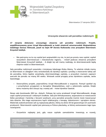 Skierniewice 17 sierpnia 2015 r Uroczyste otwarcie sali porodów rodzinnych 17 sierpnia dokonano uroczystego otwarcia sali porodów rodzinnych. Projekt, współfinansowany przez Urząd Marszałkowski w Łodzi otwierali wicemarszałek Województwa Łódzkiego Dariusz Klimczak, poseł na Sejm RP Dorota Rutkowska oraz prezydent Skierniewic Krzysztof Jażdżyk. – Nie patrzymy na to czy szpital jest wojewódzki czy nie, to jest po prostu nasz szpital, szpital wszystkich skierniewiczan i mieszkańców regionu. - mówił podczas otwarcia prezydent Skierniewic Krzysztof Jażdżyk. - A dzięki tej sali mamy nadzieję, że skierniewiczanki będą chętnie rodzić w Skierniewicach. Sala porodów rodzinnych powstała z inicjatywy lokalnego Klubu Mamy. To właśnie młode mamy ze Skierniewic w ubiegłym roku wnioskowały do dyrekcji szpitala z prośbą o stworzenie takiej sali do porodów, która będzie wizytówką skierniewickiego szpitala, a przyszłym mamom zapewni warunki do porodu na miarę XXI wieku. Wniosek został przyjęty przez dyrektora szpitala, Jacka Sawickiego. – Stworzyliśmy projekt, poprosiliśmy Urząd Marszałkowski o wsparcie. Pomysł spotkał się z przychylnym przyjęciem w Zarządzie Województwa, czyli u właściciela szpitala. Dzięki temu możemy dziś cieszyć się z nowej sali. - mówi dyrektor Sawicki. Nowa sala kosztowała 200 tys. złotych. Połowę tej sumy przekazał Urząd Marszałkowski, drugą część szpital przeznaczył z własnych środków. Sala jest klimatyzowana, wyposażona w nowoczesne łóżko porodowe i łazienkę z biczami wodnymi, przy porodzie przyszłej mamie może towarzyszyć tata dziecka. Dla niego wyznaczono kącik relaksacyjny z kanapą, telewizorem i sprzętem stereo. Materiały wykończeniowe sali są najwyższej jakości, którą na okres 50 lat gwarantuje ich austriacki producent. Skierniewicki szpital jest pierwszą w Polsce placówką, w której zastosowano tego typu rozwiązanie. – Oczywiście najlepiej jest, gdy nasze szpitale samodzielnie inwestują w rozwój, ale rzeczywistość jest inna i większość potrzebuje naszego wsparcia, bo potrzeby są ogromne. - mówił podczas otwarcia wicemarszałek Województwa Łódzkiego Dariusz Klimczak. - Ale ta piękna sala nie jest naszym ostatnim słowem. Niebawem przeznaczymy kolejne pół miliona złotych, tym razem na remont oddziału kardiologii i laryngologii. mówił marszałek. Pierwsze porody na sali porodów rodzinnych odbędą się już 1 września. Będą w niej się mógł odbywać wyłącznie porody fizjologiczne, a każda rodząca pacjentka będzie na życzenie dysponować znieczuleniem okołoporodowym. Oprócz nowej sali nadal funkcjonuje sala porodów ogólnych. Szpital już planuje przeprowadzenie tam remontu i dobudowanie drugiej sali porodów rodzinnych. – Mamy nadzieję, że odwróci to niekorzystny trend uciekania przyszłych mam do szpitali w Łodzi czy Warszawie. Jeśli chodzi o porody to nie ma rejonizacji i każda z pań może rodzić w dowolnym szpitalu. Nasza placówka może teraz skutecznie konkurować z najlepszymi ośrodkami w dużych miastach, a więc zapraszamy przyszłe mamy, również spoza Skierniewic, do nas. - mówi dyrektor szpitala Jacek Sawicki. Kontakt dla mediów: Paweł Bruger Rzecznik Prasowy Wojewódzkiego Szpitala Zespolonego im. St. Rybickiego w Skierniewicach tel. 885 705 500 mail. [email protected]